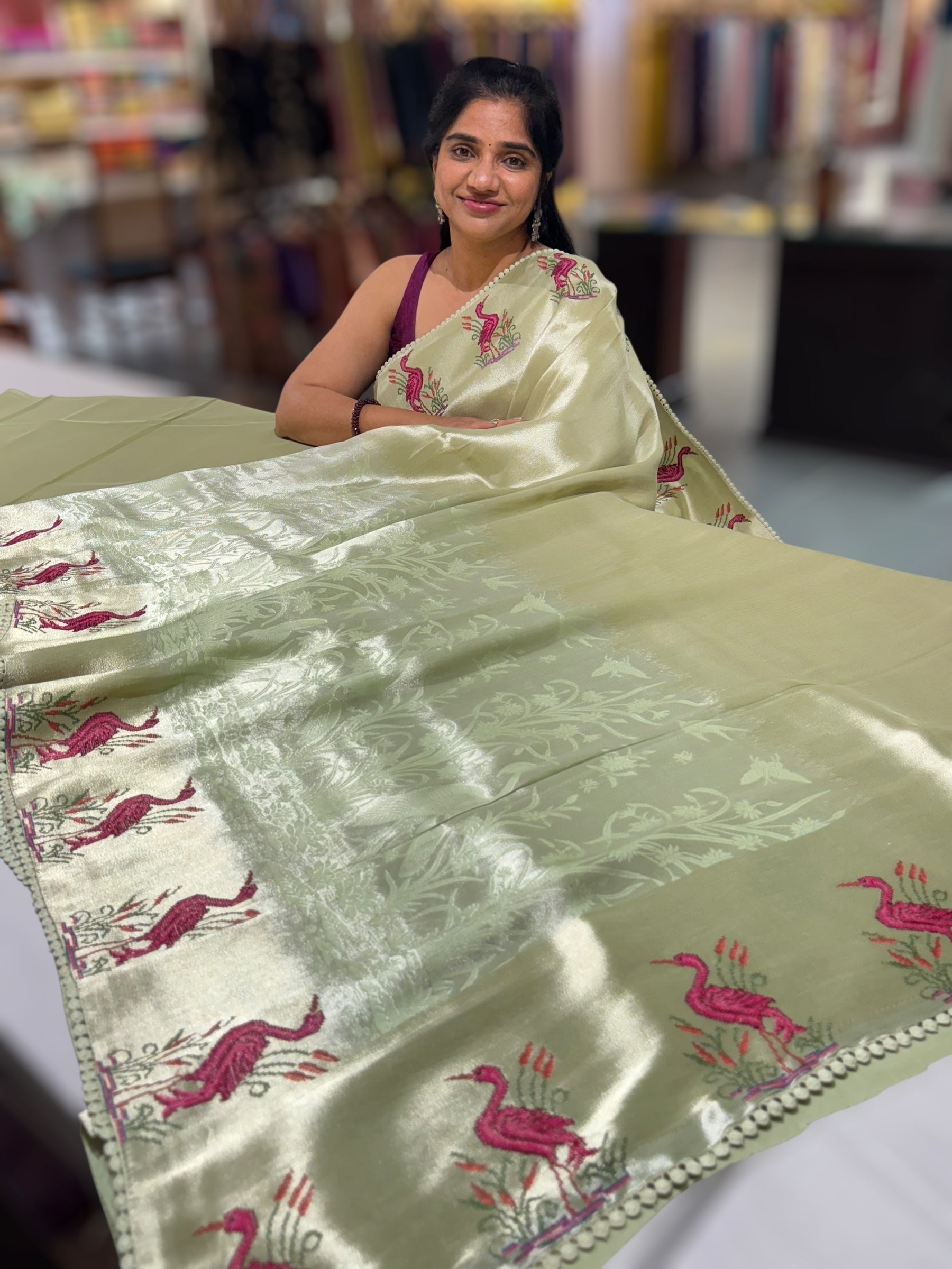 Mint Green Banarasi Brocade Tissue Saree featuring elegant tonchui-style weaving and a stunning petite point embroidered swans on the border, delicately hemlined with crochet lace.