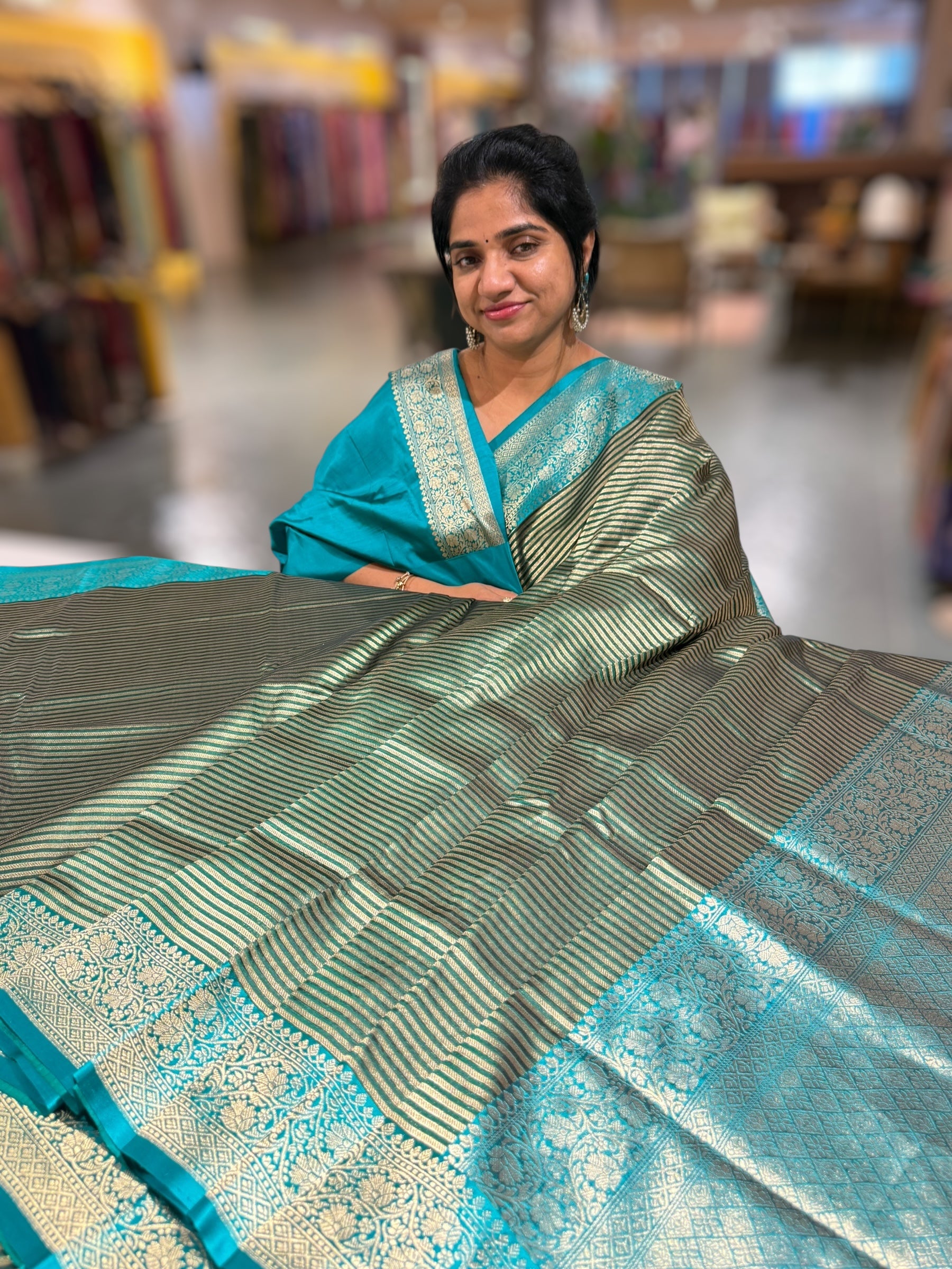 Emerald Green Banarasi Silk Saree With Stripes body and Teal Mashru Satin Border with beautiful weaving .