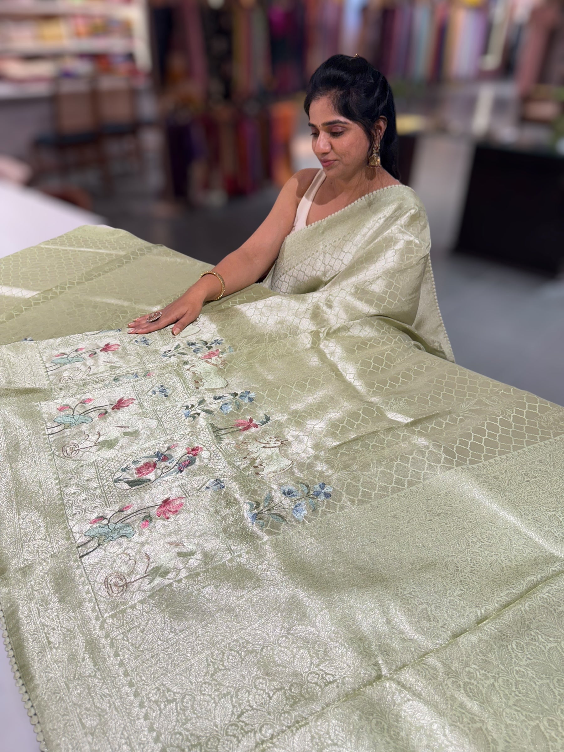 • Seagreen Fancy Banarasi Tonchoi style saree with embroidery