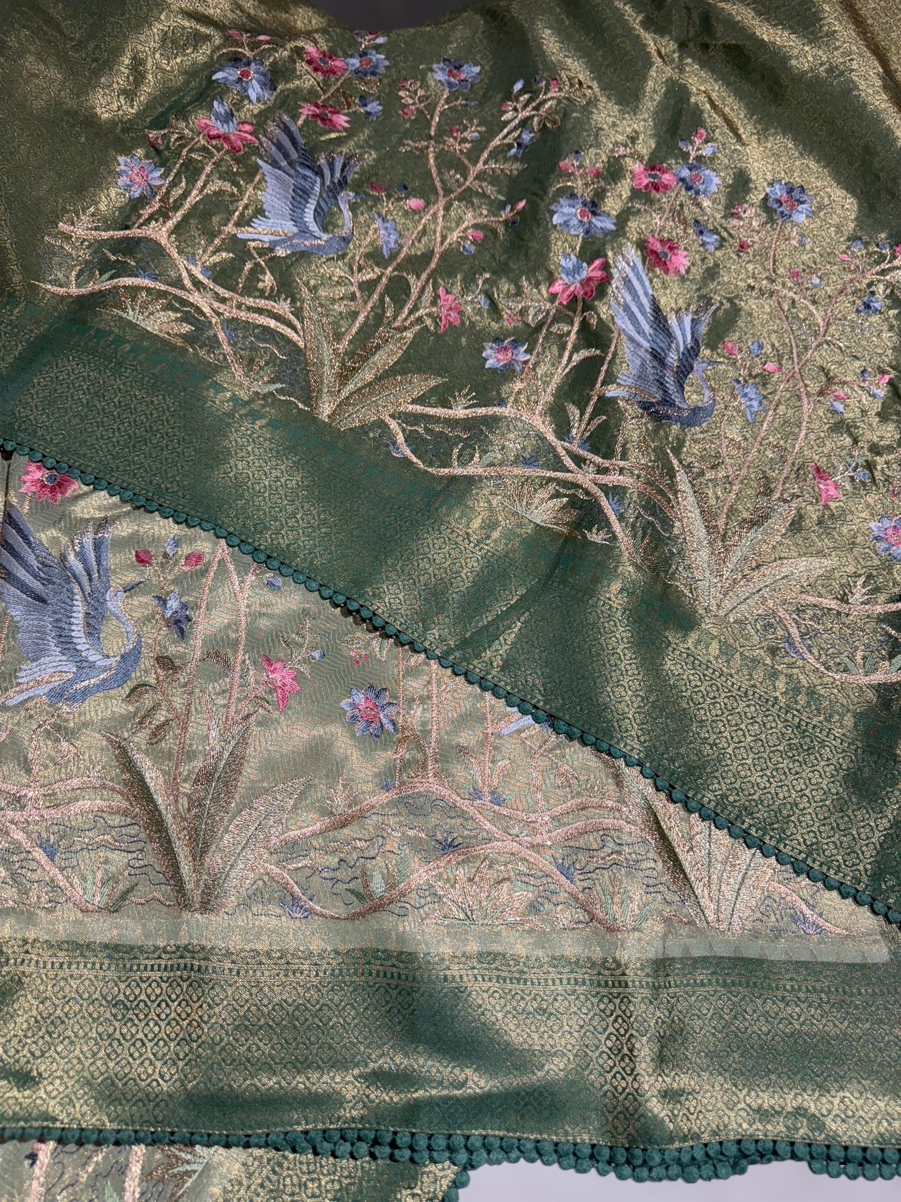 Sage Green banarasi Broacde Tissue saree with dark green borders adorned with embroidered skirt border with swans and floral creepers