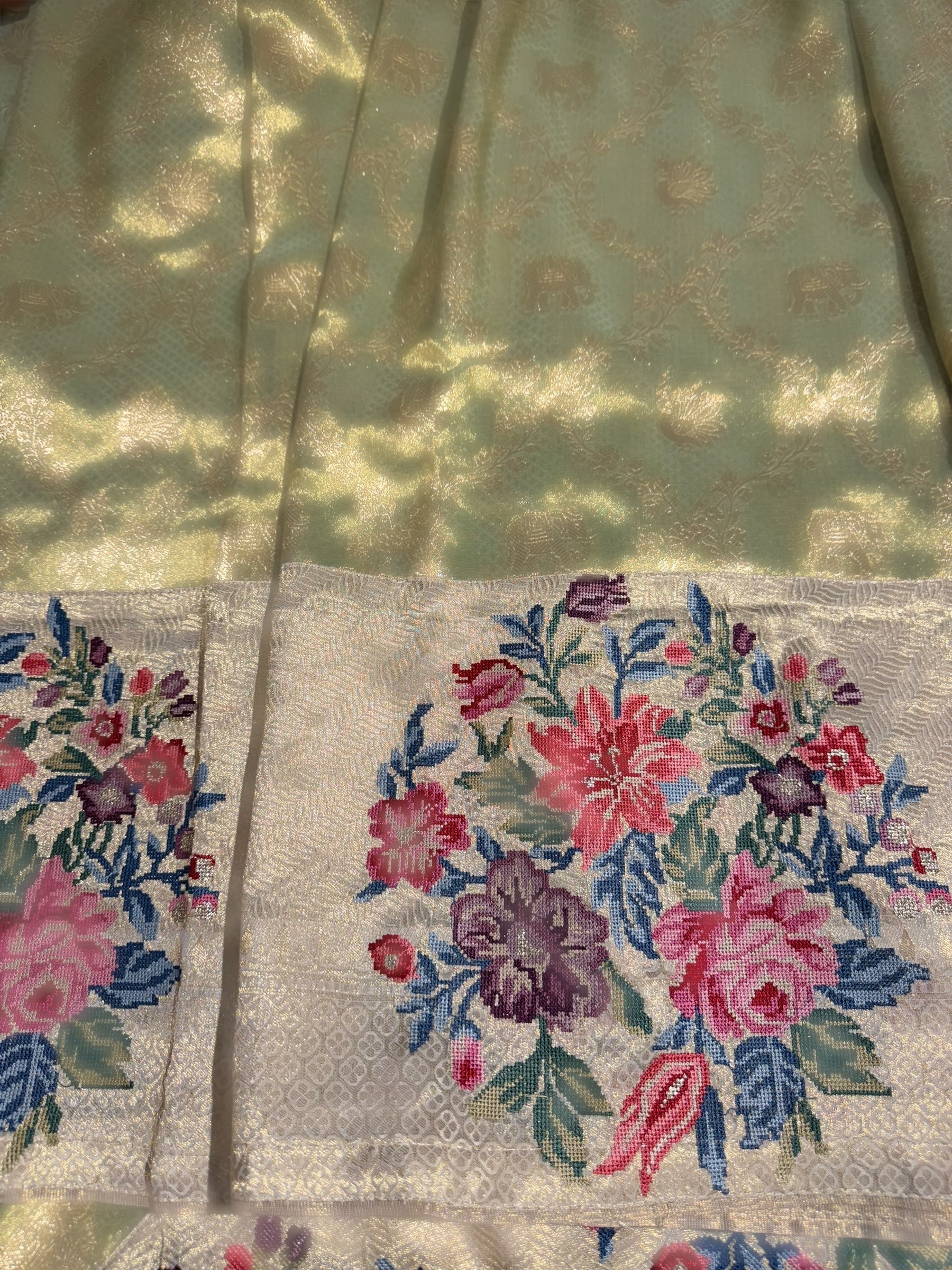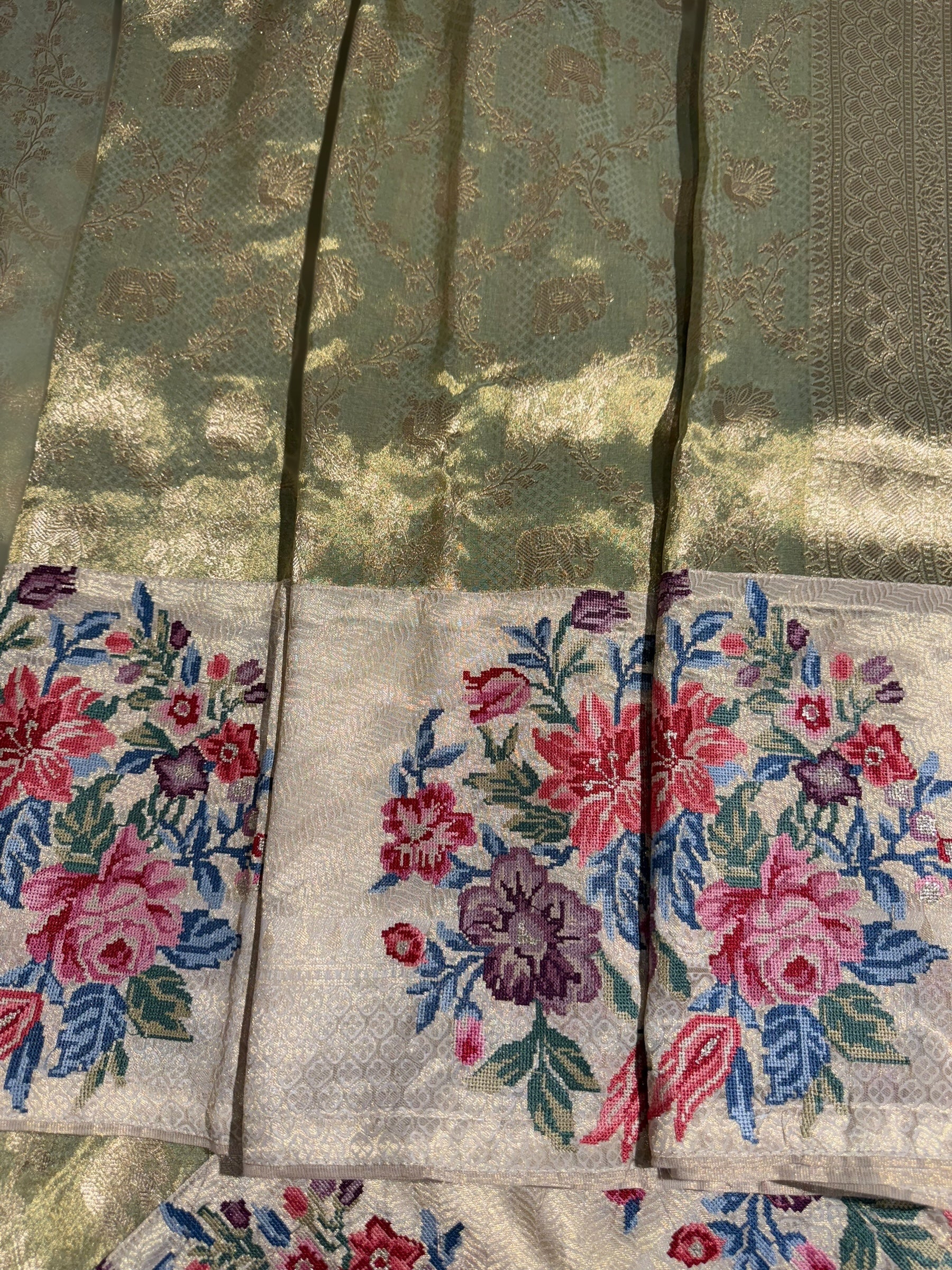 Mint Green banarasi brocade Tissue saree with contrast ivory brocade border adorned with beautiful petite point embroidered flower bunches . Blouse is tissue with borders
