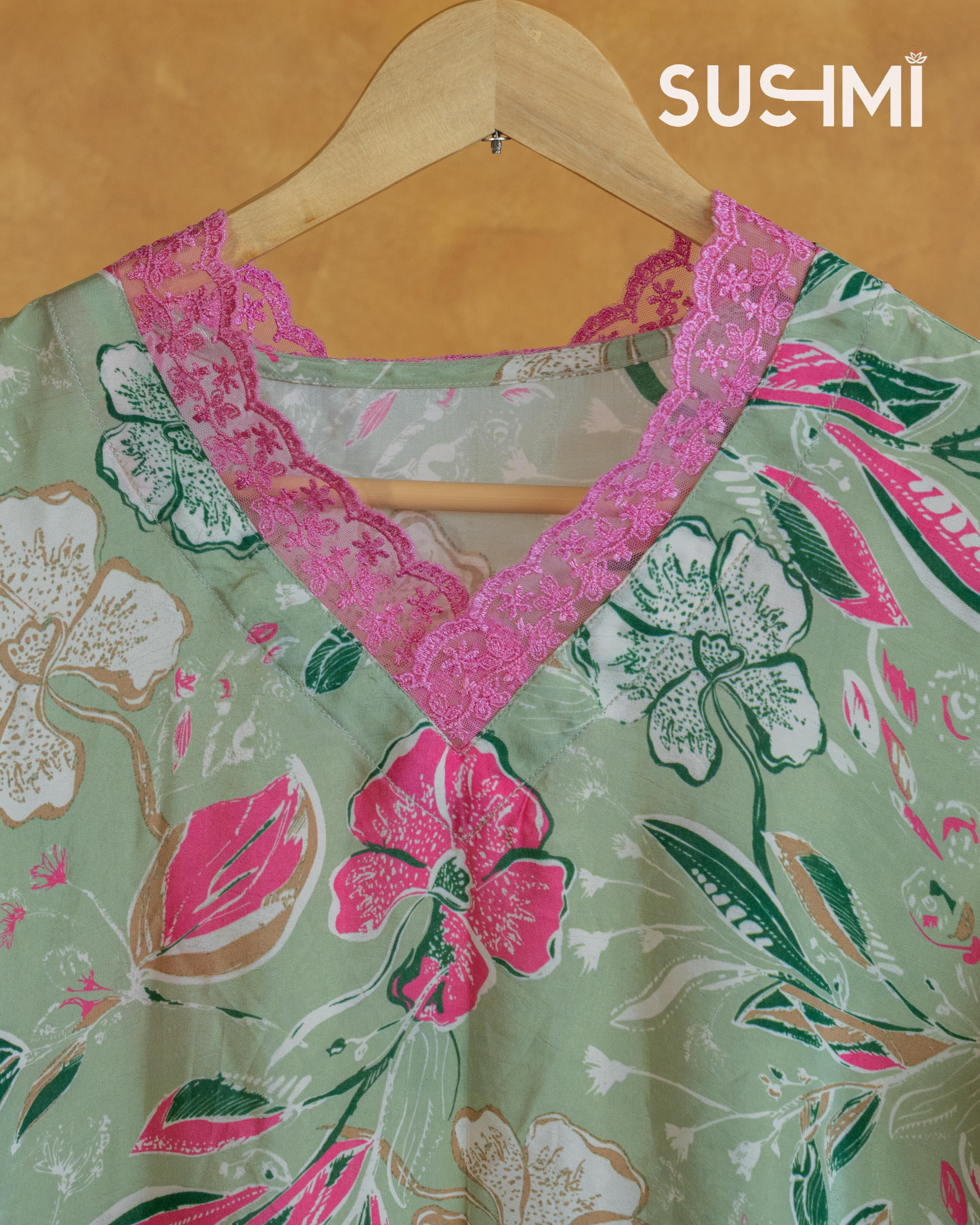 • Floral printed coordset with lace hemline for neck and sleeves .Bottom is also p