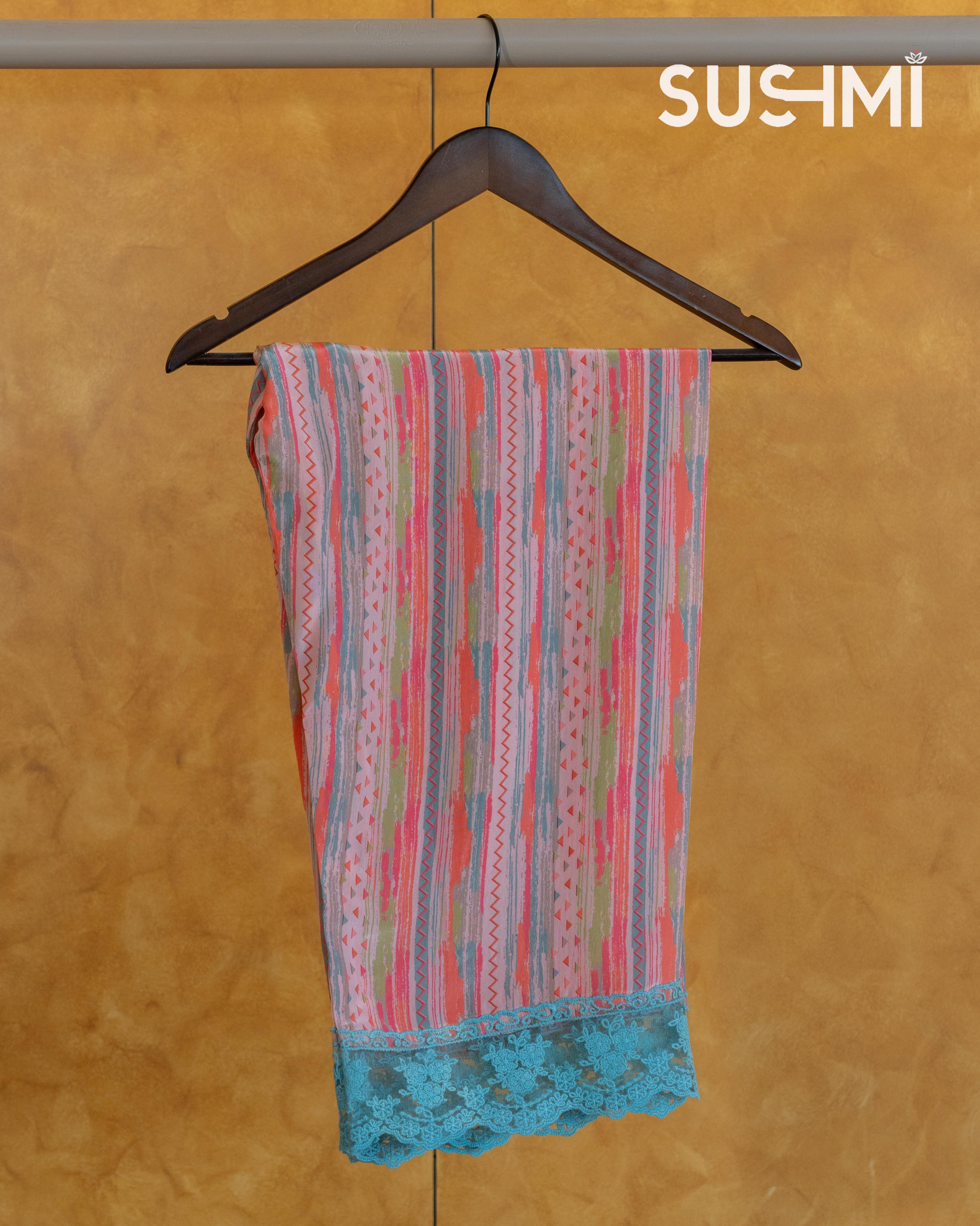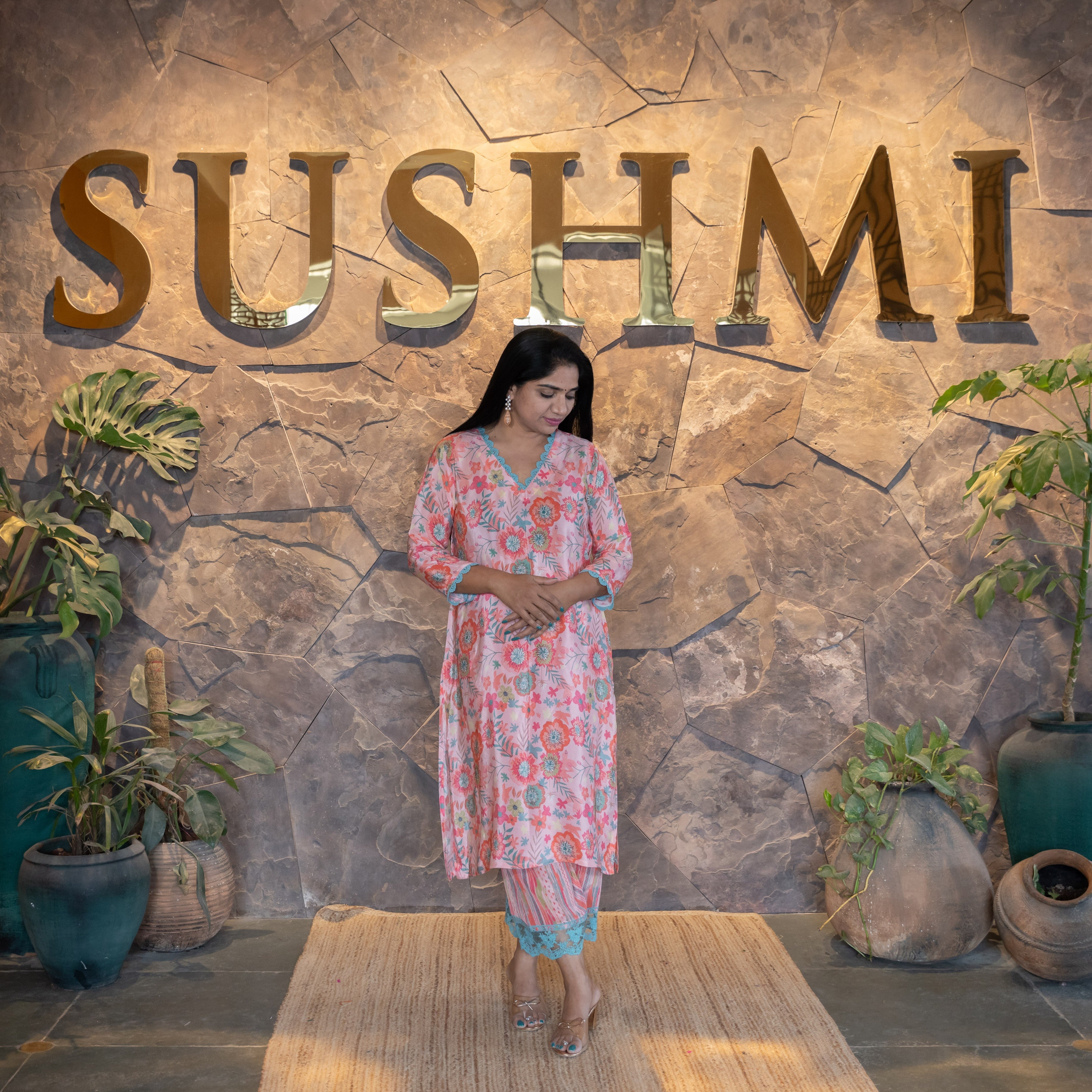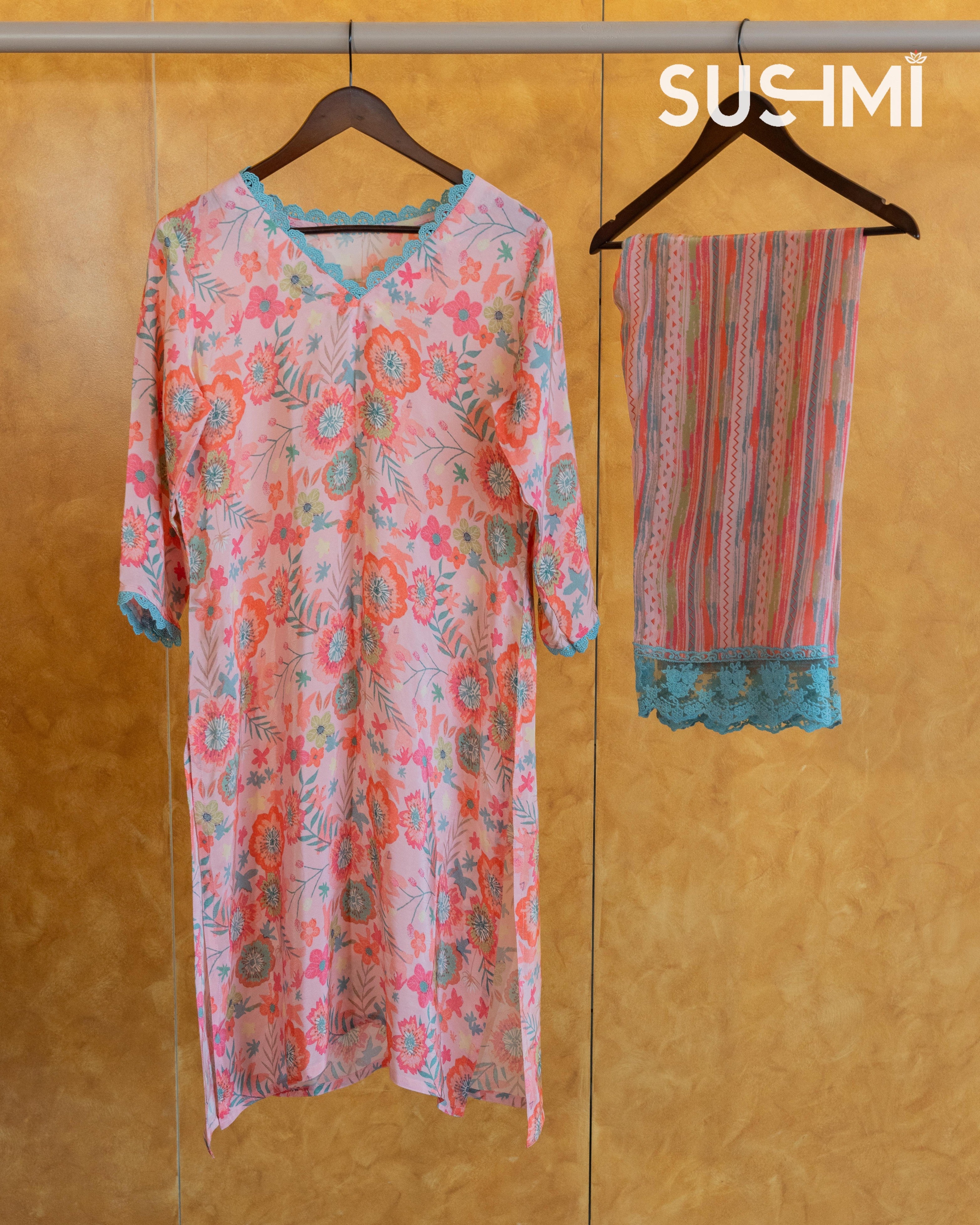 Floral printed coordset with lace hemline for neck and sleeves .Bottom is also printed with crotia lace hemline