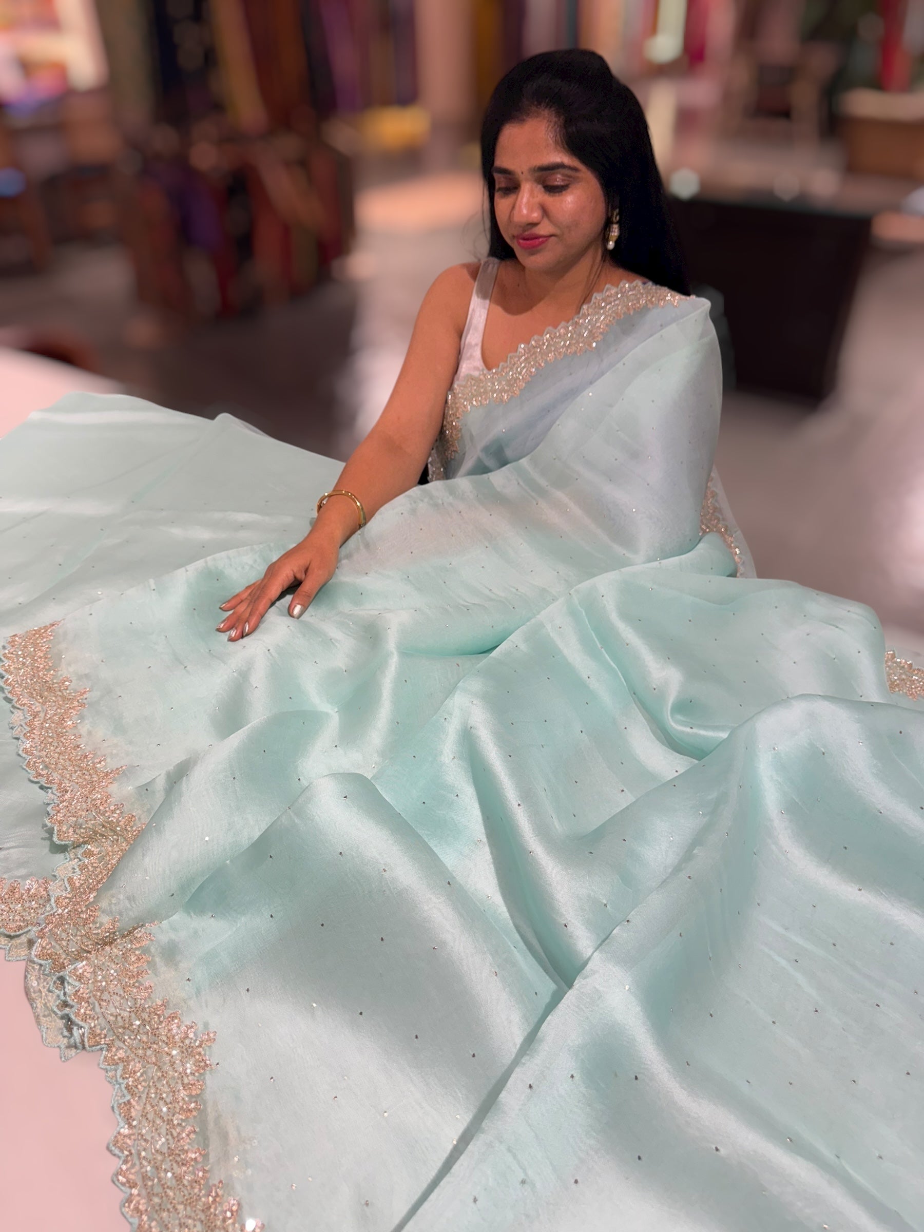 Pure Organza saree featuring allover hand–done Mukaish work that lends a subtle festive shimmer. The saree is beautifully hemlined with an intricate scalloped hand–crafted cutwork border, embellished with sequins, cutdana and pearls for a delicate yet statement finish.