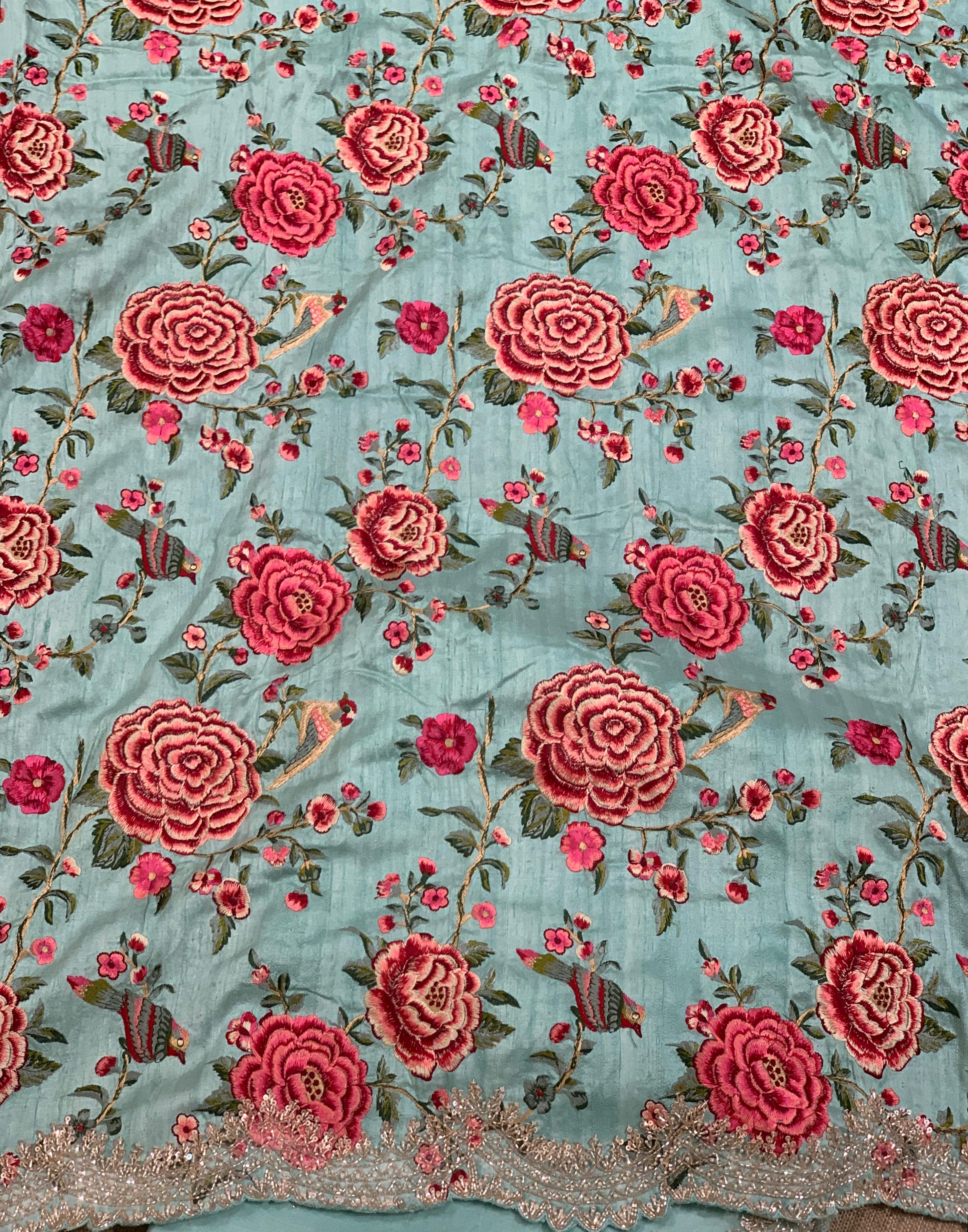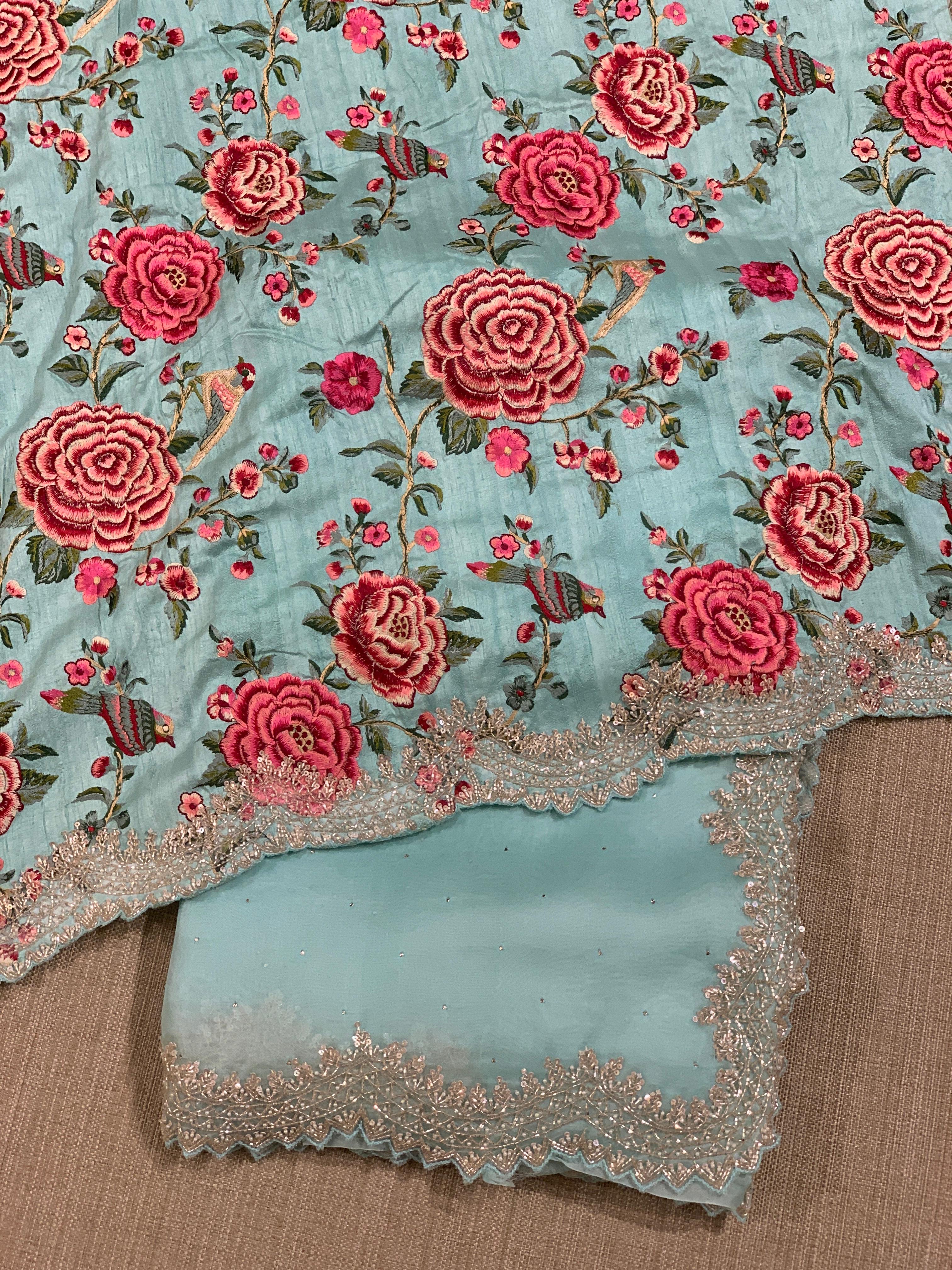 The blouse is a true value addition, adorned with stunning allover floral creeper embroidery accented with tiny birds, and finished with a matching handwork border to perfectly complement the saree. A timeless, graceful pick for those who love understated luxury with detailed craftsmanship