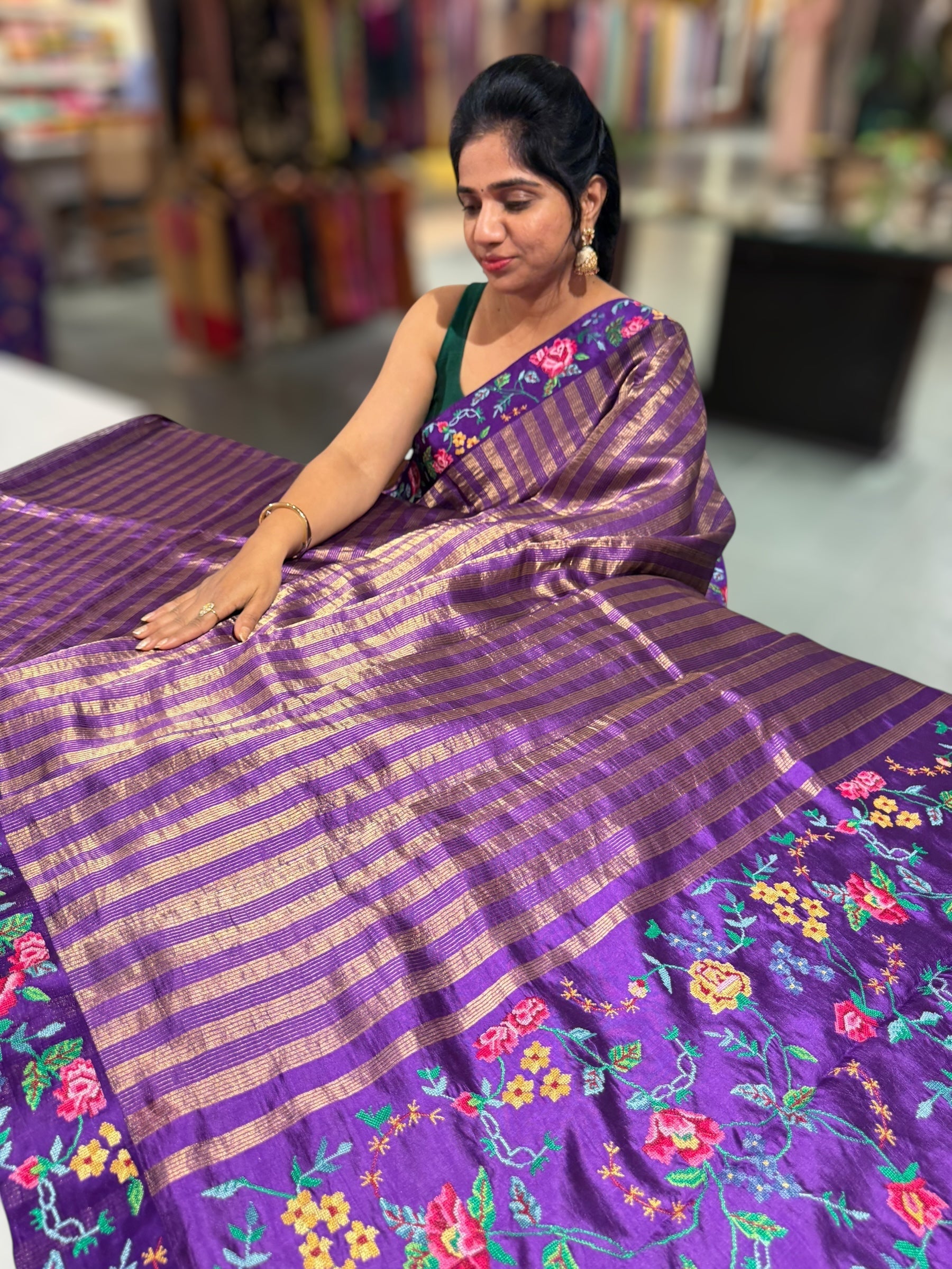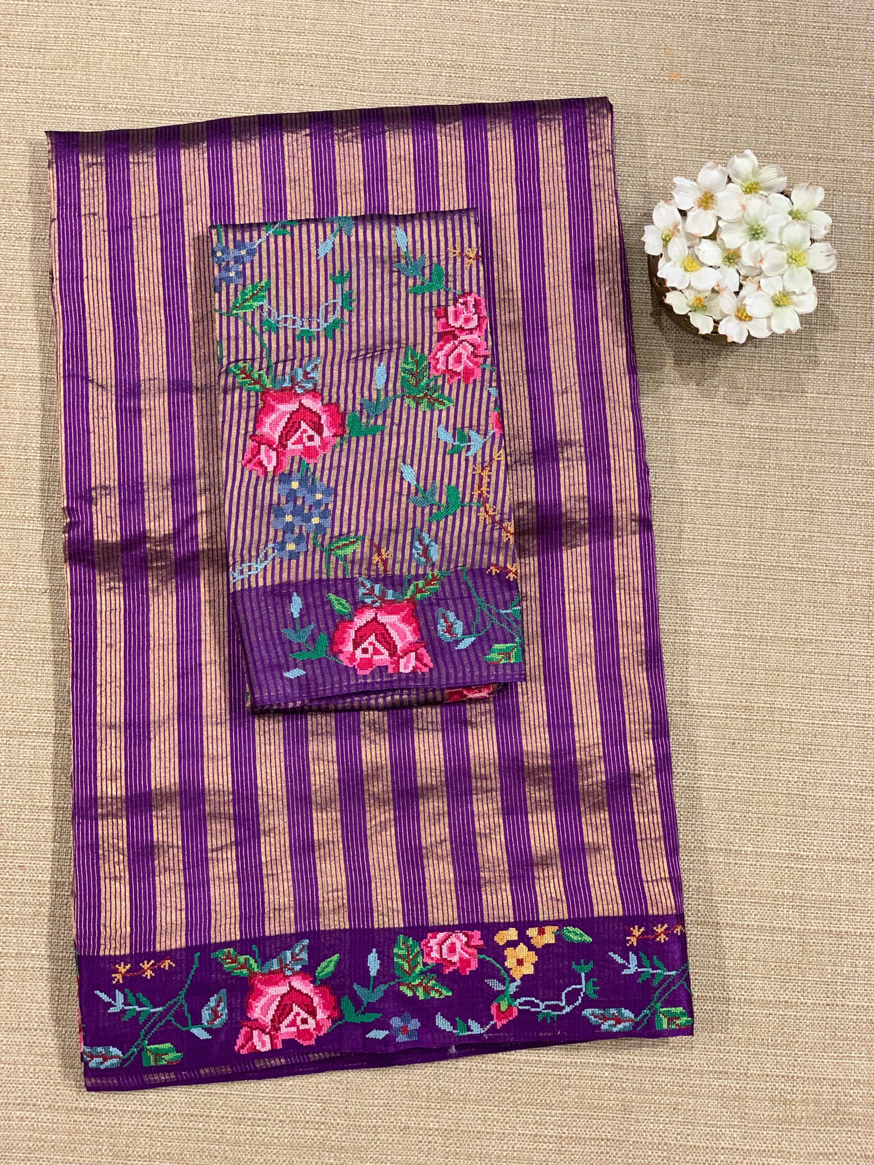 Designer Banarasi silk Tissue stripes Saree with petite point embroidered mashru border and pallu . Blouse is pure Mashru satin with allover petite point embroidery with flowers and butterflies.