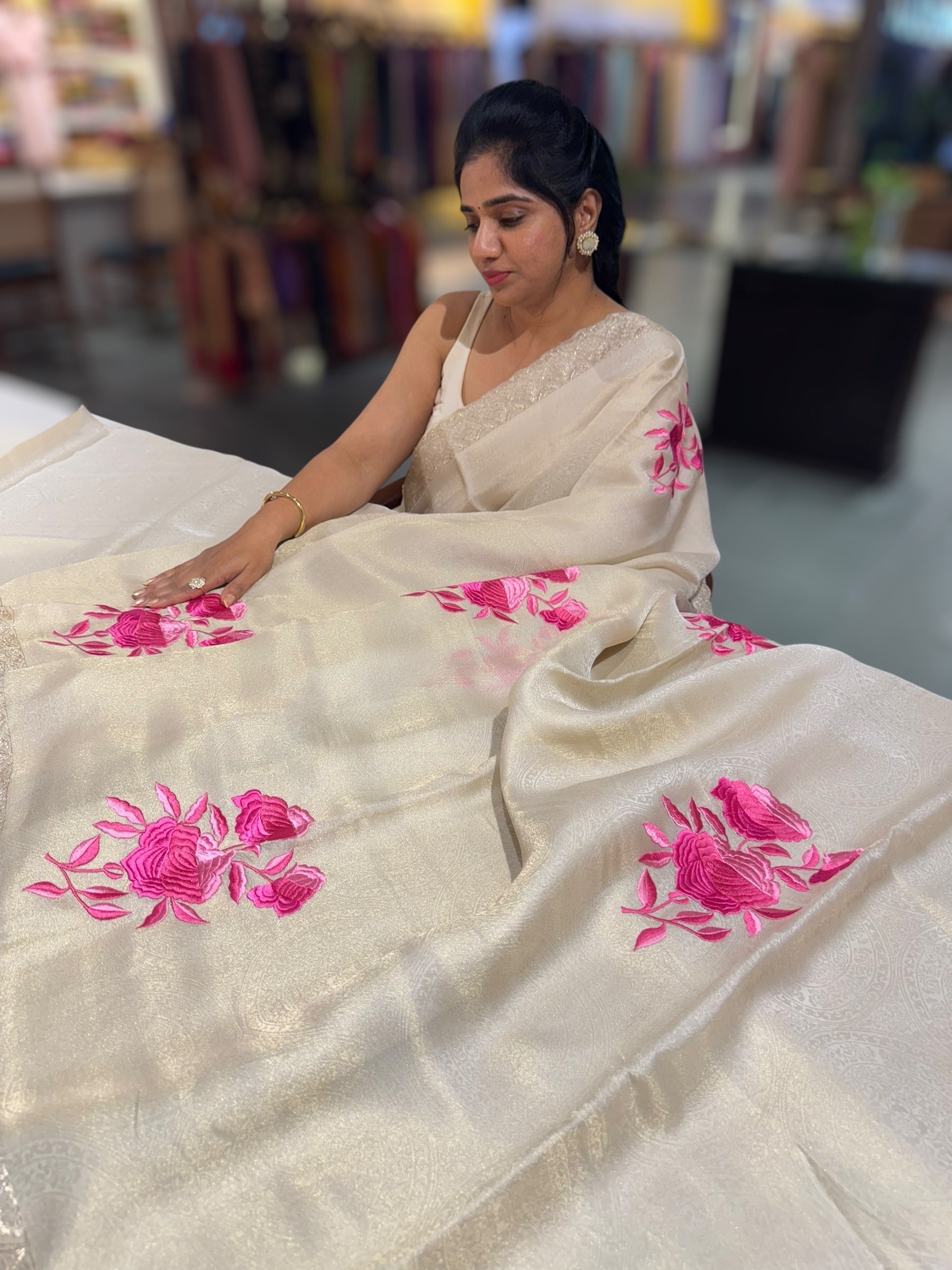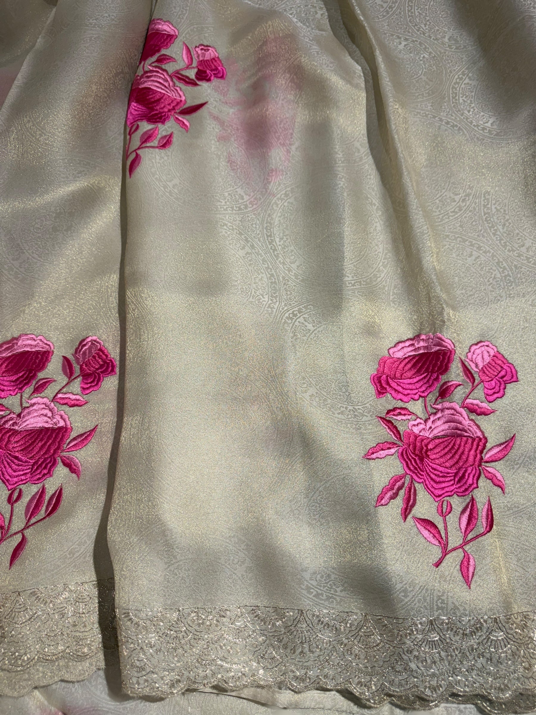 Ivory Banarasi brocade Tissue Saree with pink parsi gara embroidered flower bunch motifs hemlined with tripple scallop pita embroidered border .