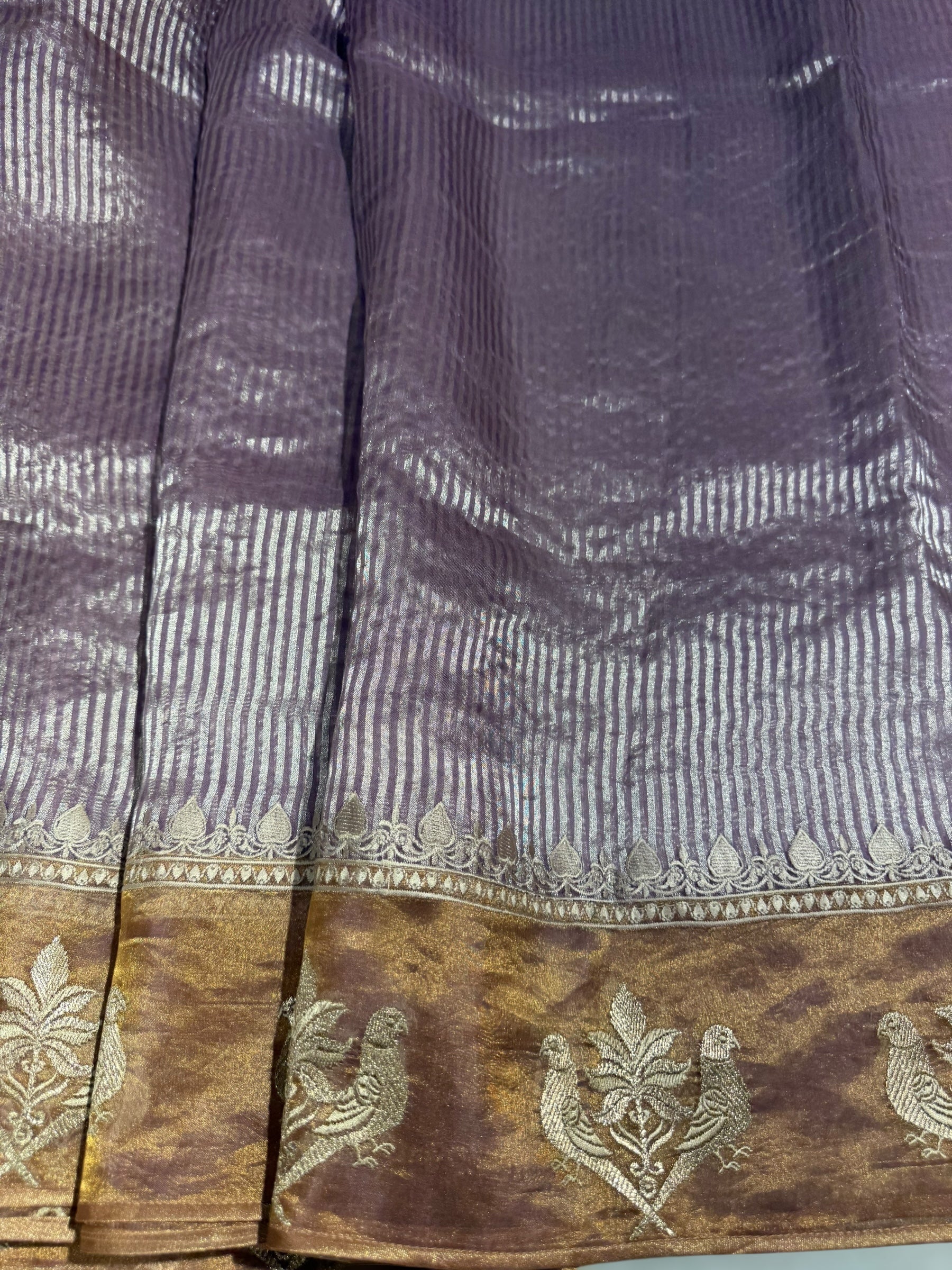 Kora silver tissue stripes Saree with double parrot embroidered tissue border paired with tissue allover petite point embroidered blouse .