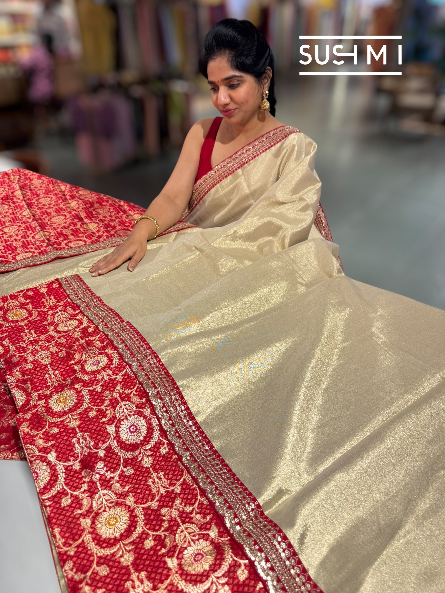 Muted Gold Banarasi Tissue Saree adorned with rich red-toned pure Banarasi brocade silk jaal woven skirt borders, intricately woven with traditional meenakari. The saree is further highlighted with Sabyasachi-inspired borders.