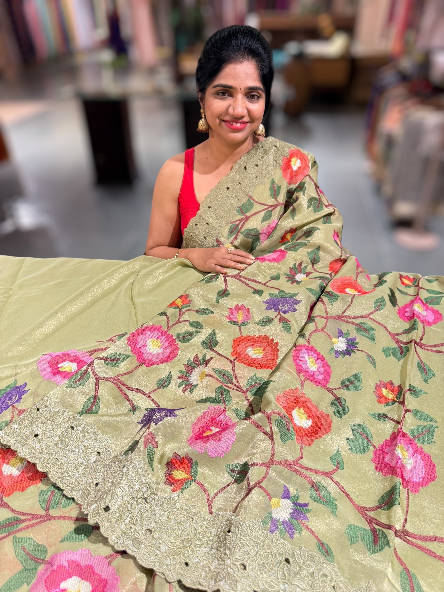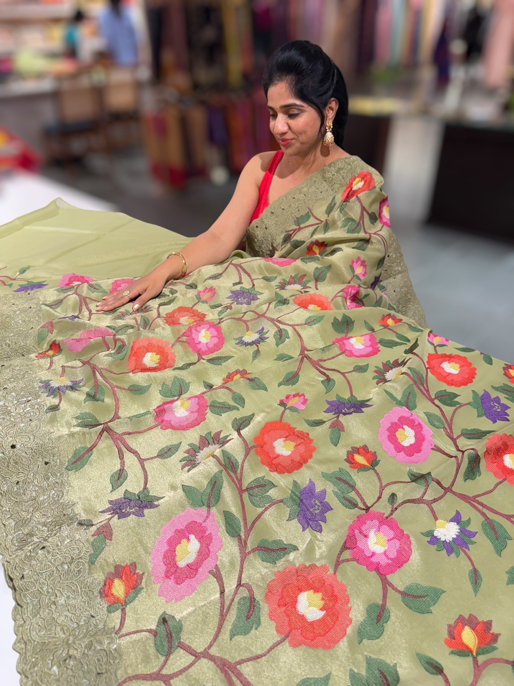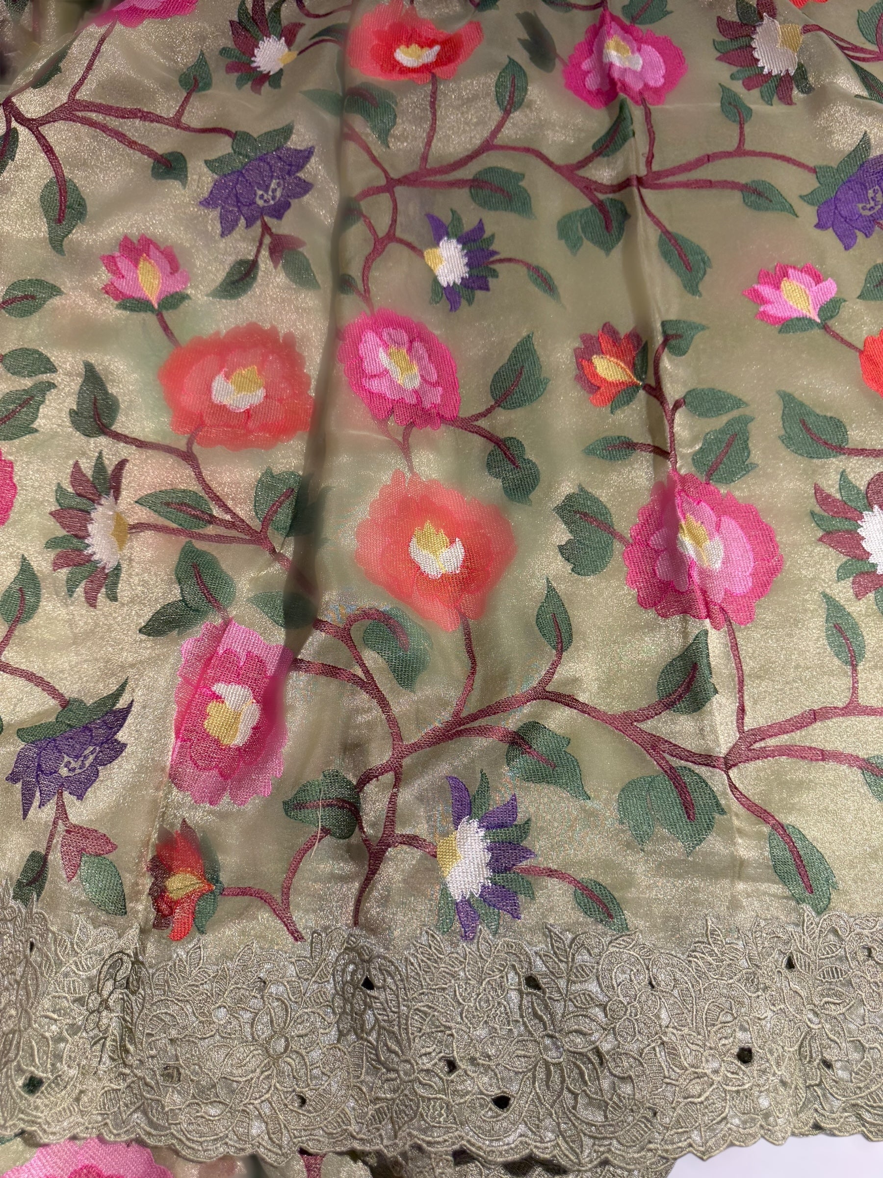 Nude Pink tissue Gorgette with allover jamdani inspired embroidery and hemlined withtiasue cutwork floral border .