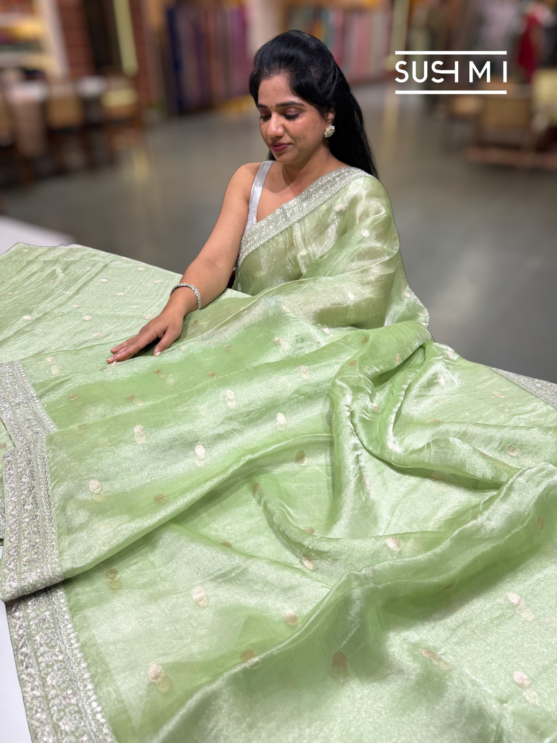 Apple green pure handloom Banarasi tissue saree adorned with water-gold zari polka dot weaving throughout the body. The saree is beautifully hemlined with Sabyasachi-inspired borders featuring delicate silver zari puta embroidery, adding a refined touch of elegance.