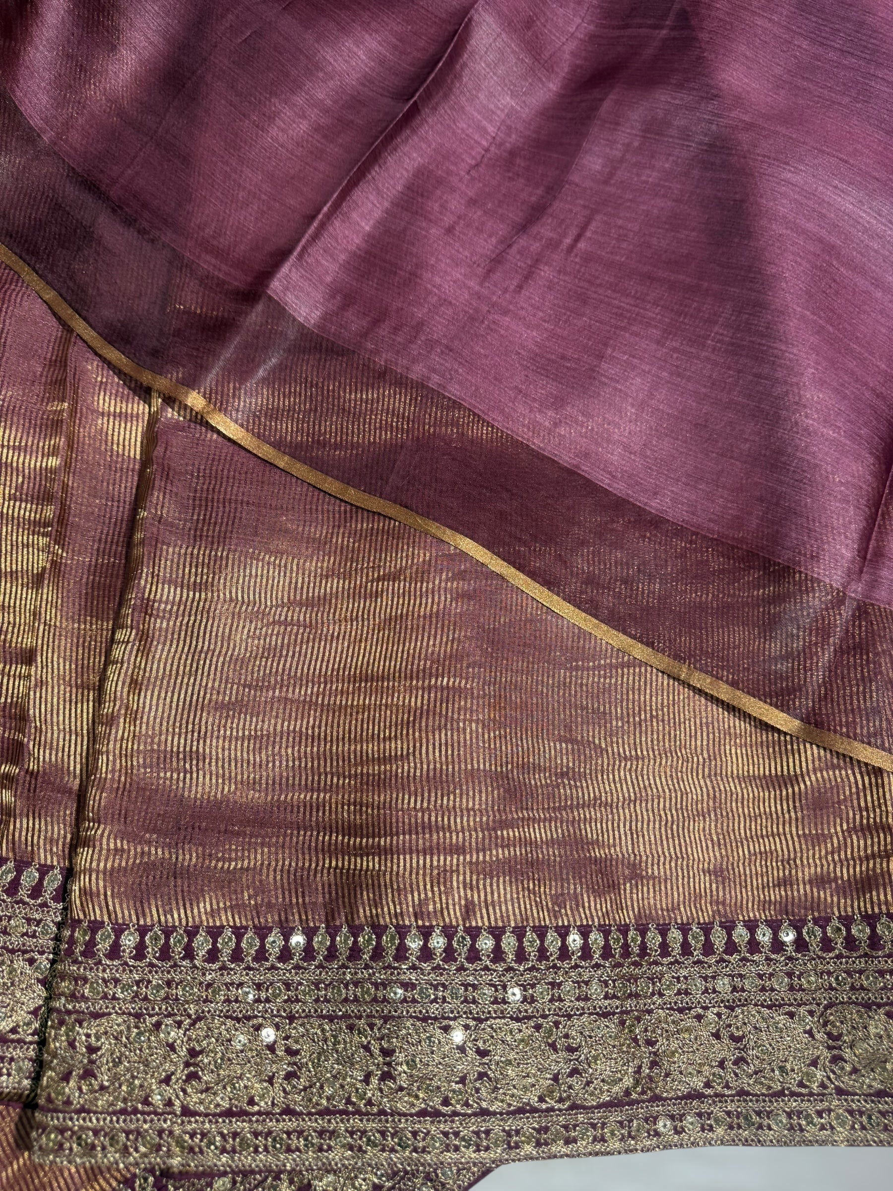 Pure handloom Kora Muslin Tissue stripes saree with a plain muslin pallu, elegantly hemlined with heavy Sabyasachi-inspired borders.