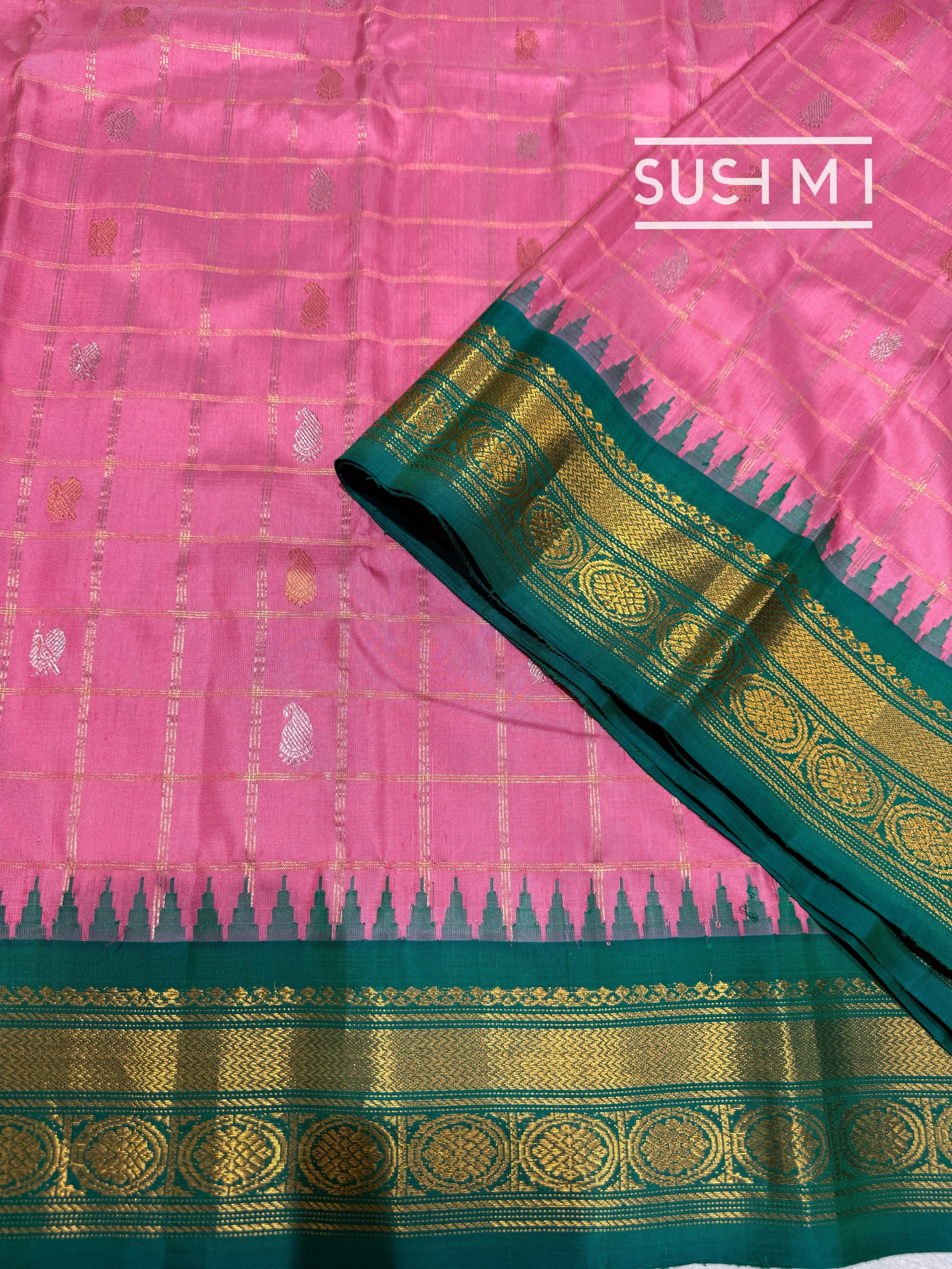 Coral pink vintage big checks Gadwal silk saree paired with beautiful teal borders. The body features classic large checks adorned with intricate peacock and mango motifs woven all over in silver and golden zari, giving it a rich traditional appeal.