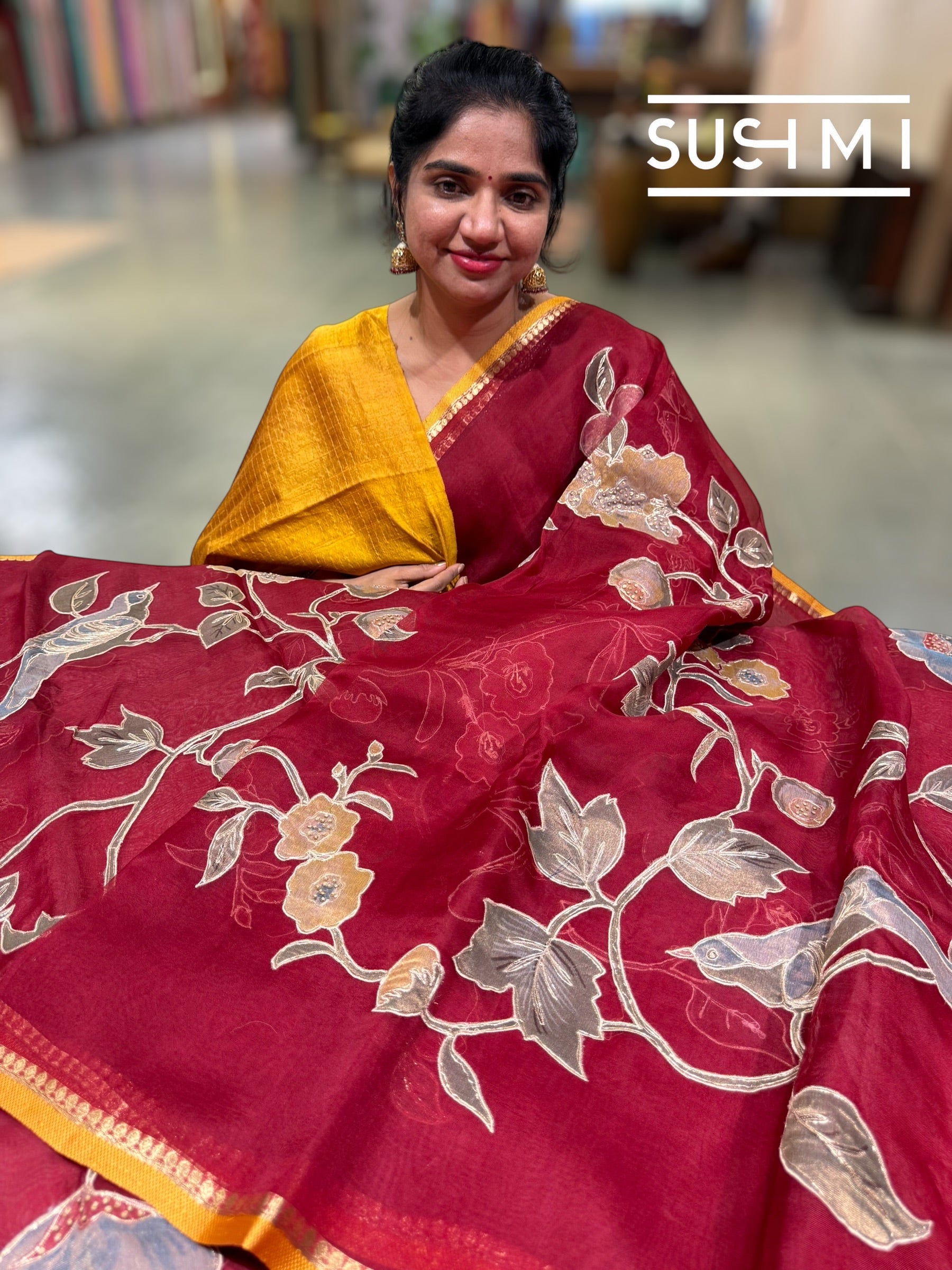 The saree is adorned with stunning statement floral creeper and birds tissue appliqué spread beautifully across the body. Each appliqué motif is enhanced with intricate pita outline embroidery and fine hand knot work, giving the saree a distinctive, designer, and truly unique appeal.
