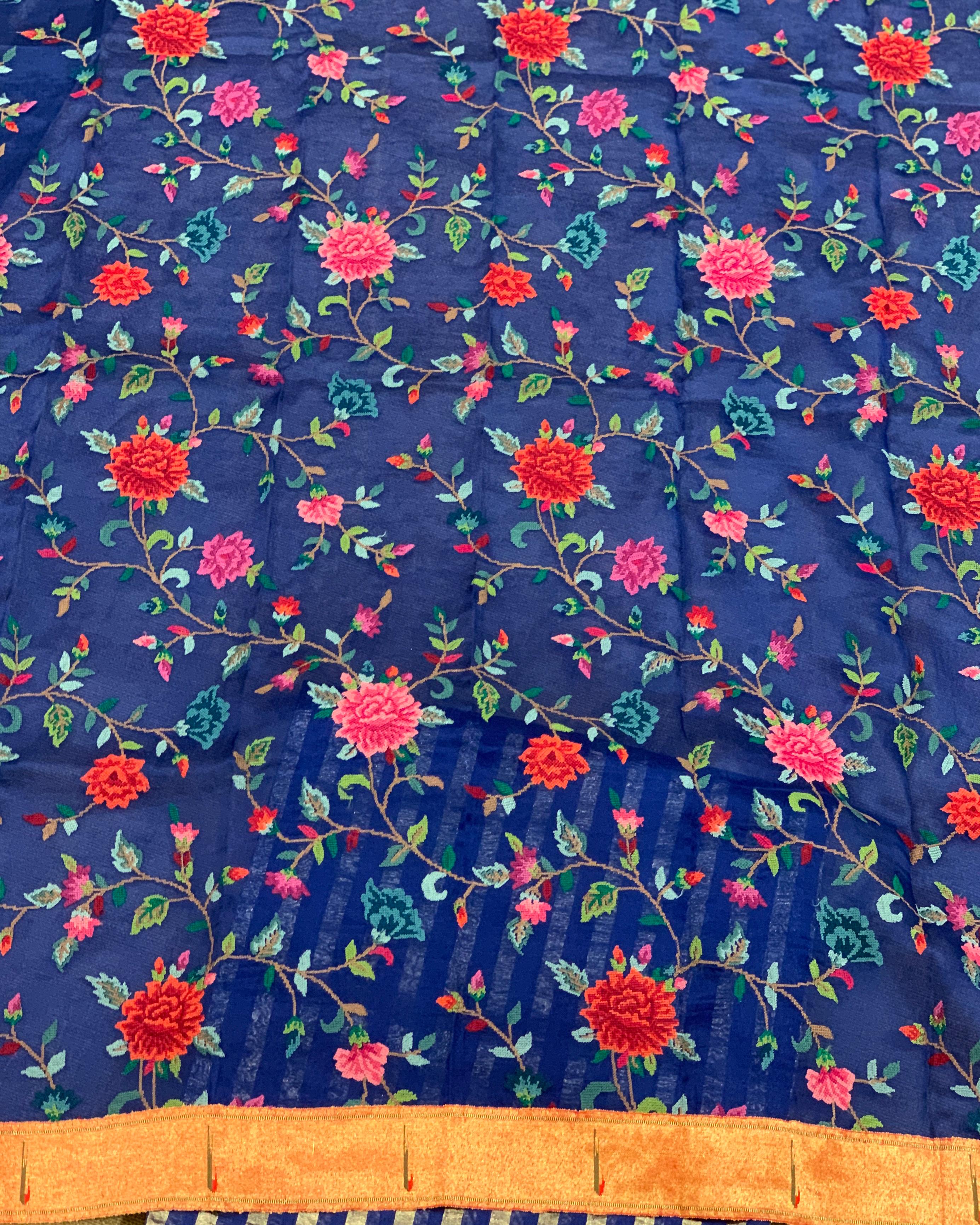 The saree is paired with a sheer organza blouse adorned with all-over petite point embroidery, finished with a pure handloom Paithani single muniya tissue border, adding a subtle yet regal touch to the ensemble.