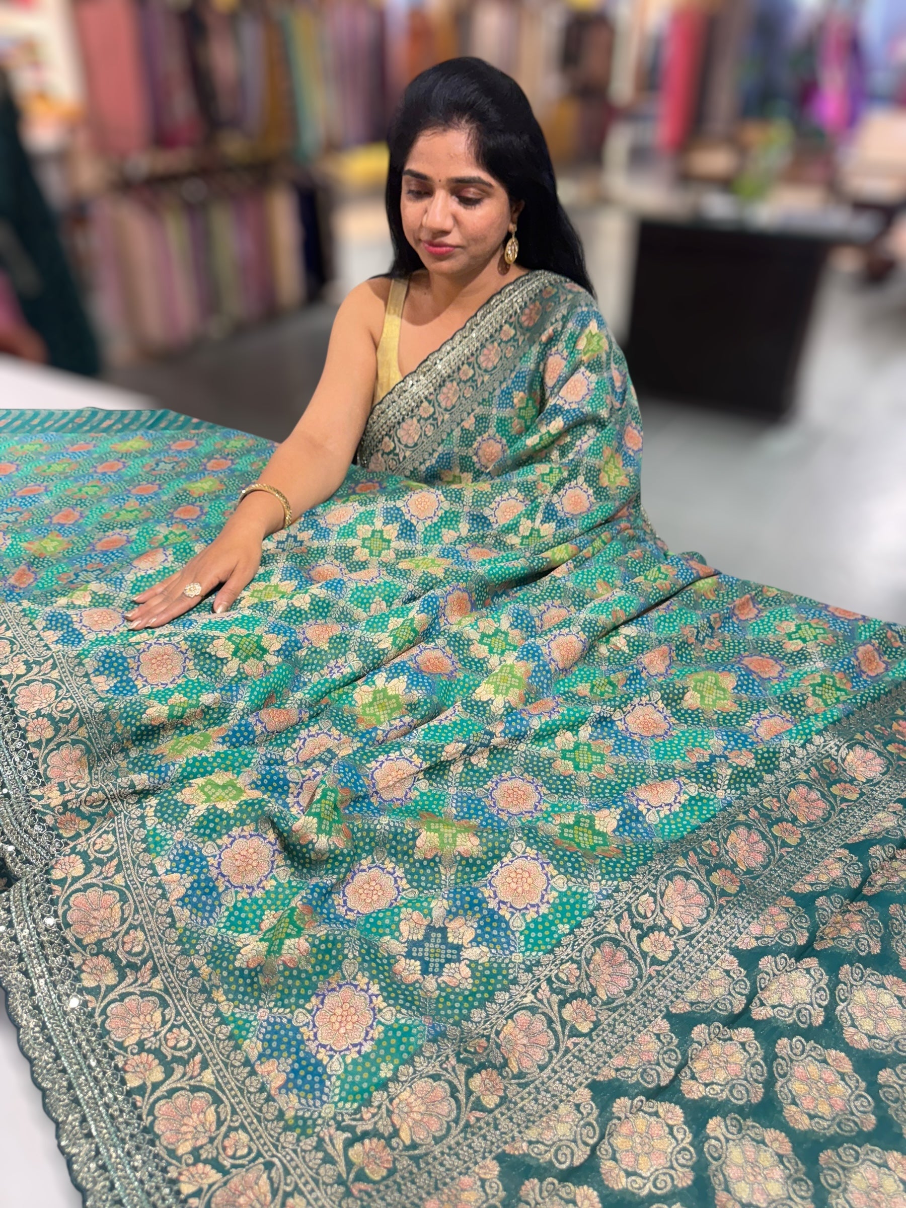 An exquisite Banarasi georgette saree featuring delicate meenakari floral creeper with bandhini, beautifully complemented by rich Sabyasachi-inspired statement borders that add regal charm and depth.