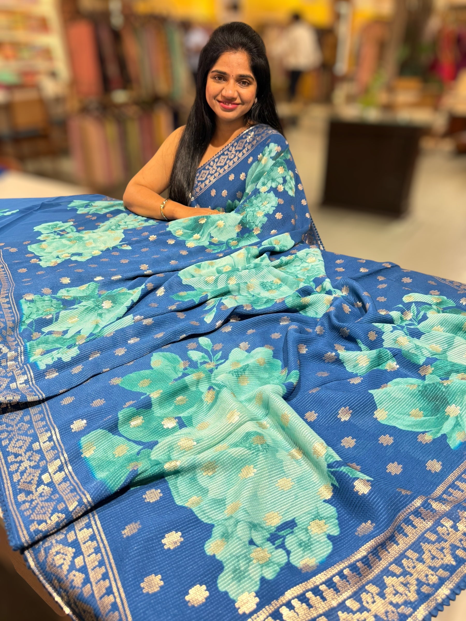 • Blue georgette sequence saree with statement floral print