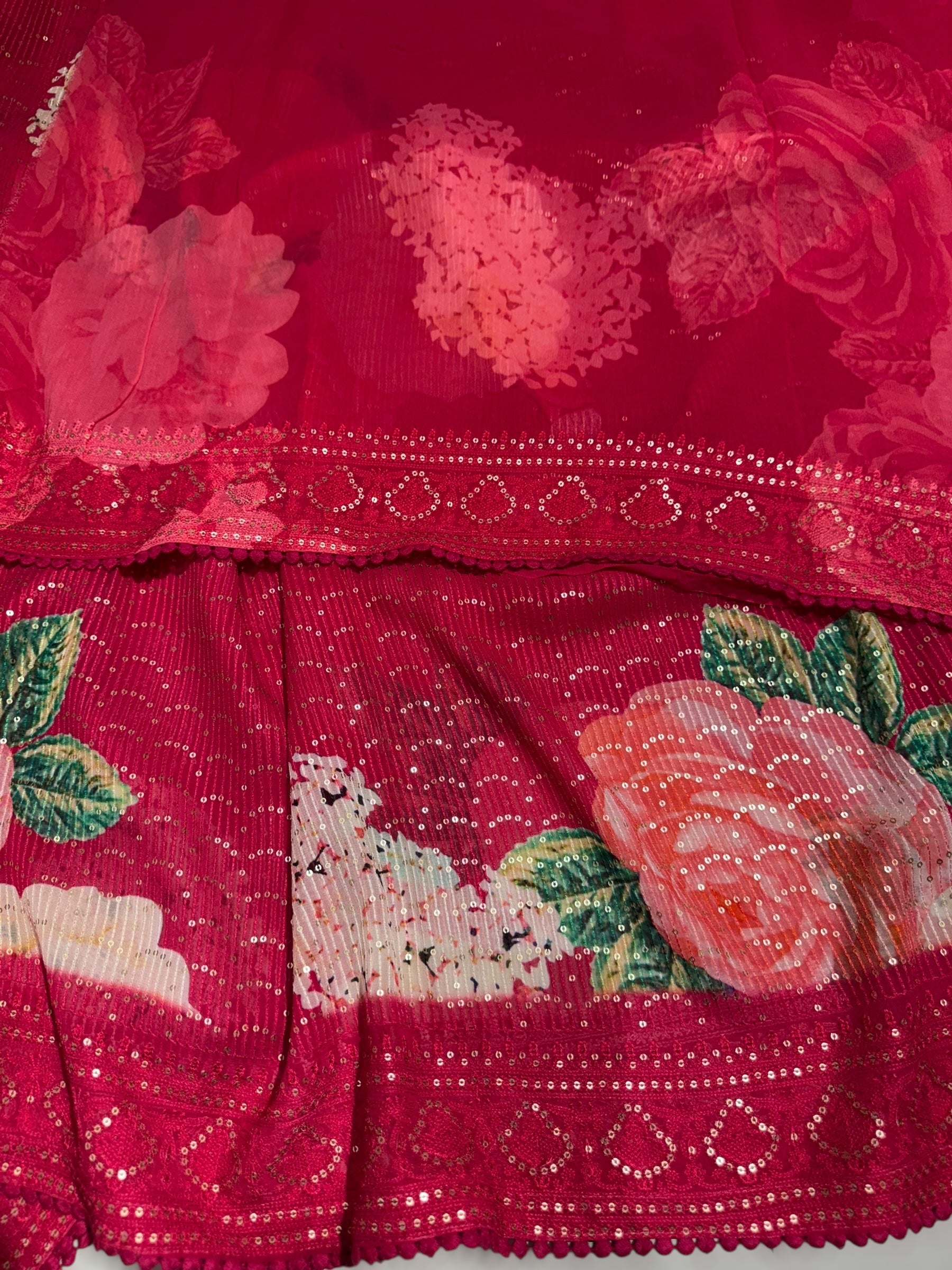 Pure georgette Sequece saree with statement floral prints and chikankari sequnce borders hemlined with crotia lace , paired with self printed georgette blouse .