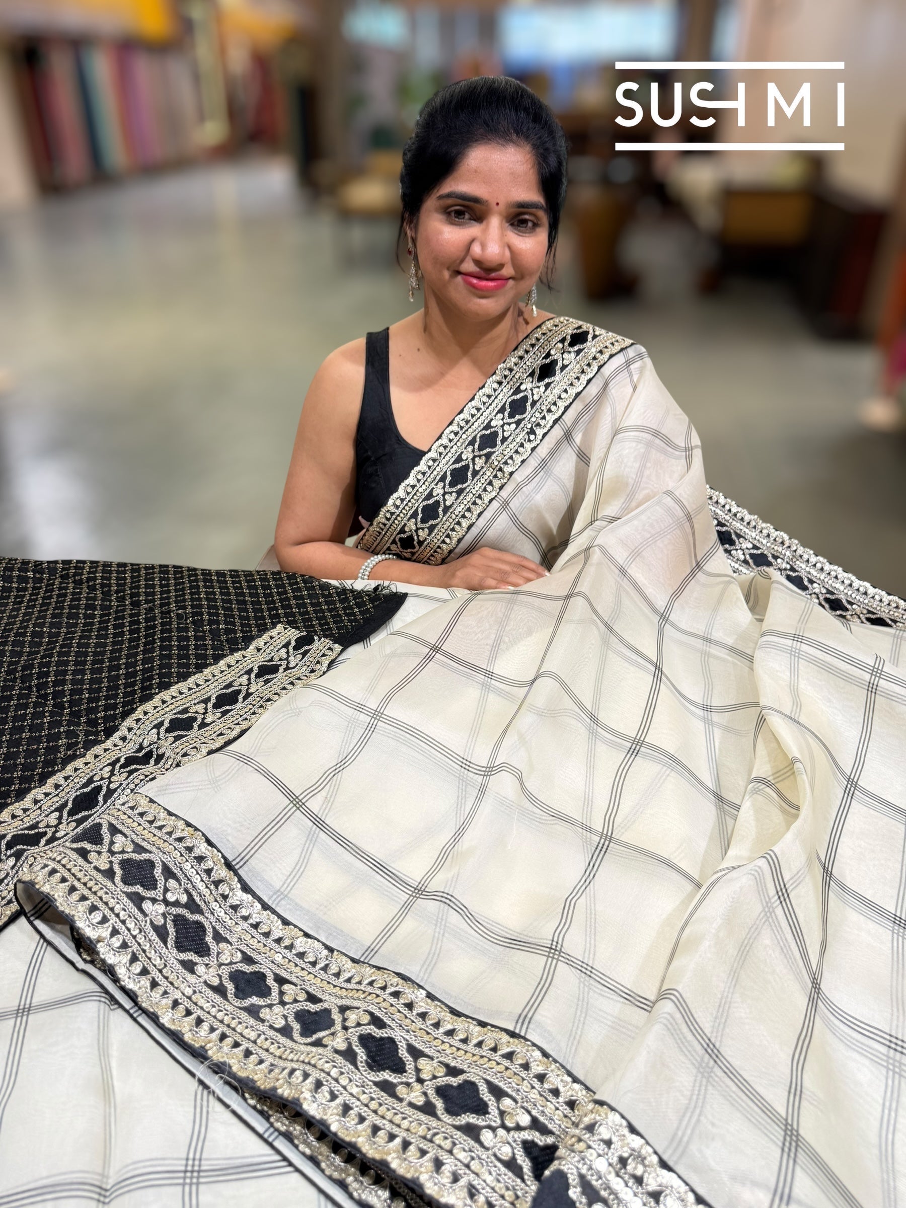 Ivory pure organza saree adorned with classic black checks print and finished with heavy Sabyasachi-inspired black borders for a bold, couture appeal.