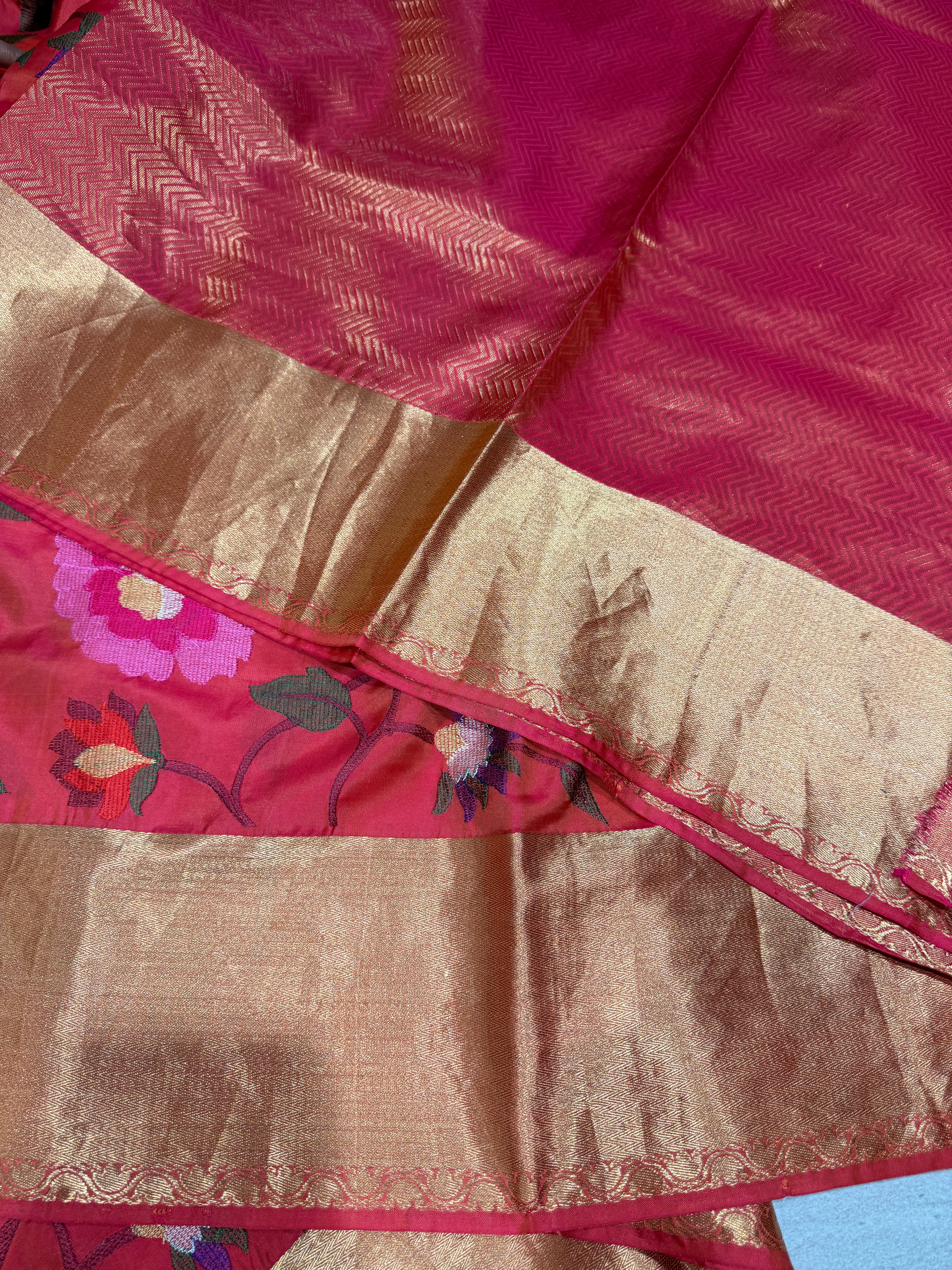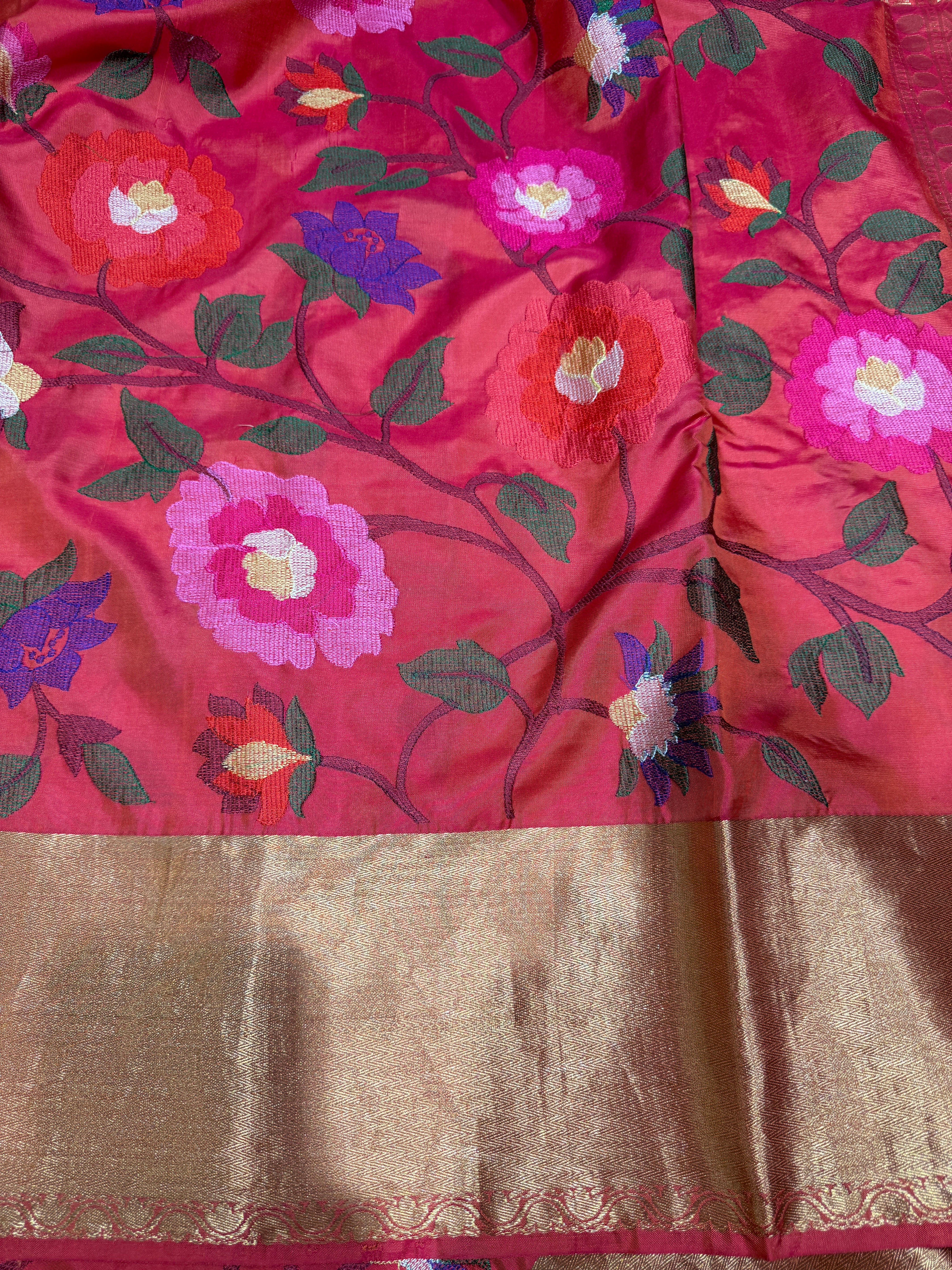 Reddish Pink tone Kanchi soft silk saree with allover jamdani-inspired multicolor floral creeper embroidery that beautifully resembles weaving.