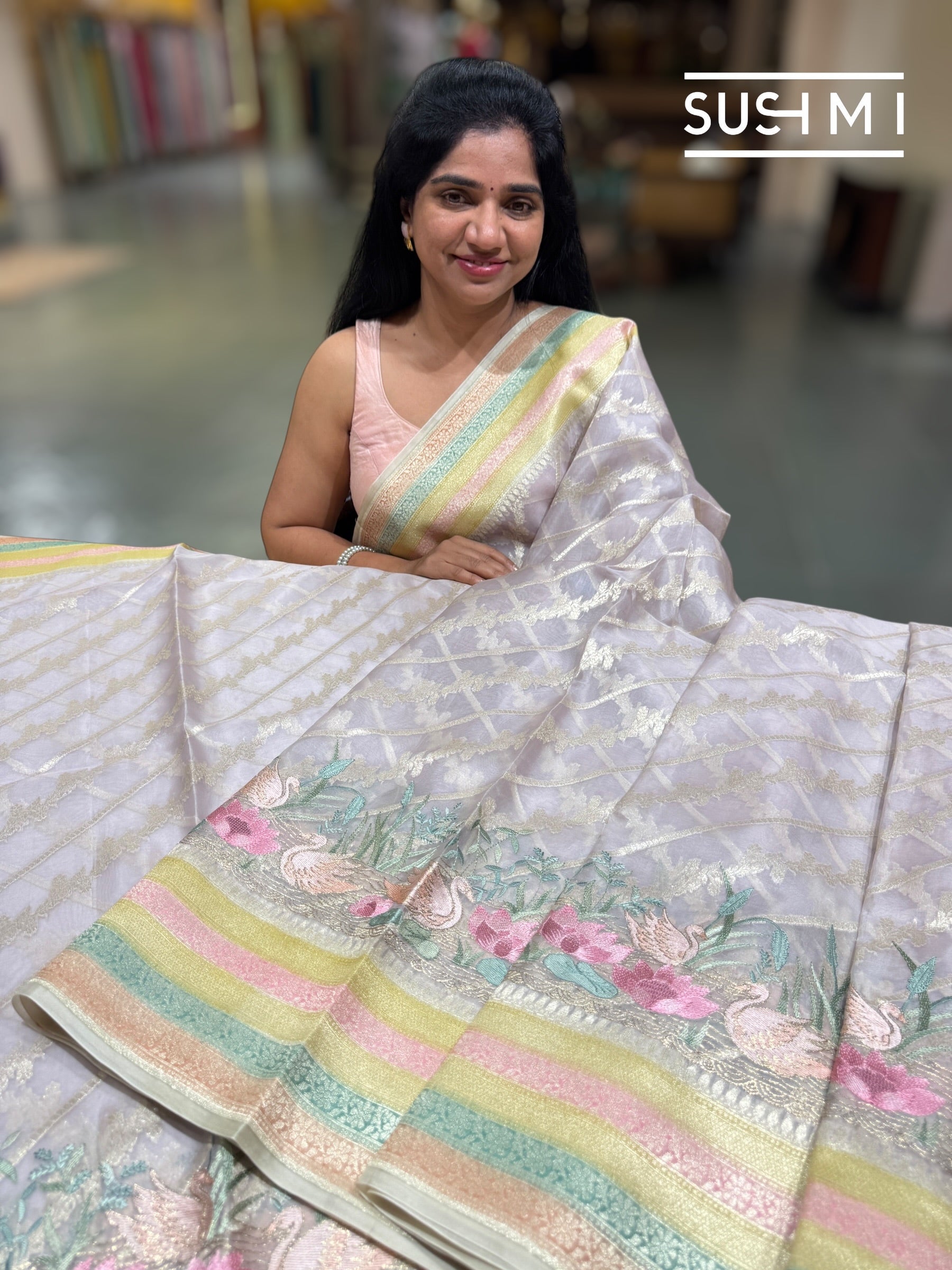 Designer Kora Banarasi Saree with elegant diagonal stripes and alternating creeper woven borders across the body. The highlight is the vibrant multicolor Rangkaat borders enhanced with a beautifully embroidered pond theme featuring swans, blooming lotuses, and shrubs layered over the weave.
