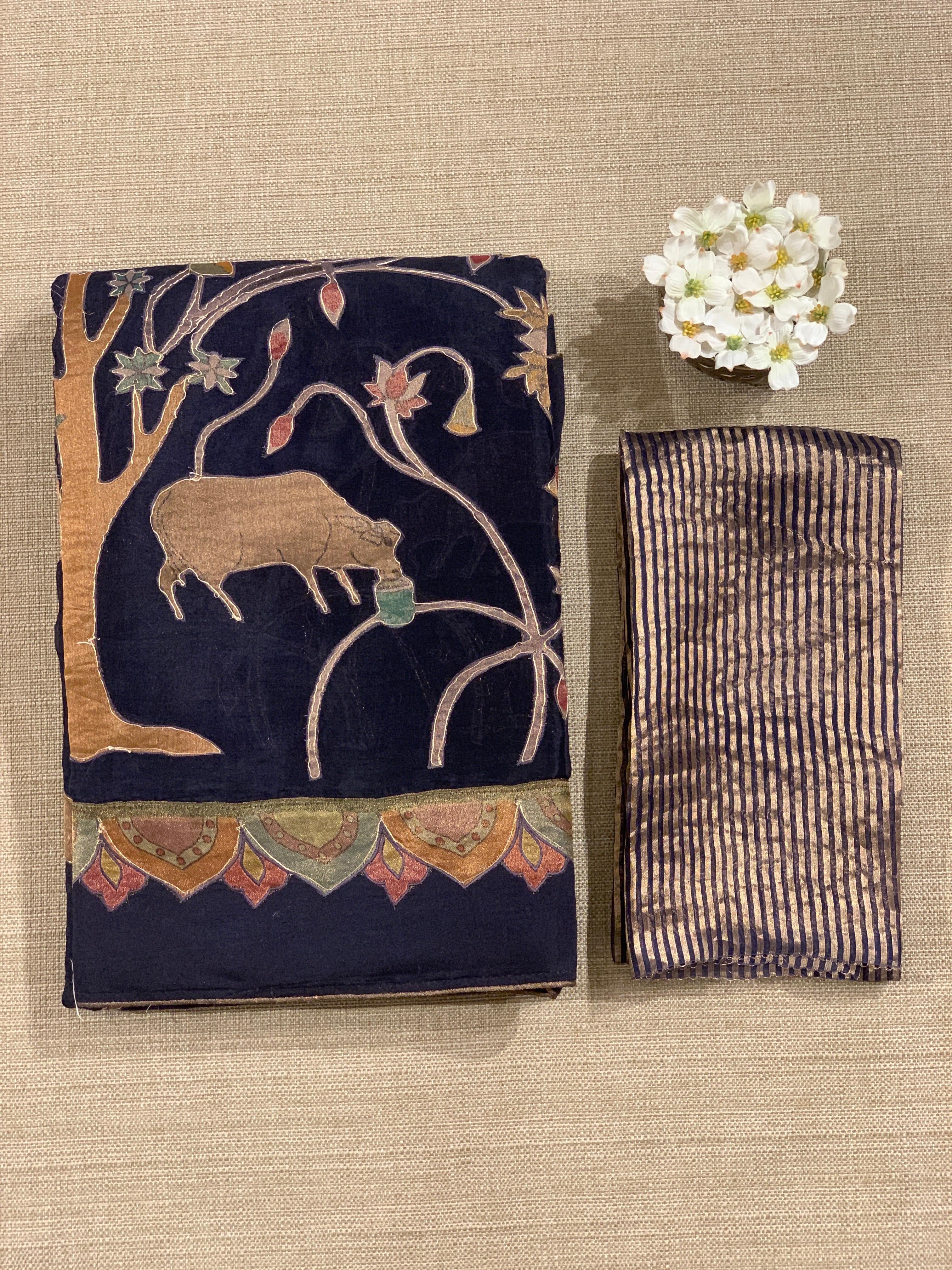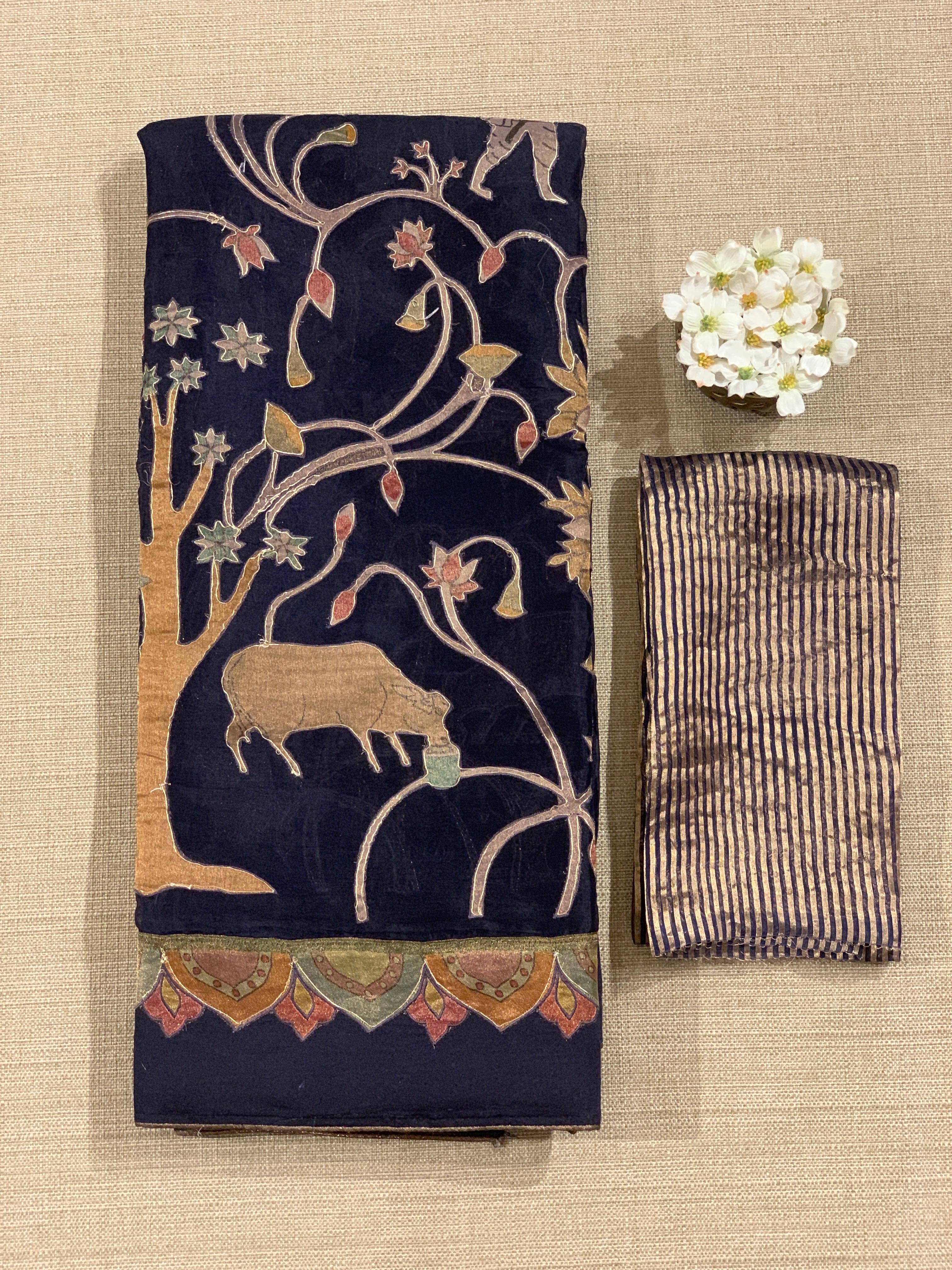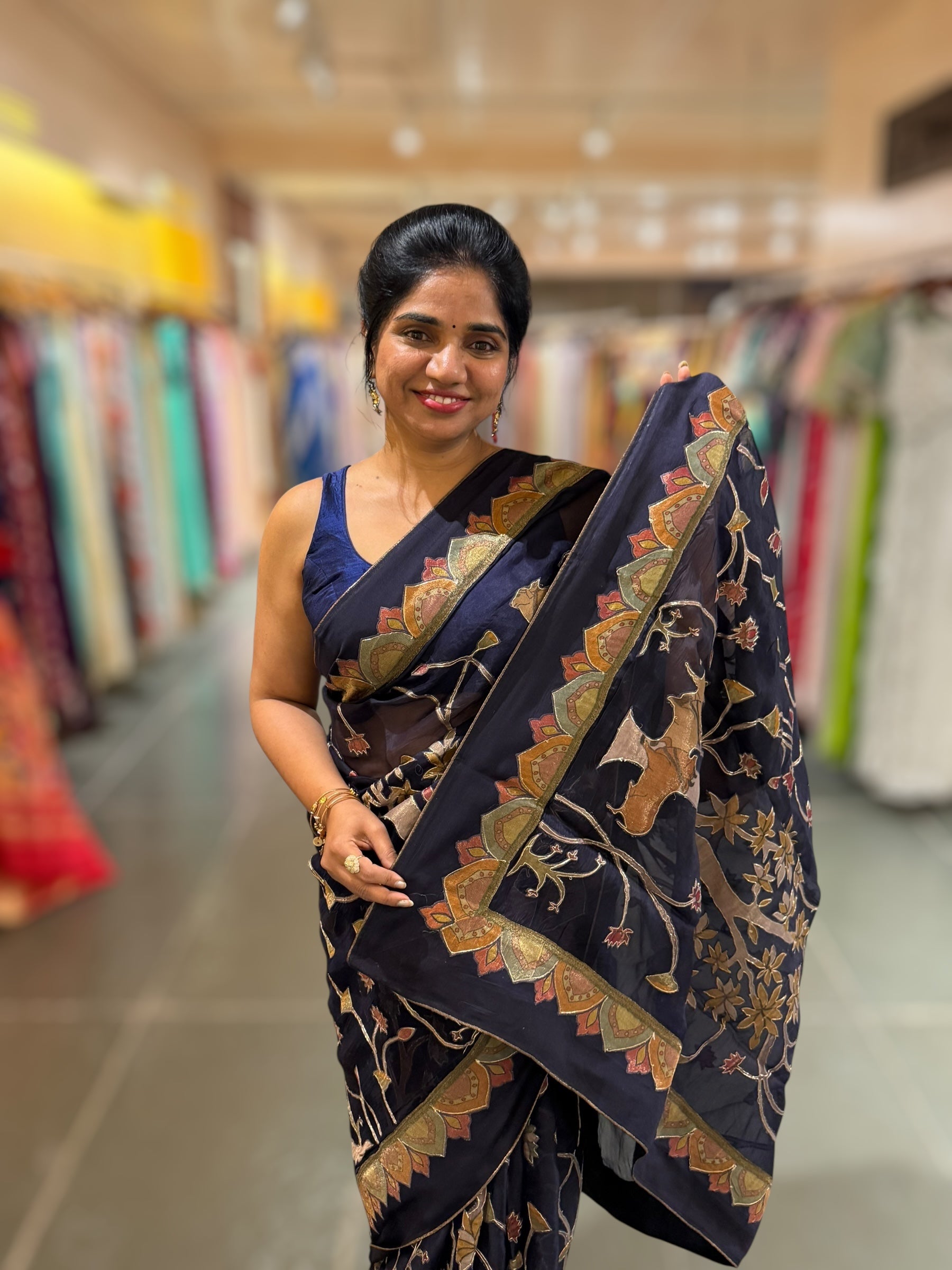• Midnight Blue Designer Organza Saree with Stunning Tissue Applique work Saree with Village theme