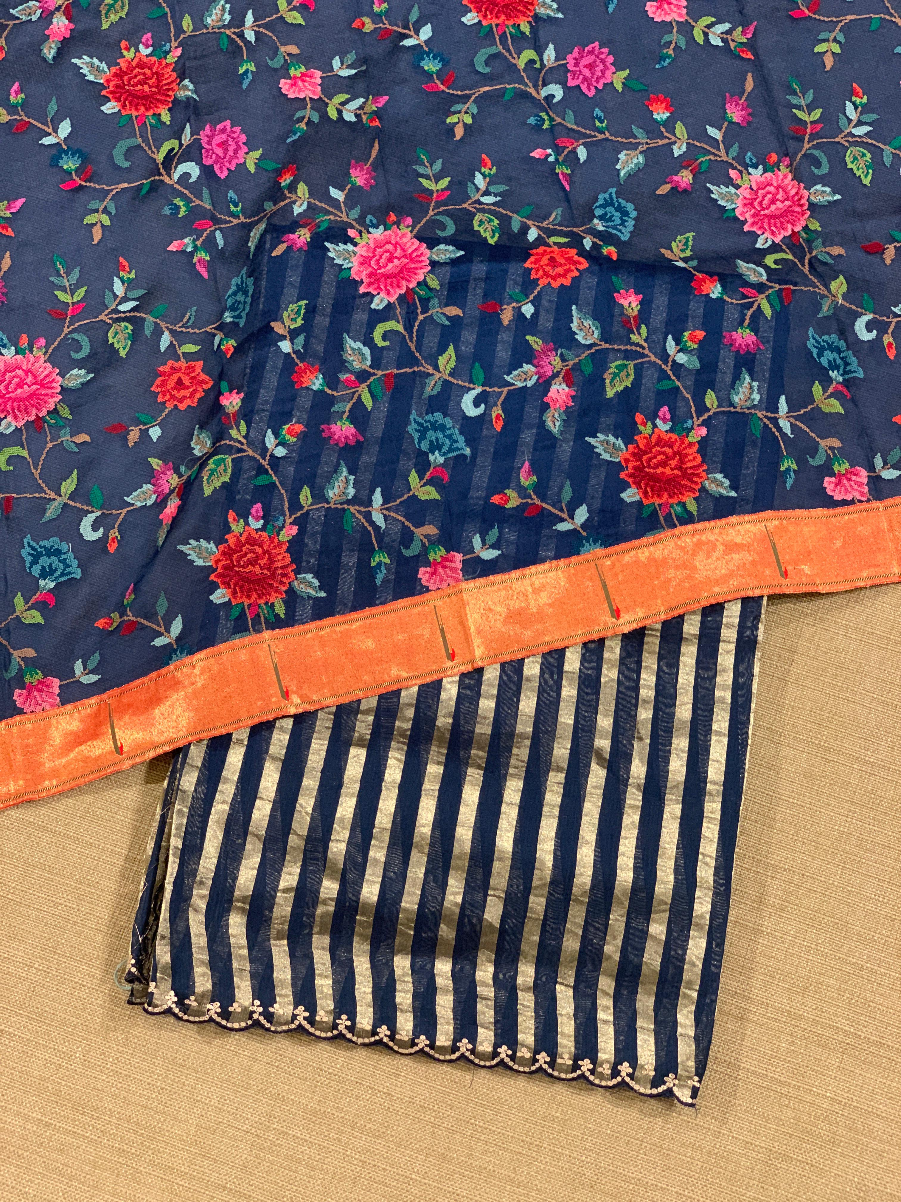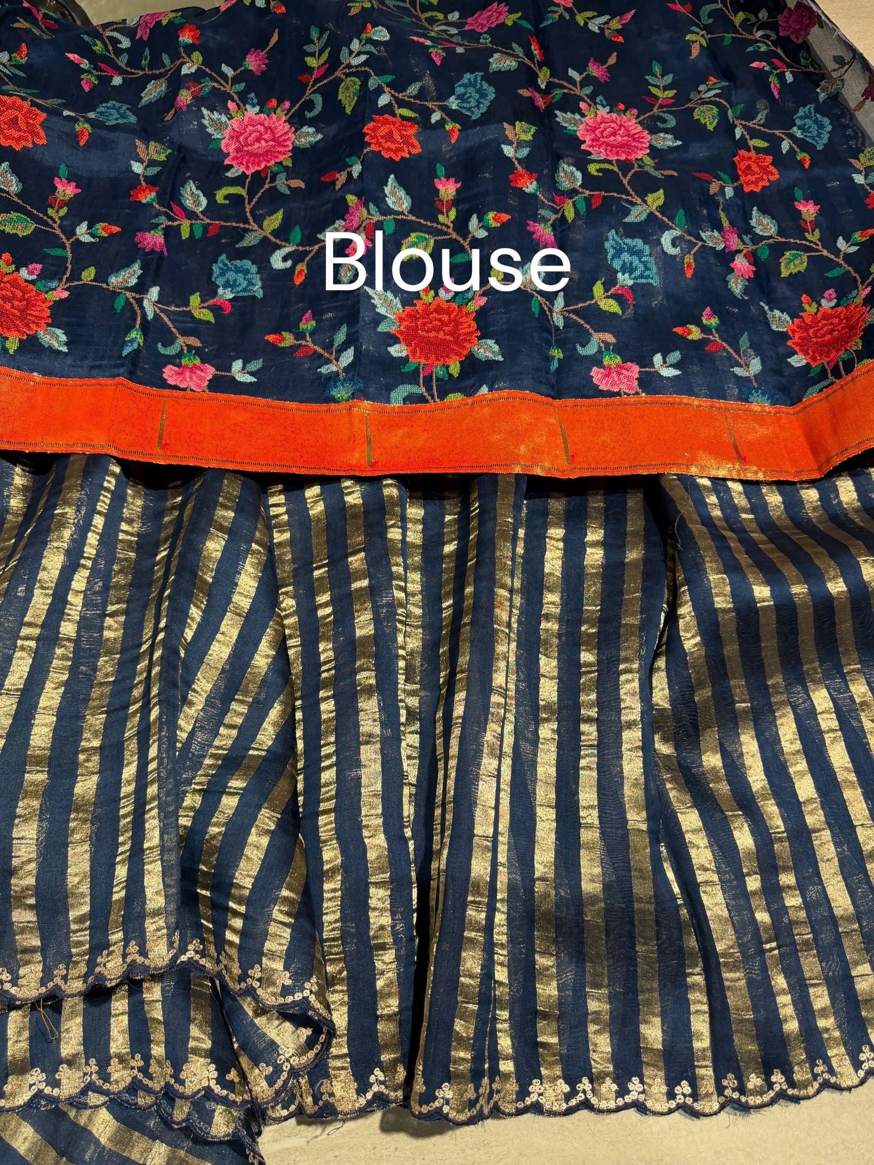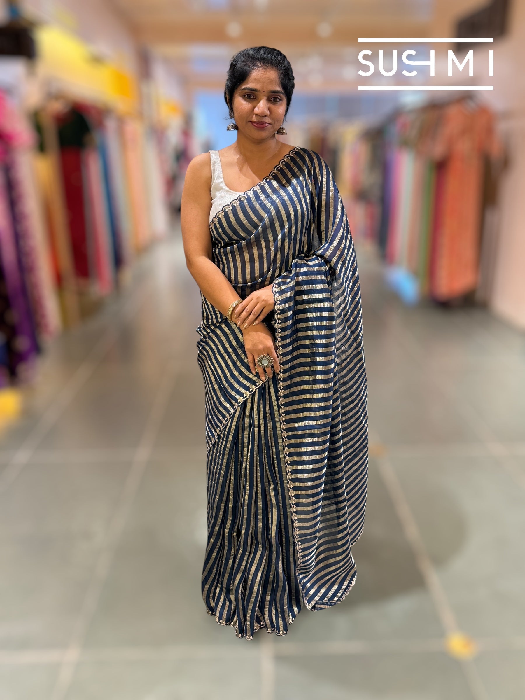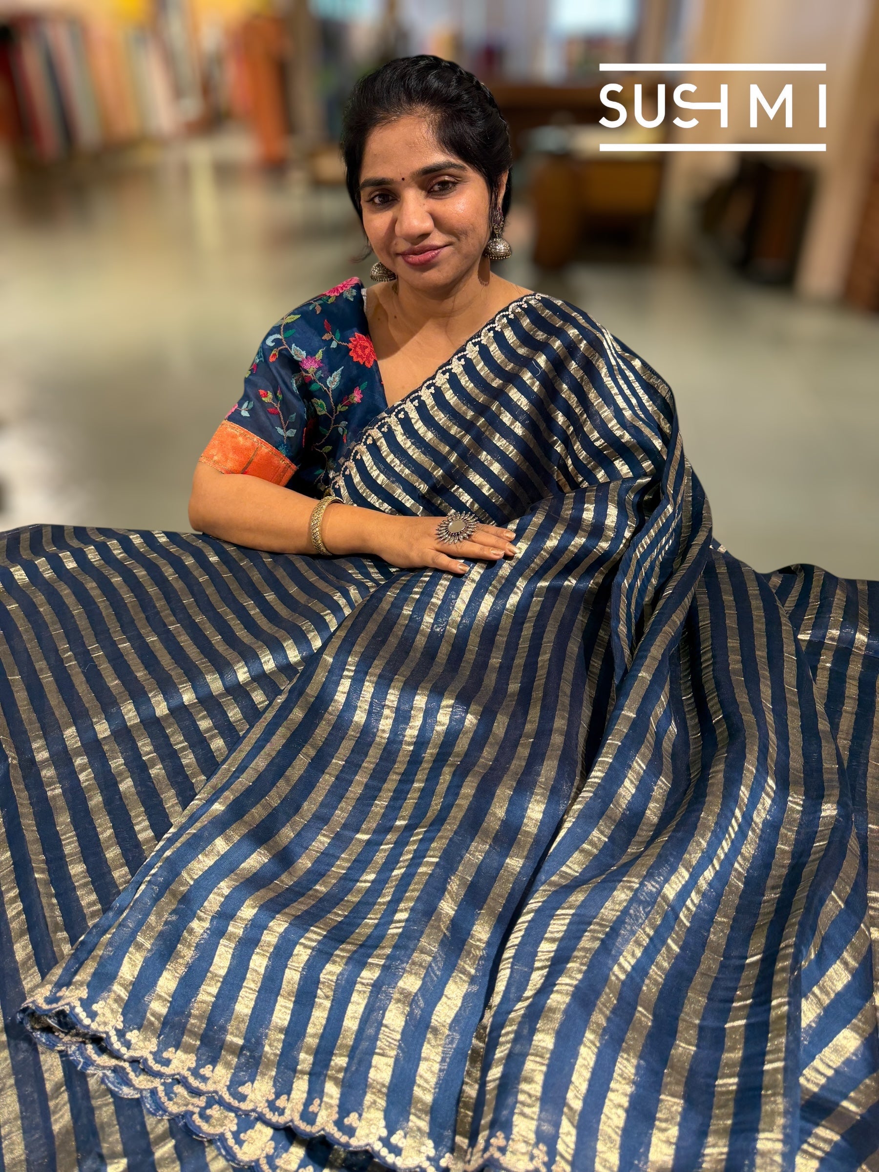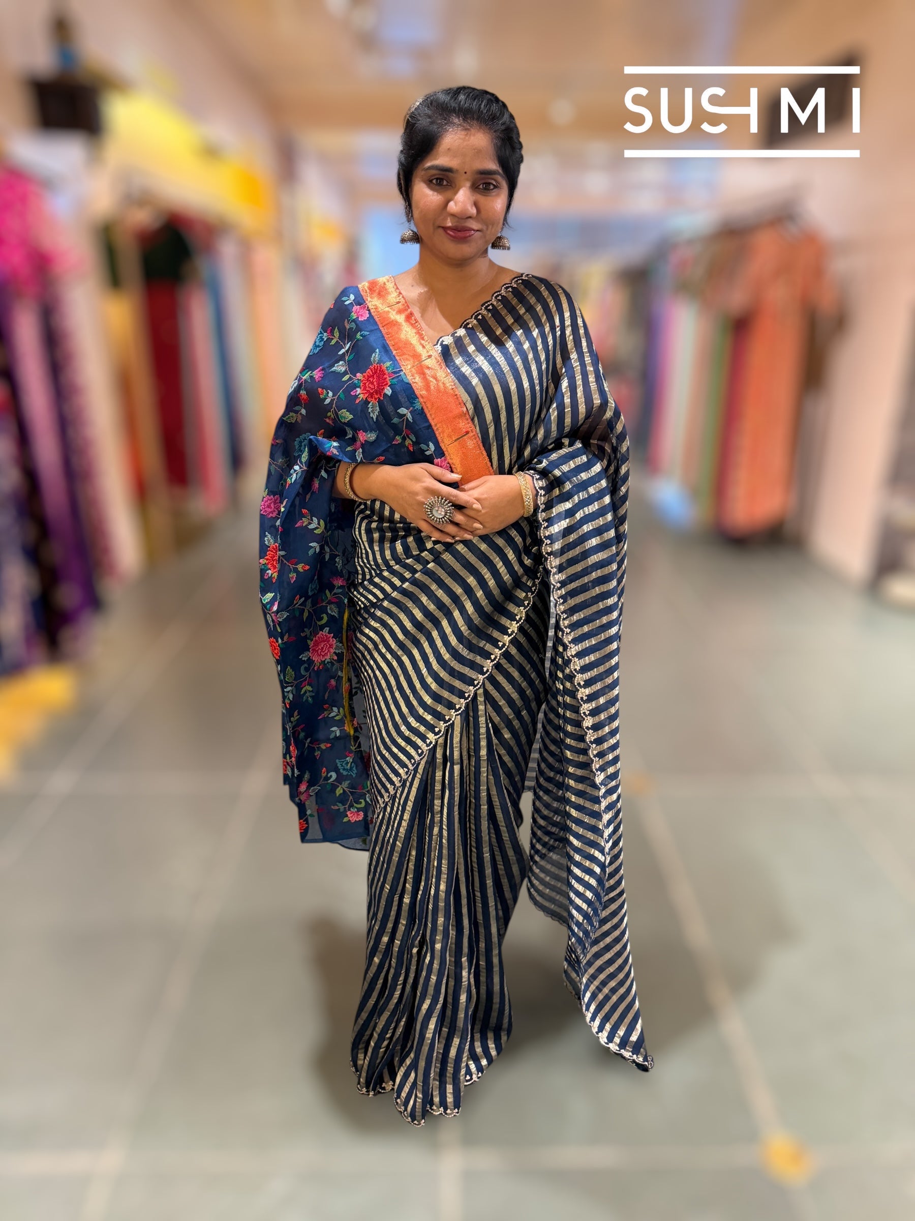 • Midnight blue Mul tissue stripes saree with fusion blouse : D62134