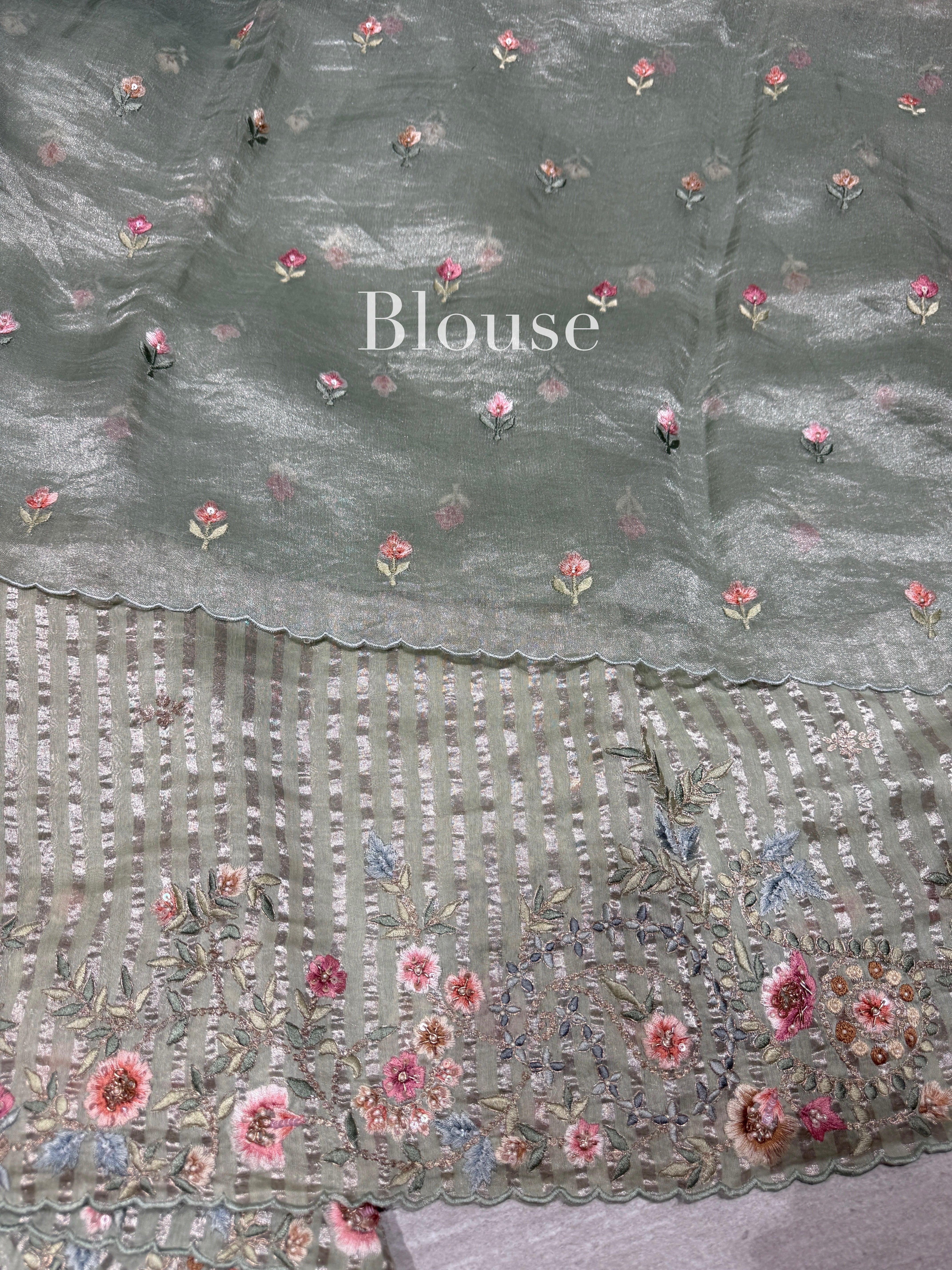 It is paired with a pure mint green tissue blouse detailed with delicate embroidered floral buds all over, completing the ensemble with understated sophistication and charm.