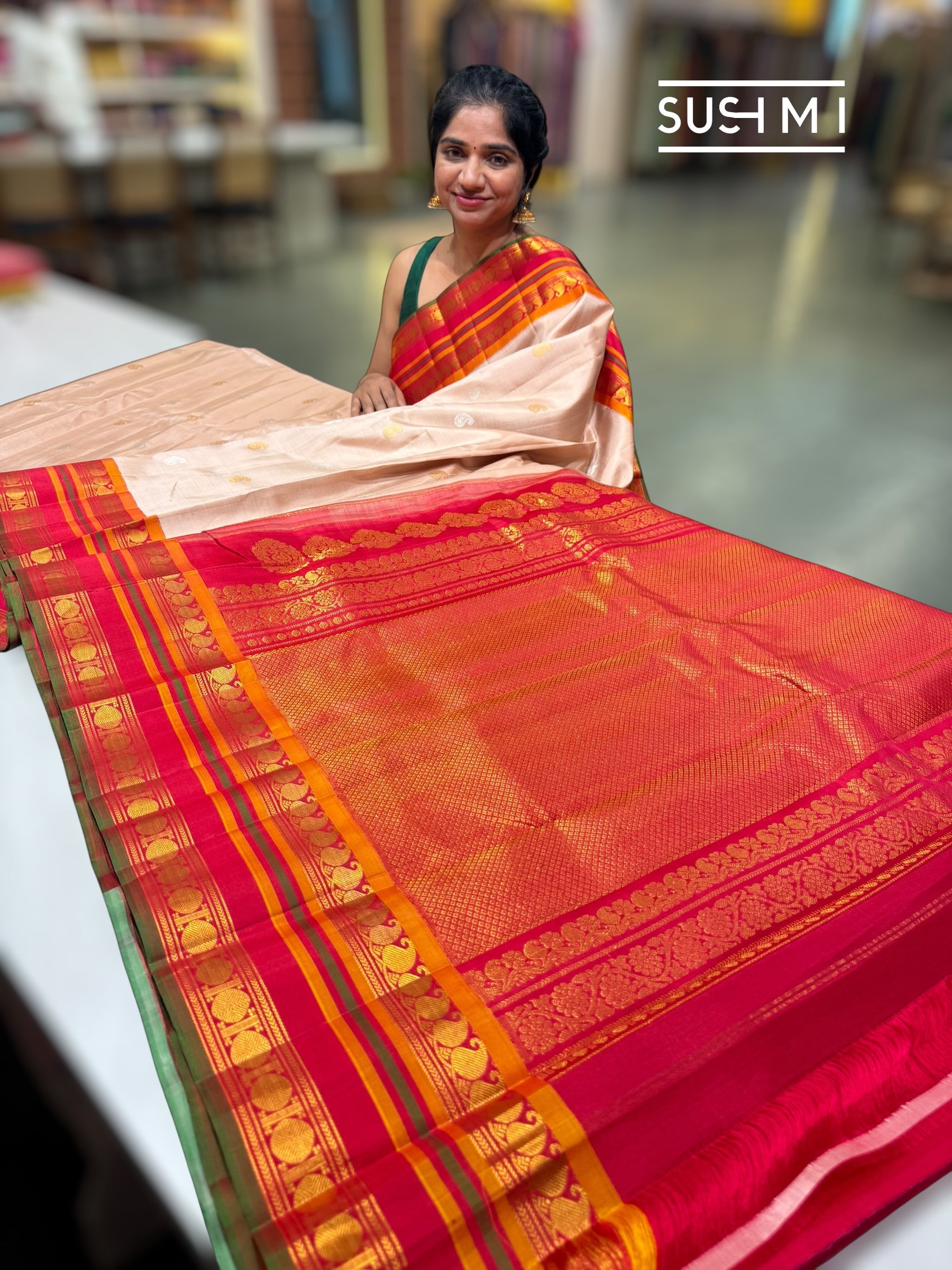 Nude vintage Gadwal silk saree paired with striking reddish pink borders and a classic green selvedge. The body is beautifully adorned with intricate mango (paisley) motifs woven all over in silver and golden zari, adding timeless charm.
