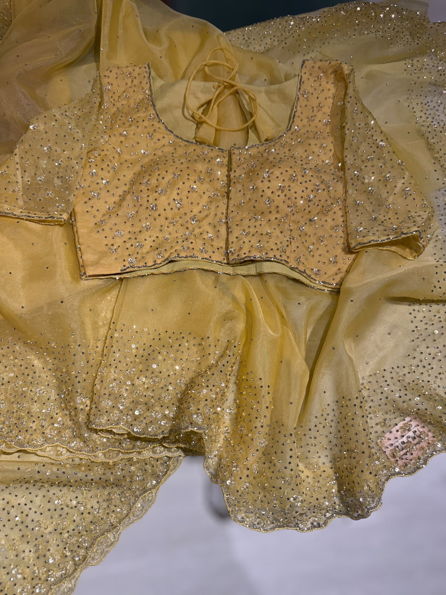 • Pastel yellow Organza handwork saree with ready to wear blouse