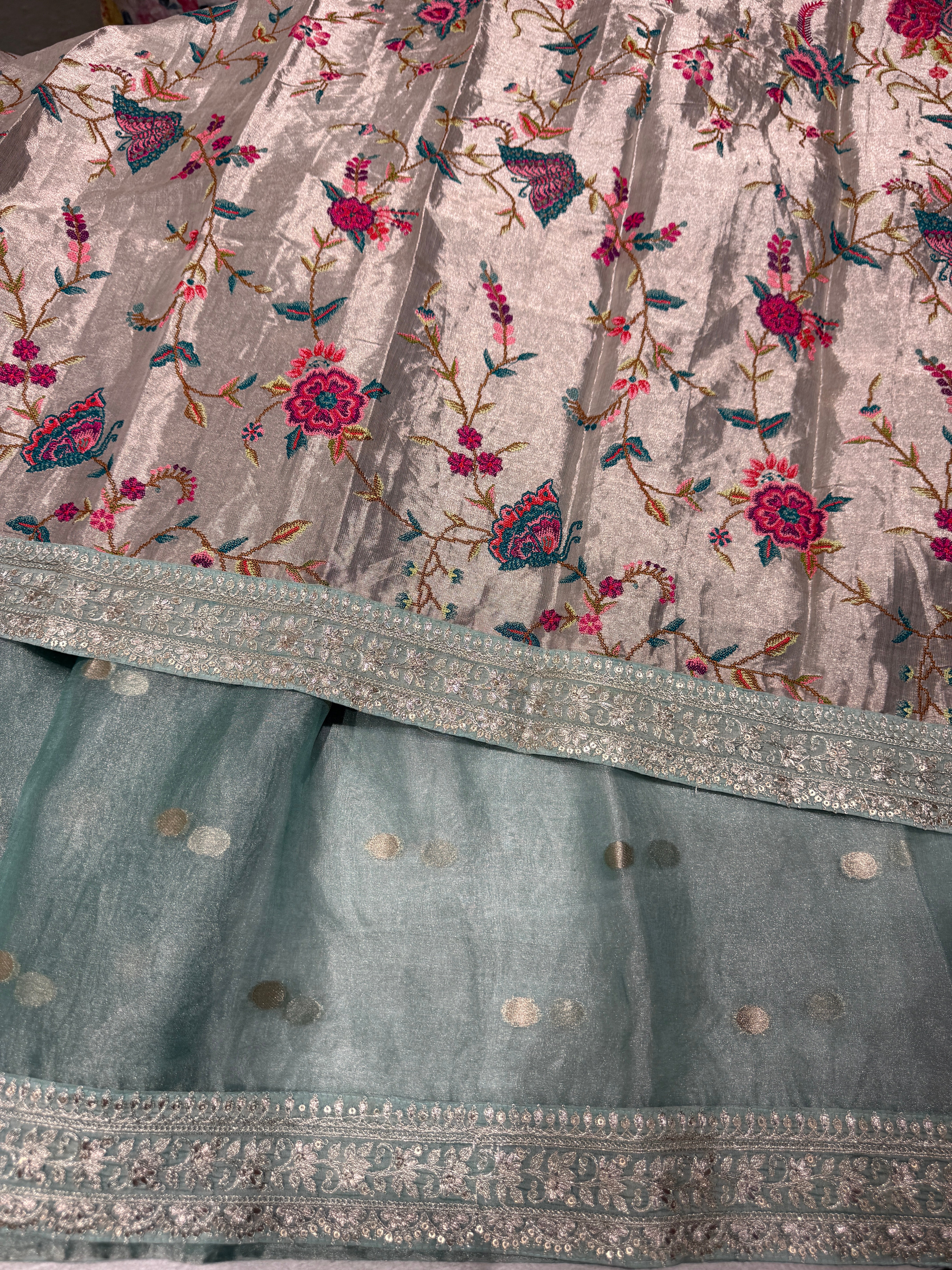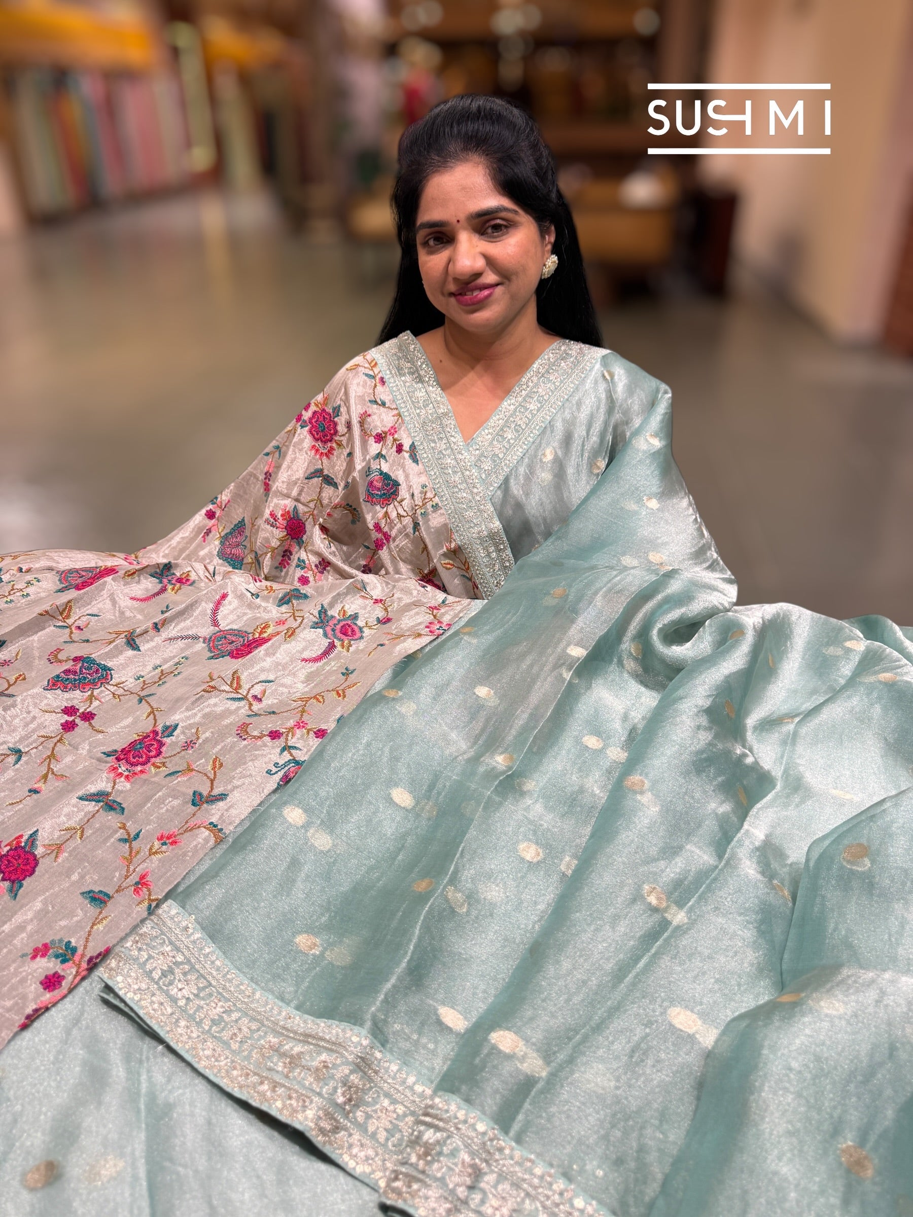 Paired with a pure silver tissue blouse showcasing intricate petite point embroidery all over and finished with matching borders for a graceful, coordinated look.