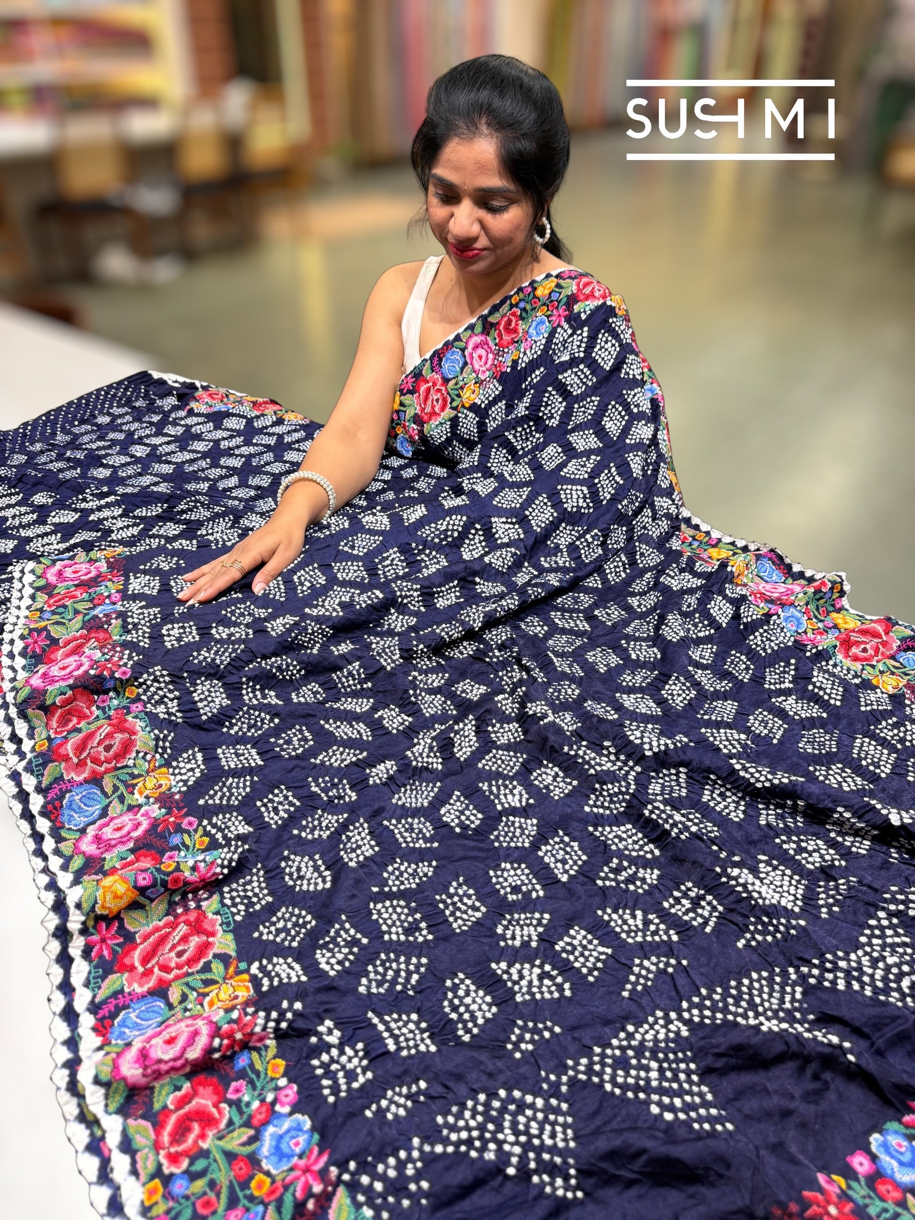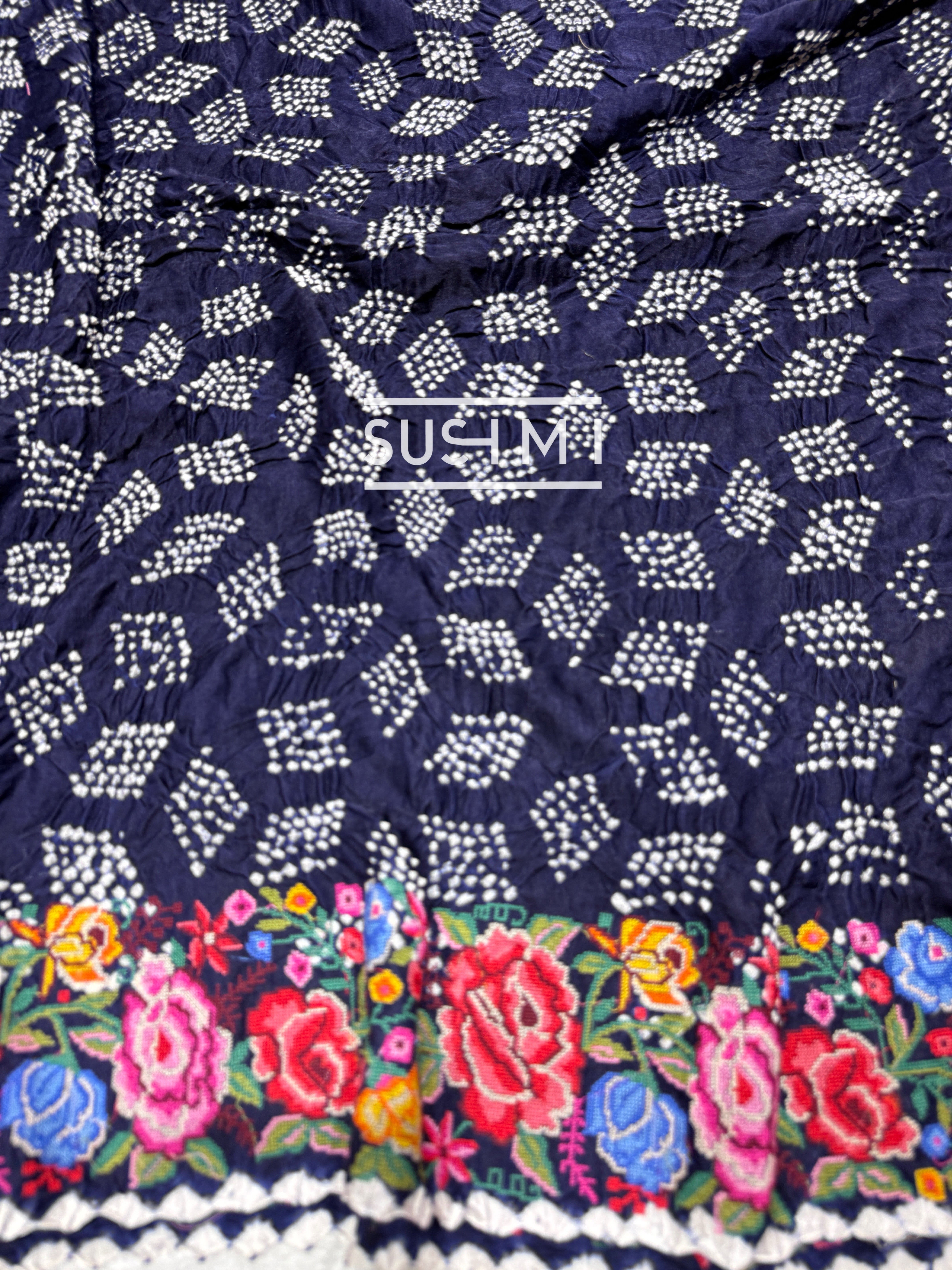 Beautiful pure Gajji silk saree featuring traditional Rai Bandhej artistry. The pallu showcases elegant designer Rai Bandhej patterns, while the pleats are adorned with classic single-dot Rai Bandhej. The saree is highlighted with a vibrant multi-color petite point embroidered border and finished with a distinctive white batik selvedge.
