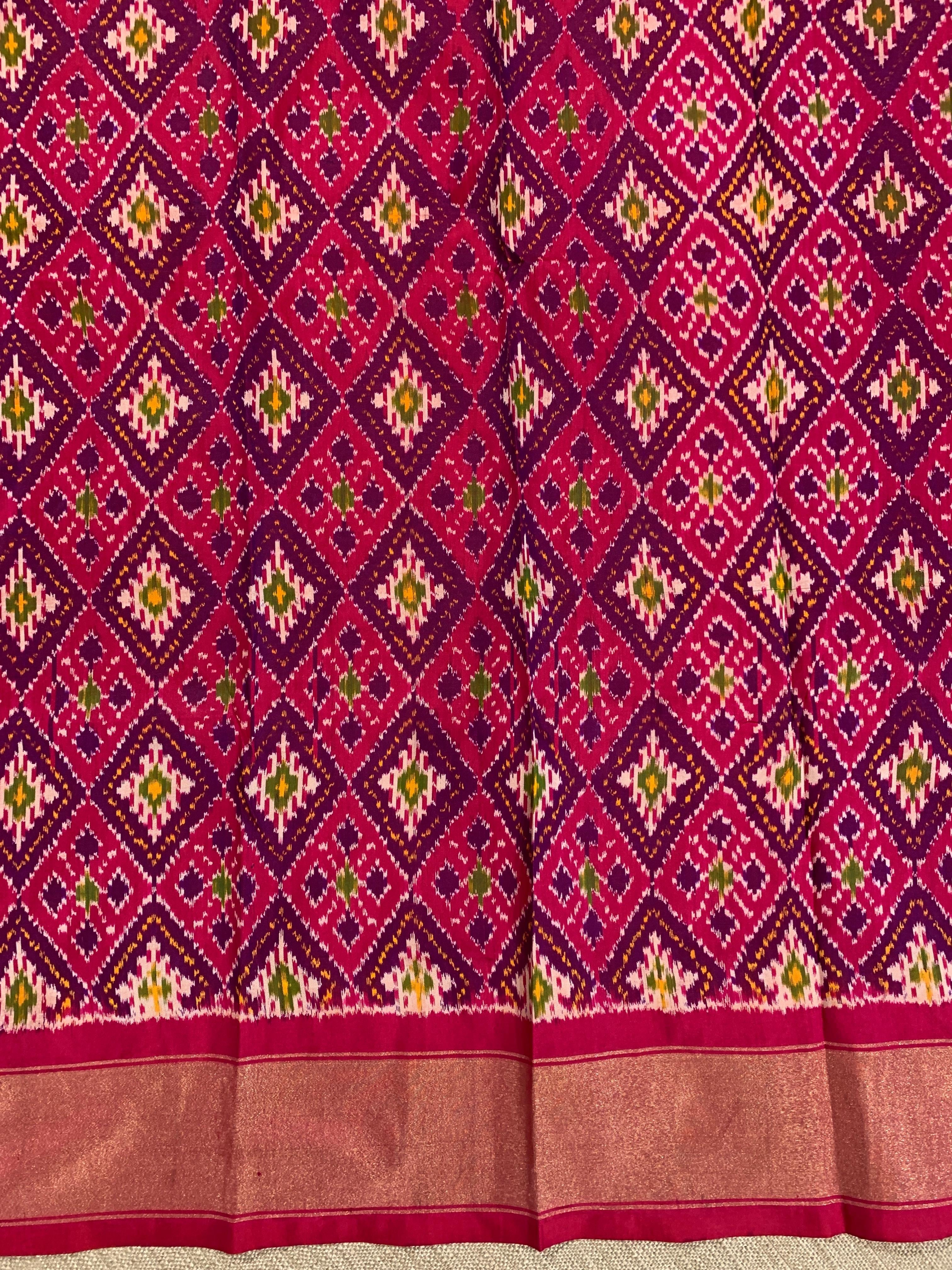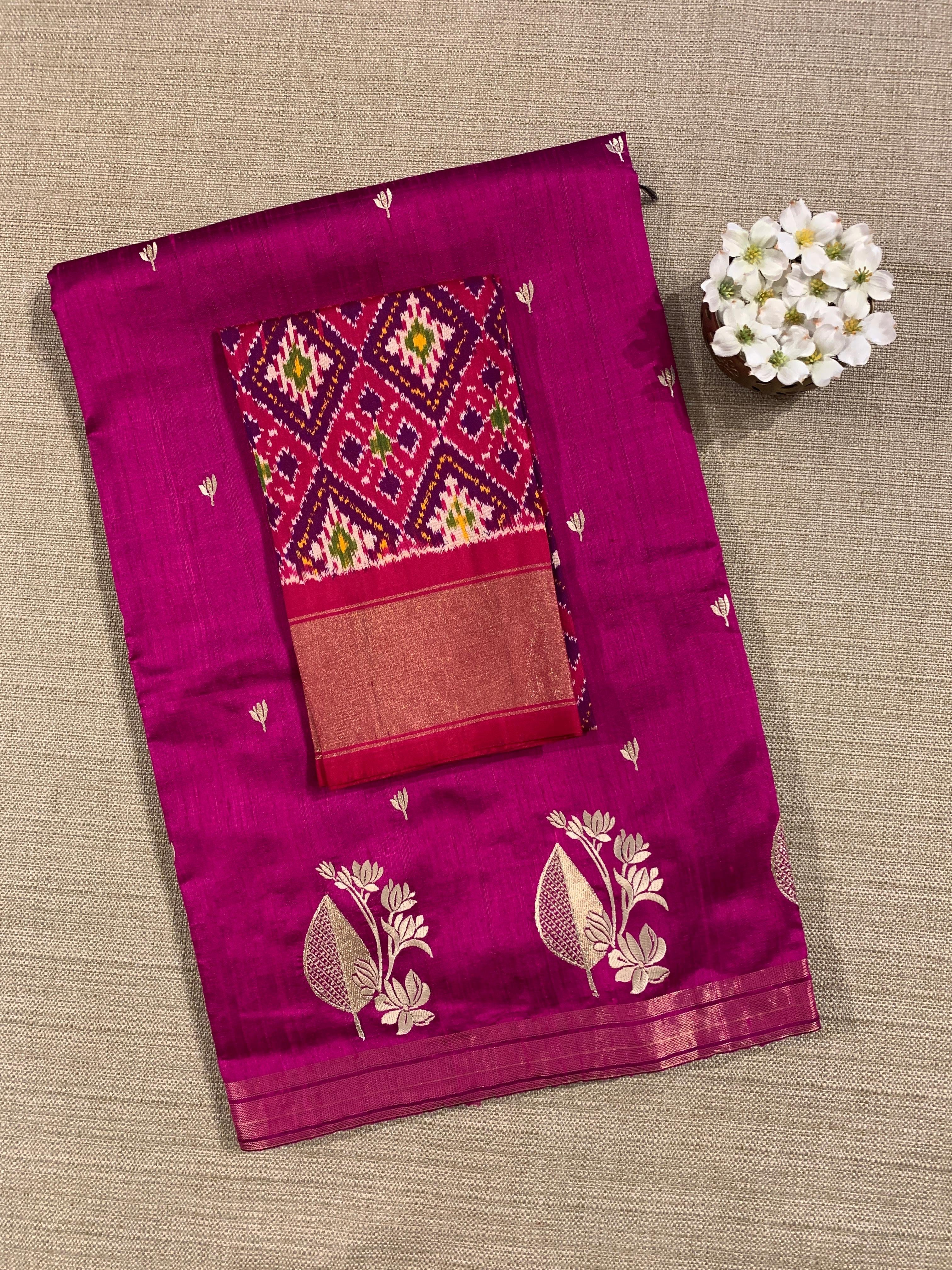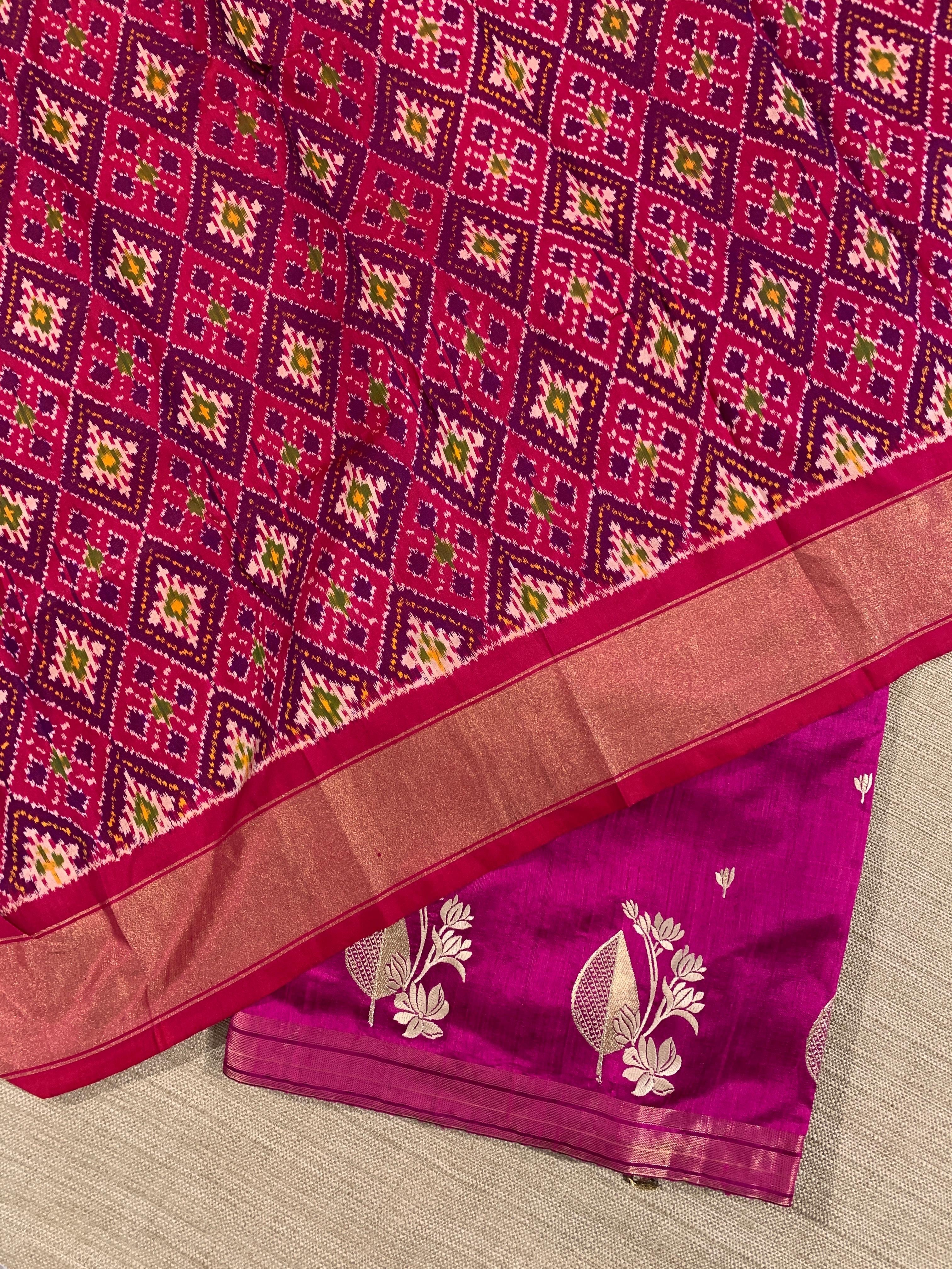 Pure Handloom Raw Silk Saree in vibrant colors and stunning embroidery paired with Ikkath Patola silk Blouse . Blouse is highlighted with temple style embroidery.