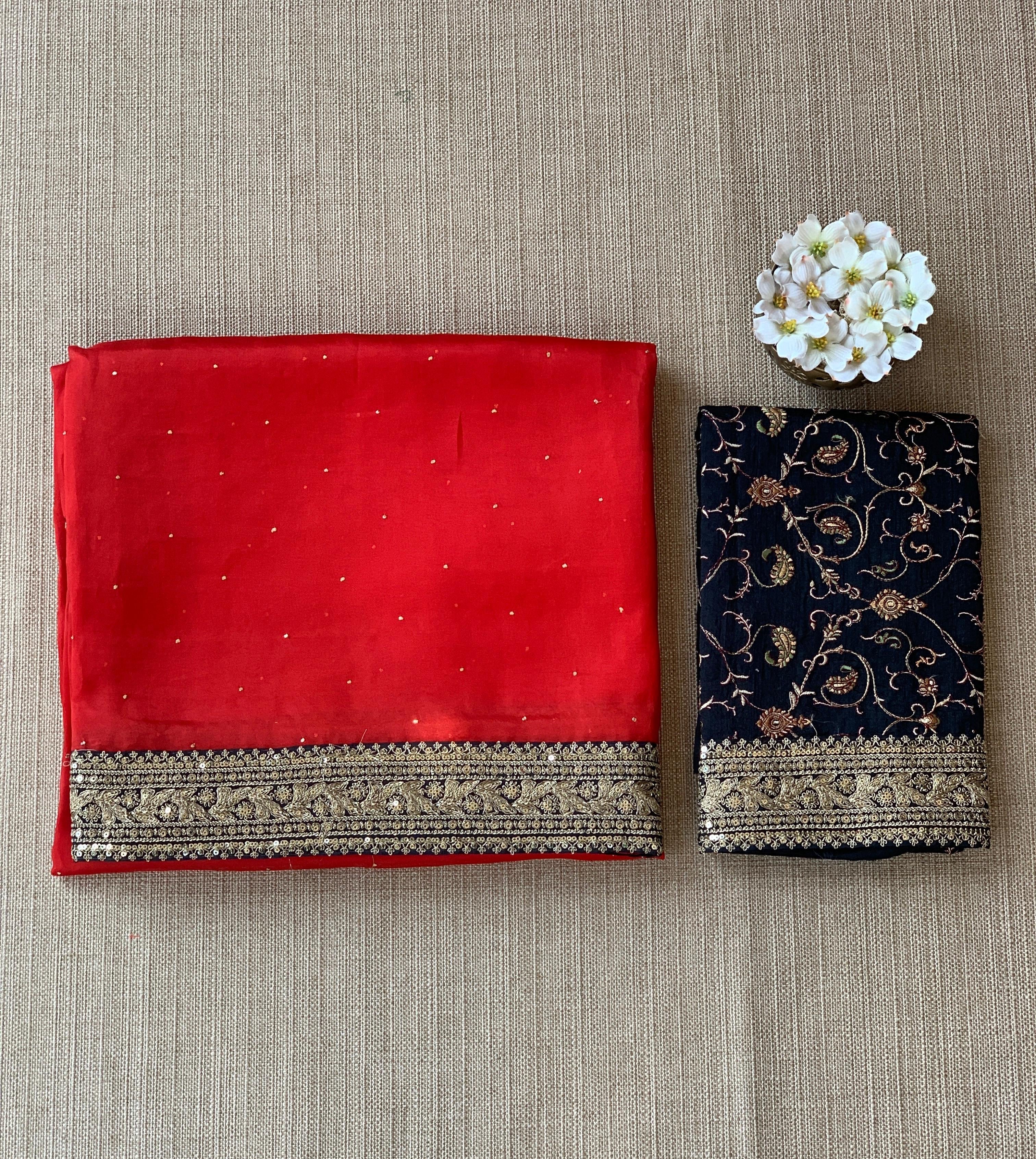 Red Pure Organza Saree with allover hand done mukaish work hemlined with heavy sabyasachi border in black