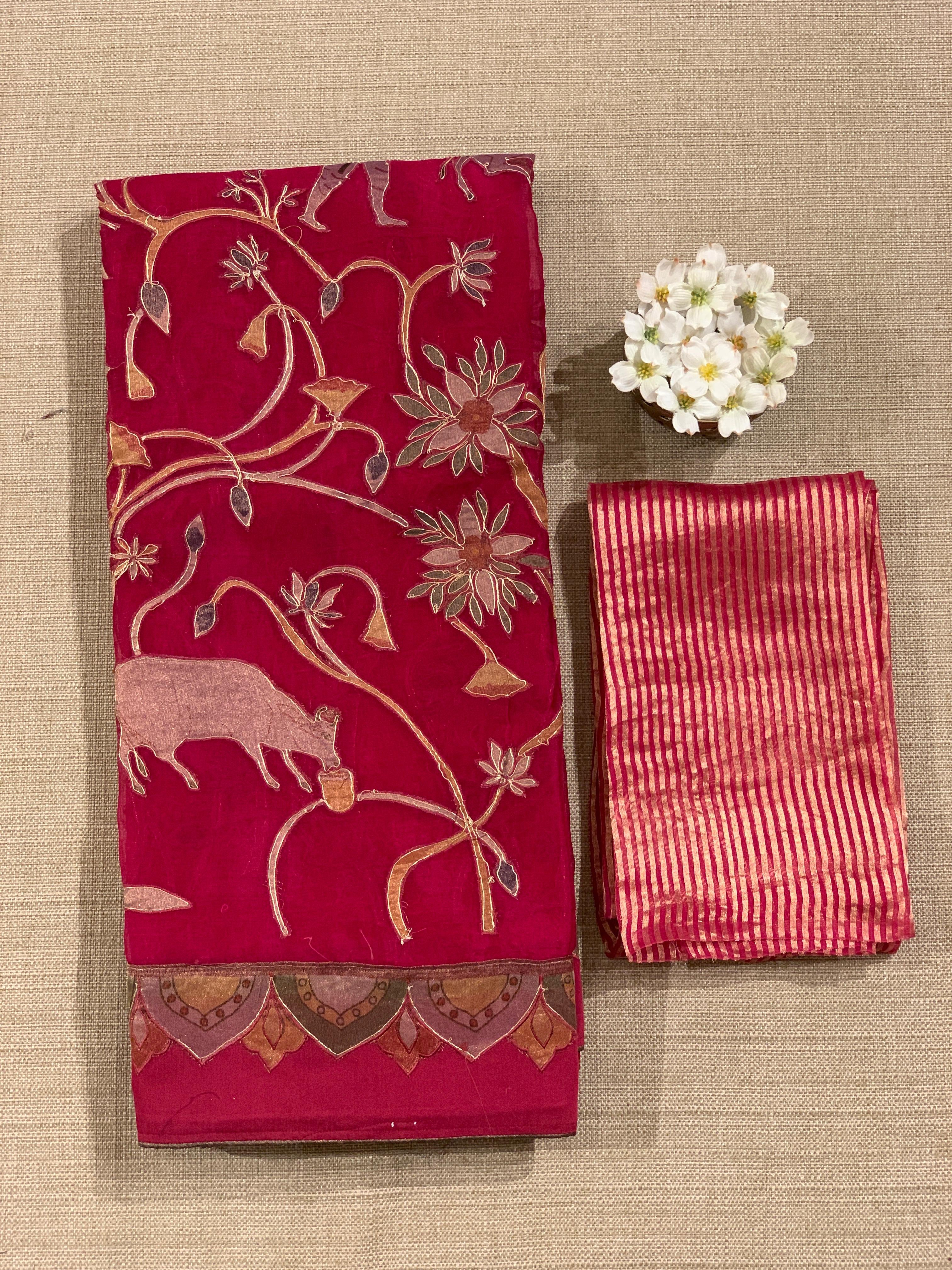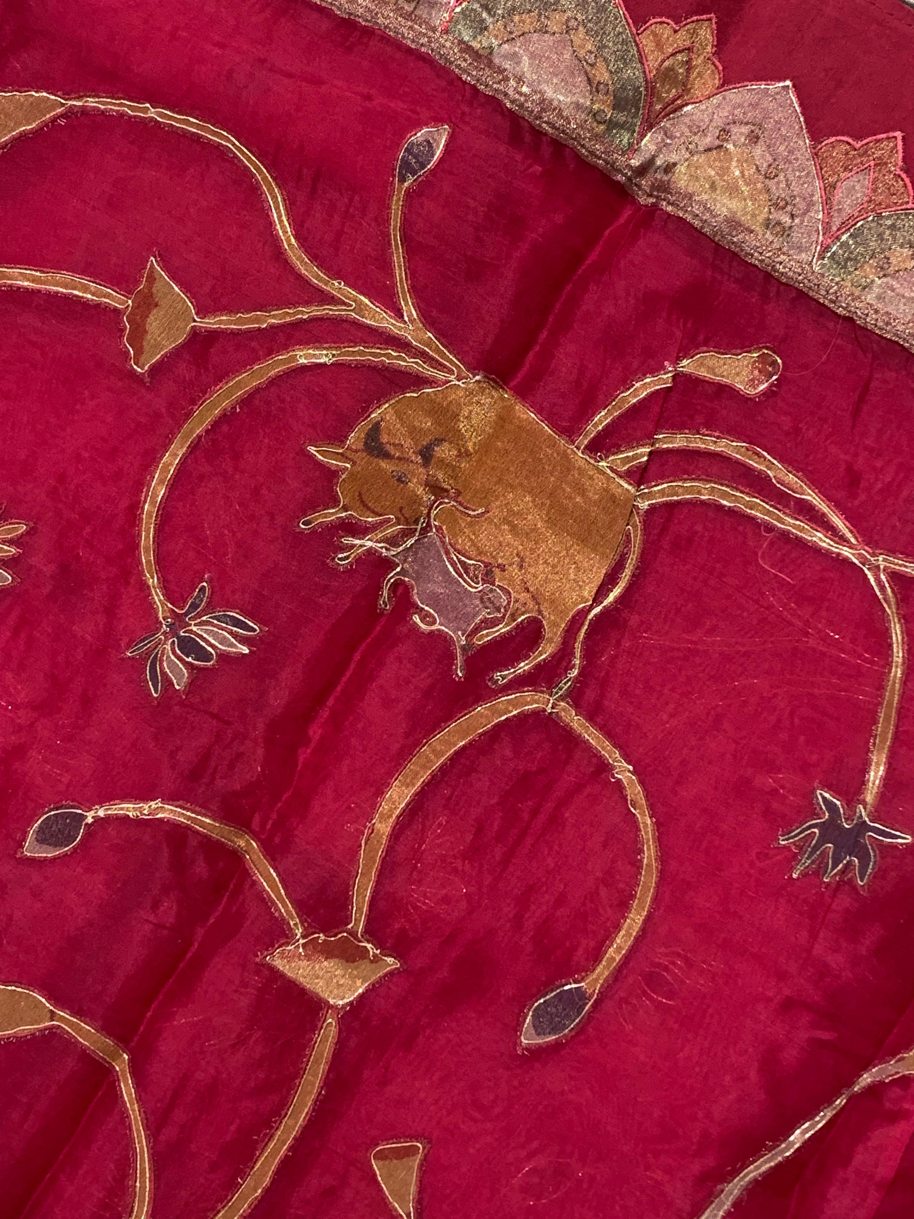 • Ruby Pink Designer Organza Saree with Stunning Tissue Applique work Saree with Village theme