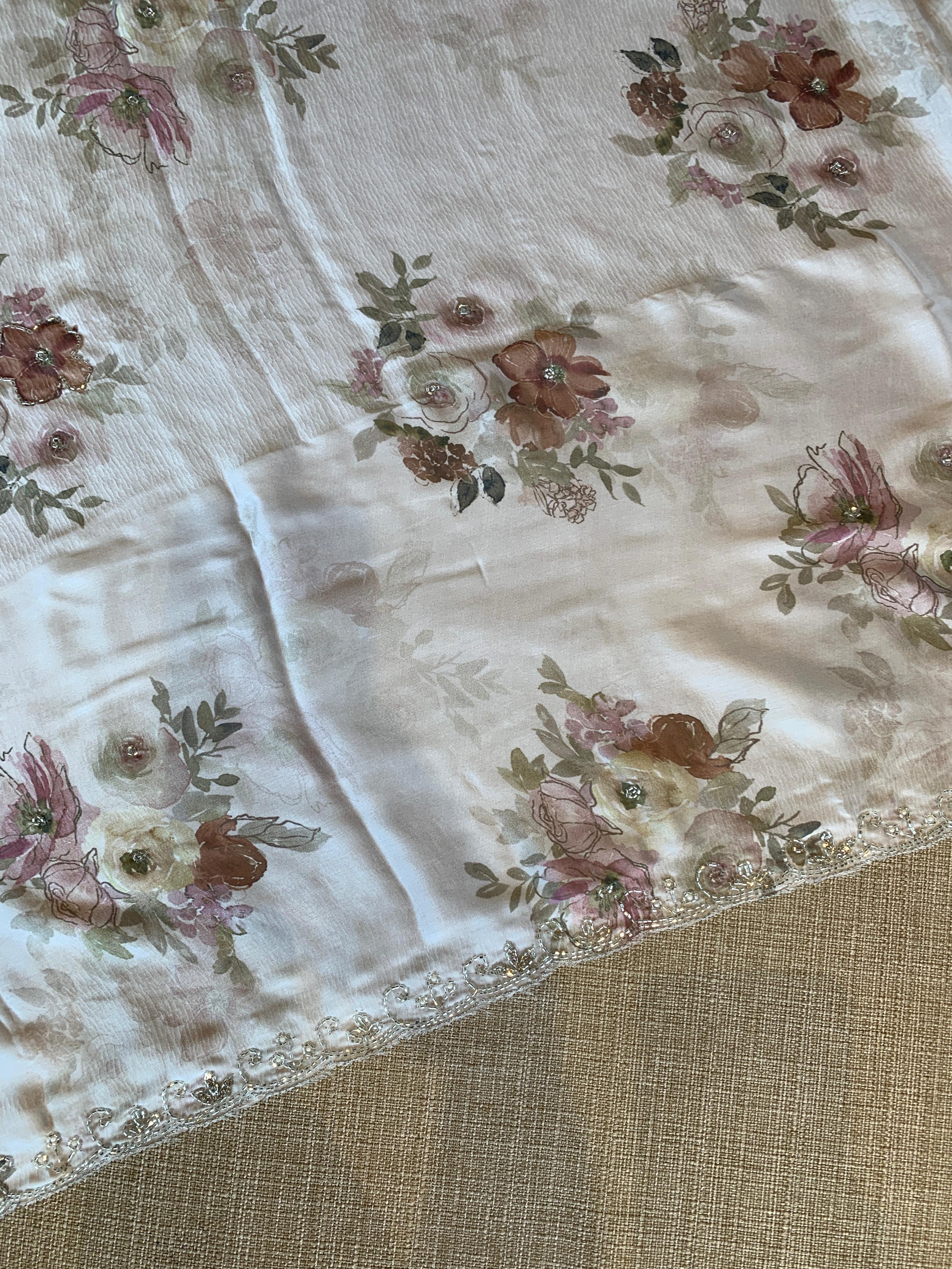 White Pure Chinnon Satin Crepe Saree With Floral Print & Handwork Borders