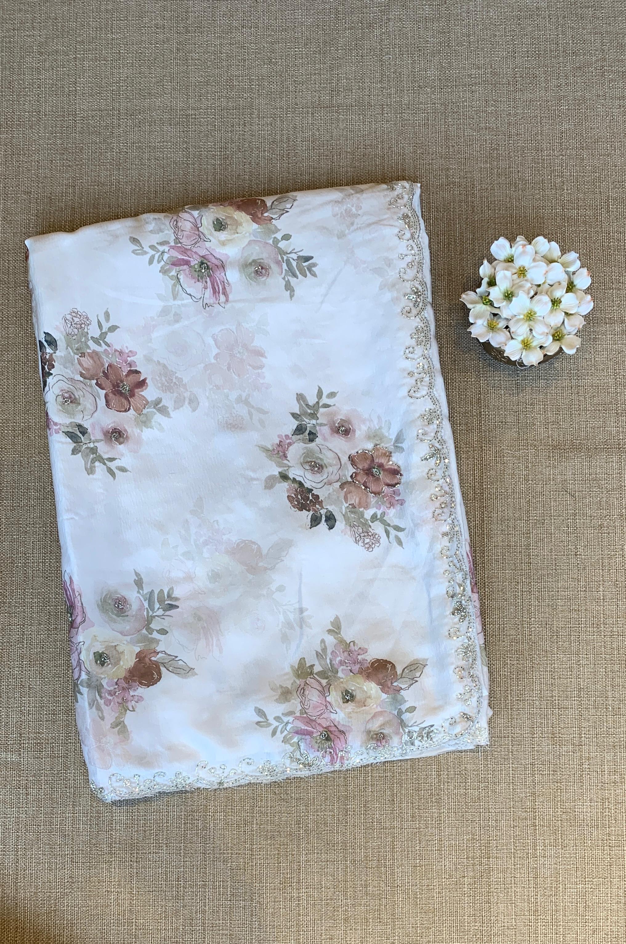 • White Pure Chinnon Satin Crepe Saree With Floral Print & Handwork Borders