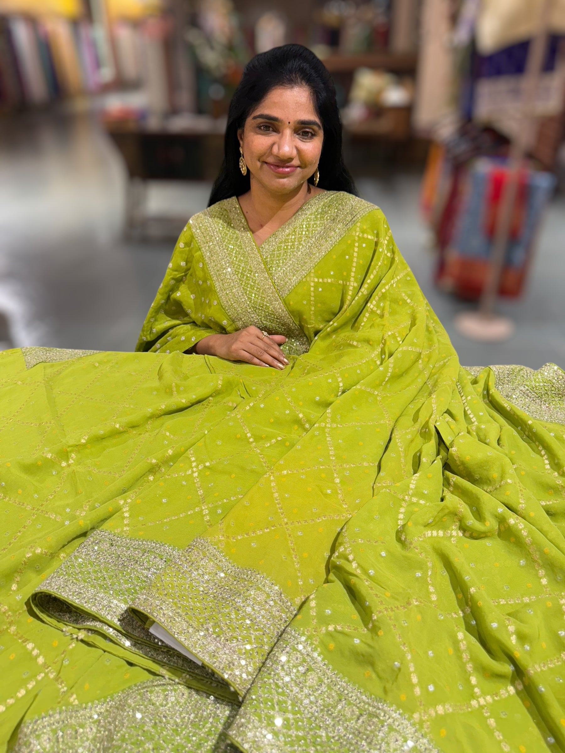 • Parrot Green Fancy Banarasi Bandhini georgette saree with sabhyasachi borders and blouse