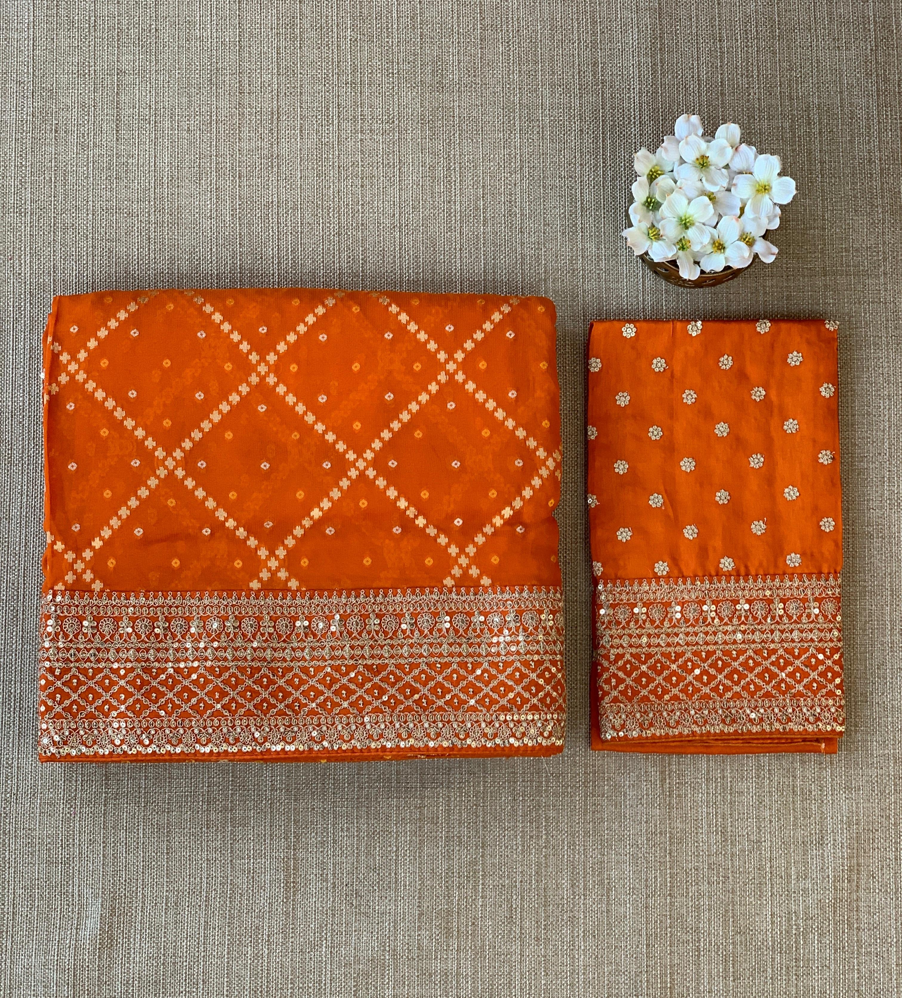 • Orange Fancy Banarasi Bandhini georgette saree with sabhyasachi borders and blouse