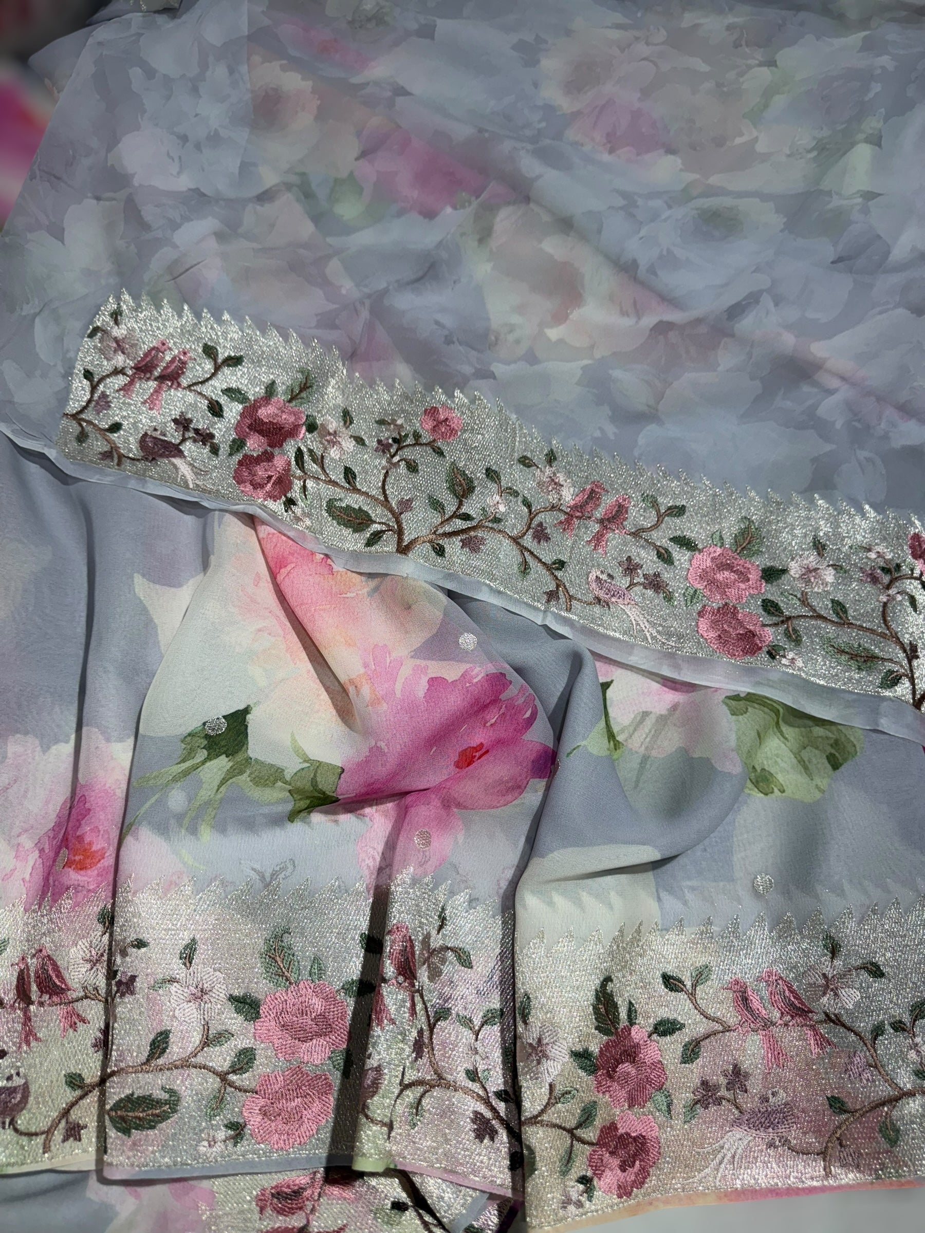 Lilac Printed georgette Saree With Tissue Embroidered Border