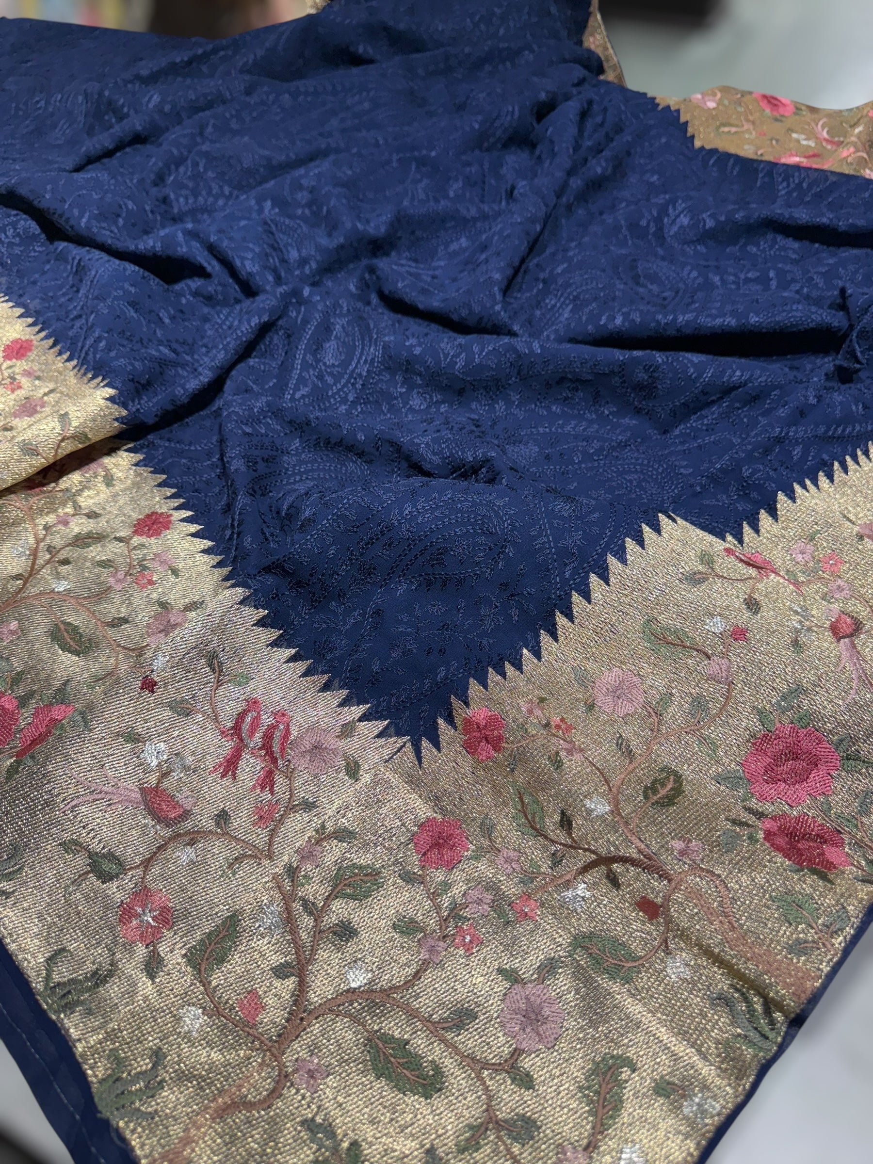 • Midnight Blue Chikankari Georgette Saree with Tissue embroidered Border