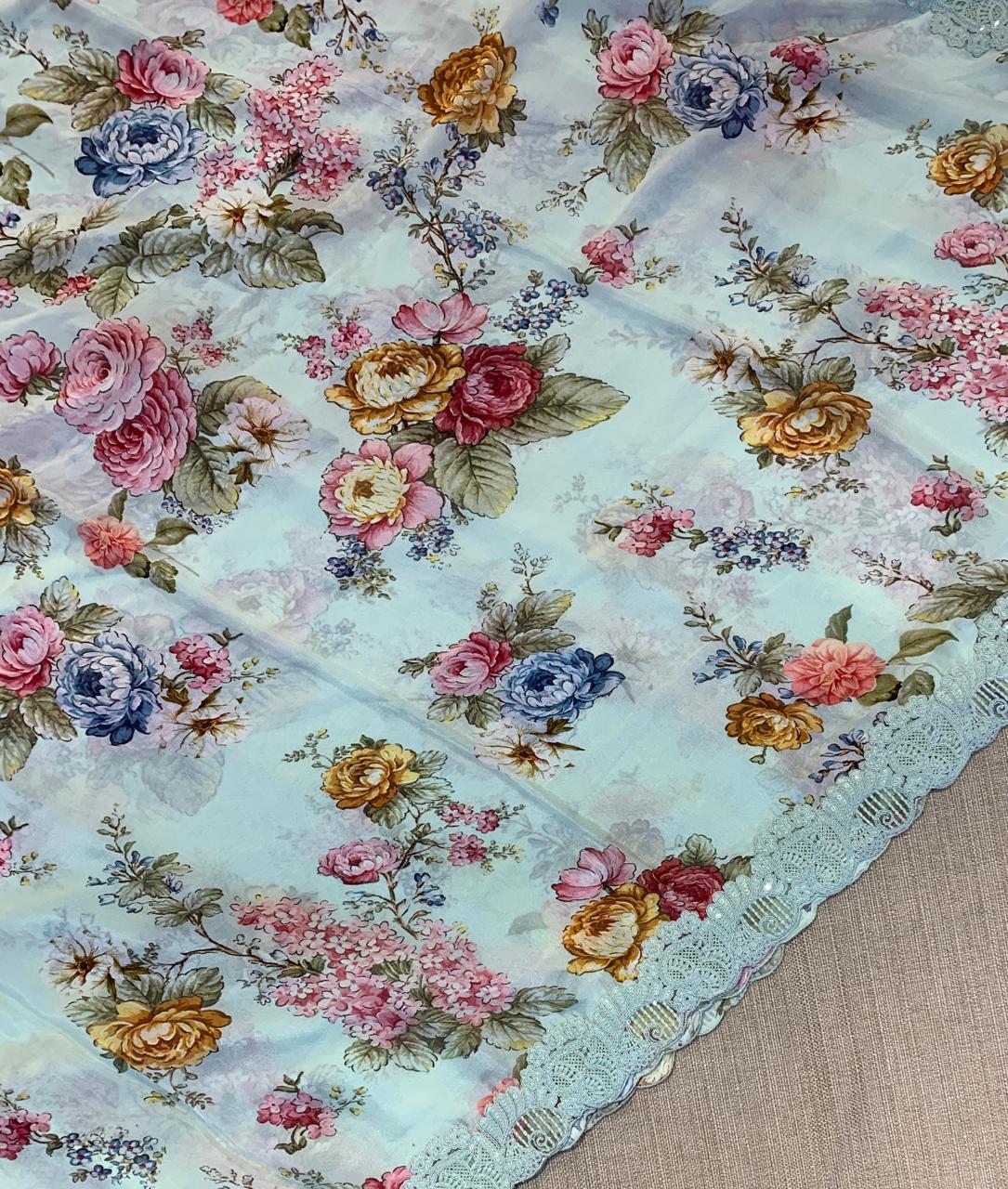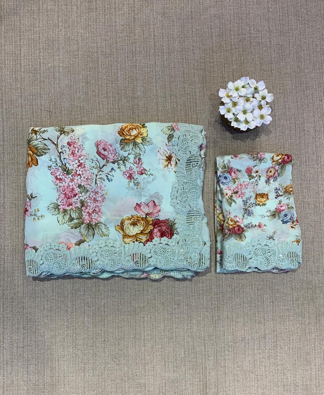 • Mint Green Crepe Silk Gorgette Floral Printed Saree with Cutwork Border