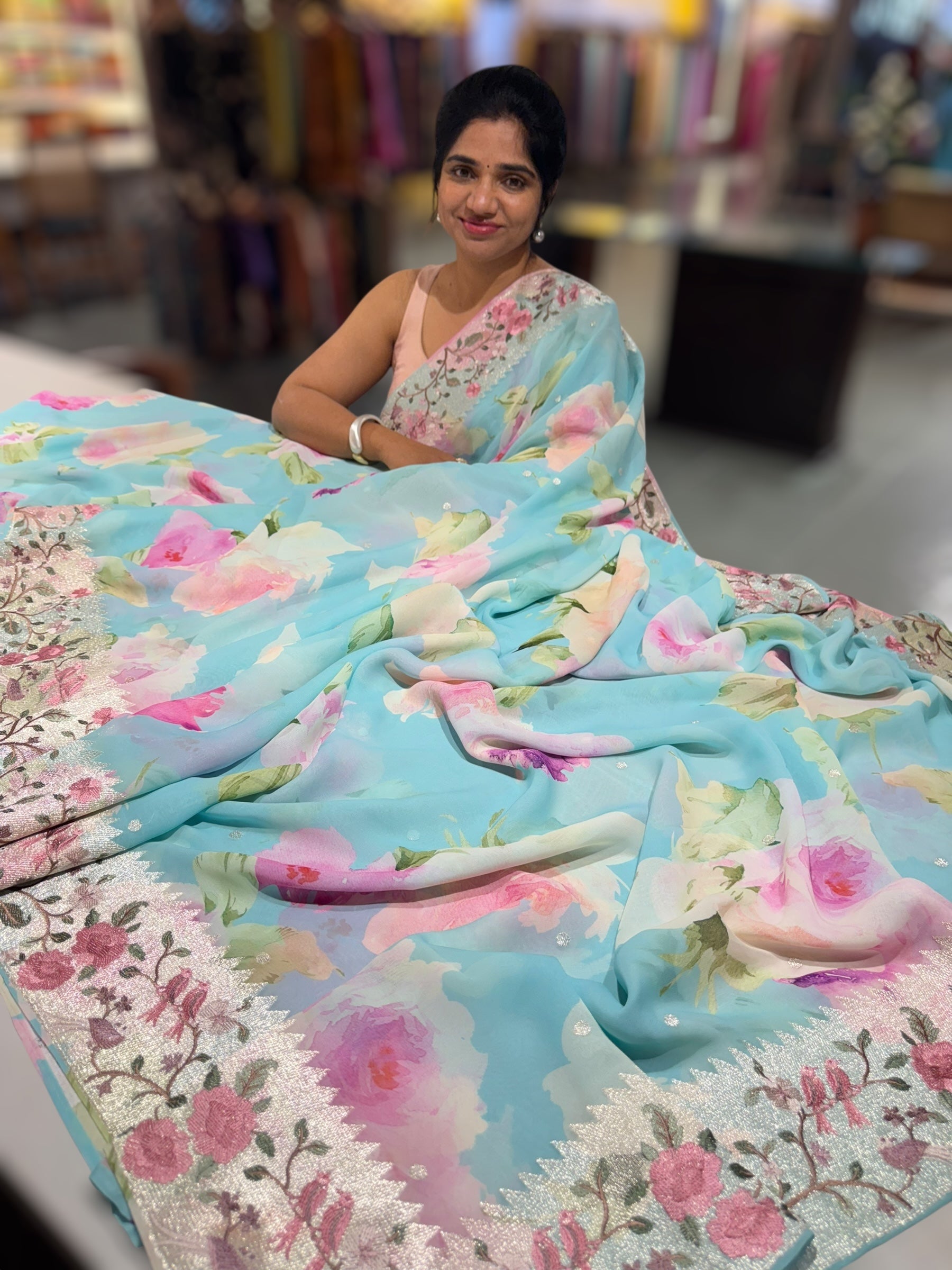 Pastel Blue Printed georgette Saree With Tissue Embroidered Border
