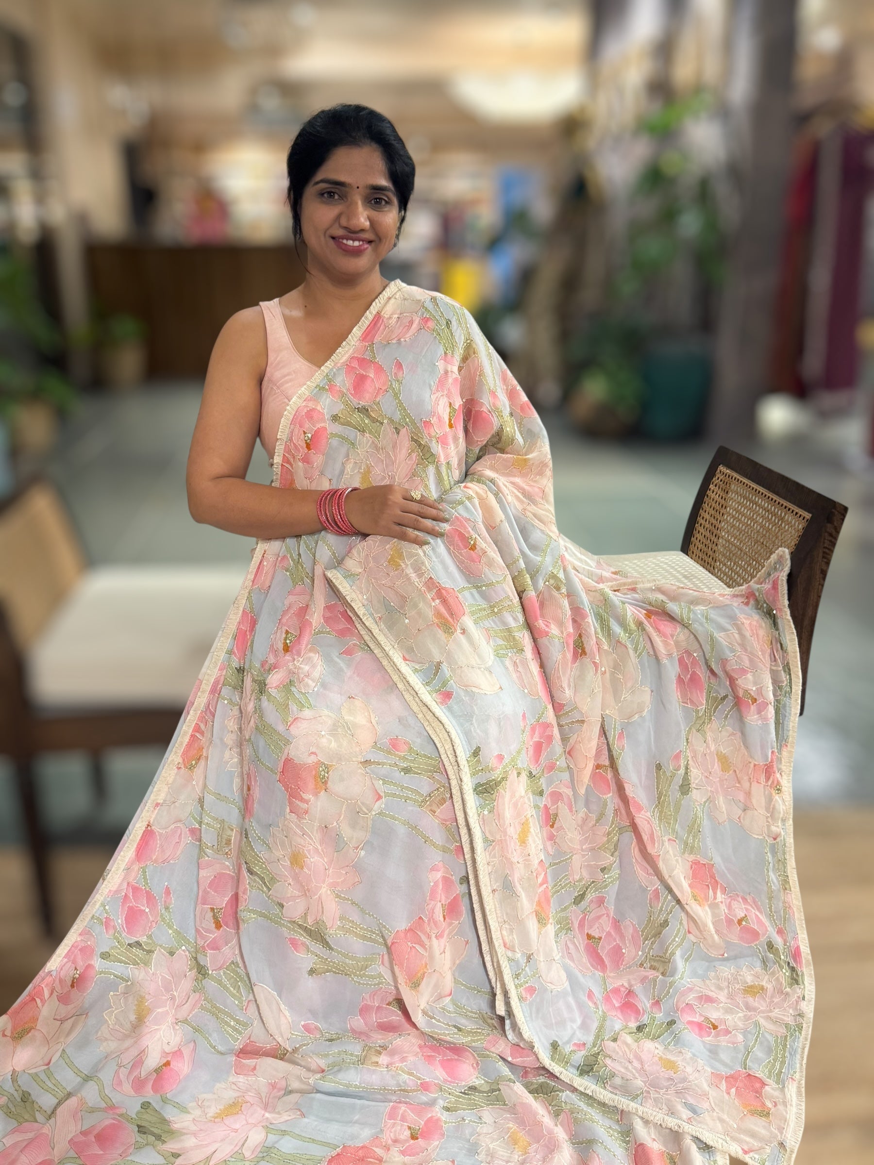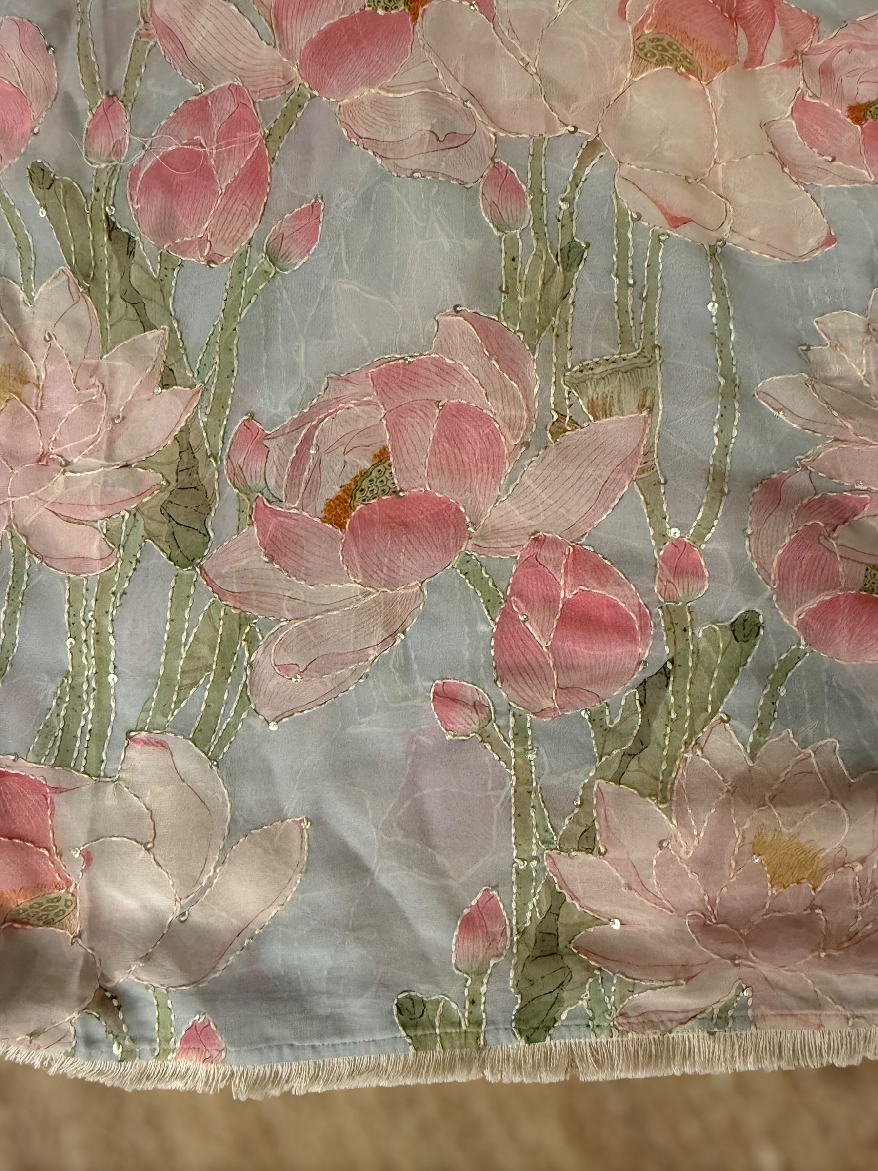 Pastel Pink Pure Gorgette Printed Saree With Allover Hand Done Katha work and sequnce work hemlined with Fringes lace .