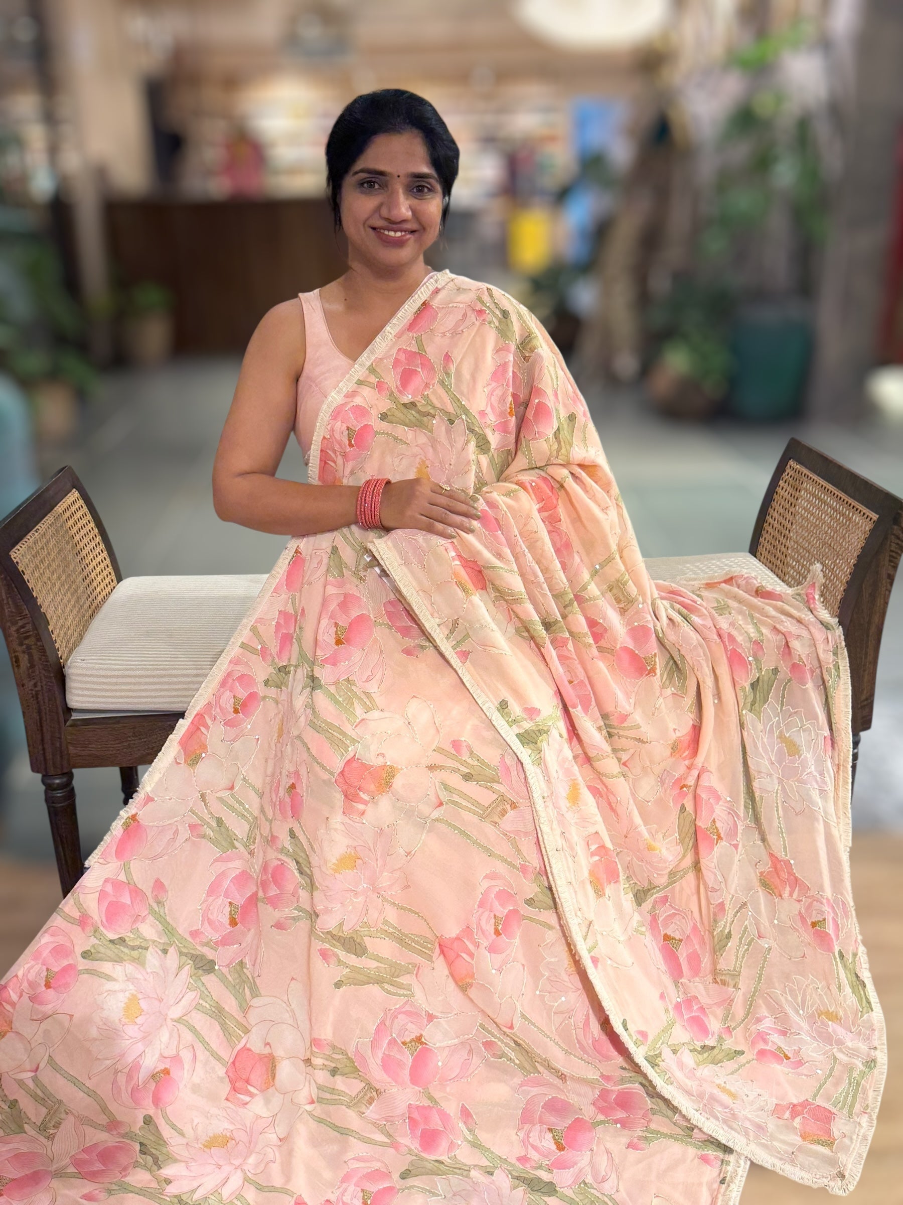 • Peach Pink Pure Gorgette Printed Saree With Allover Hand Done Katha work