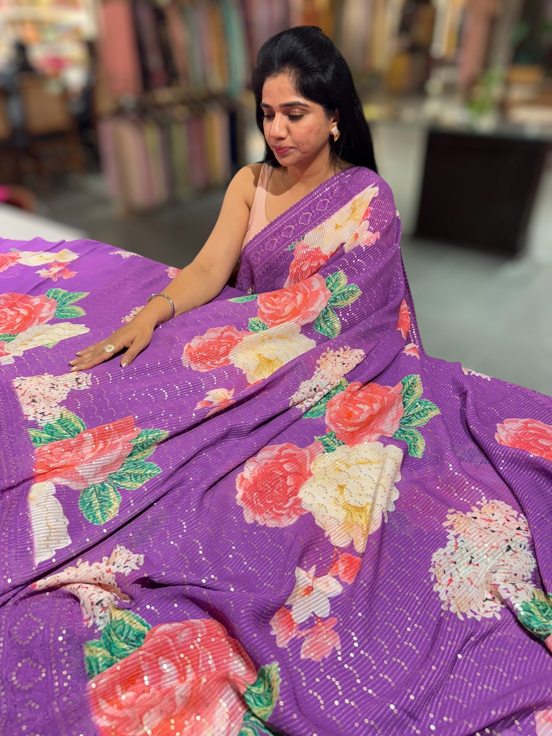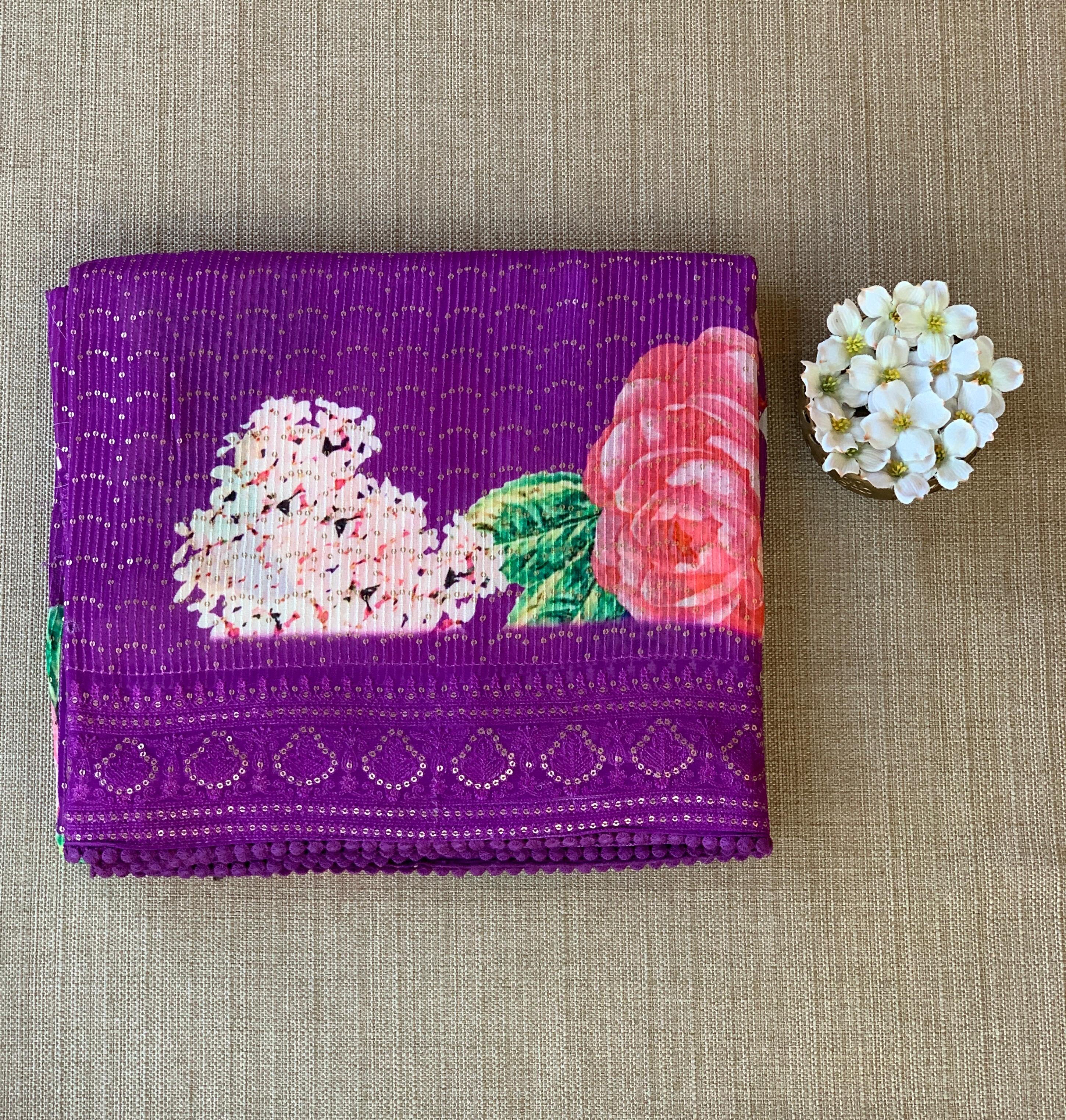 • Purple georgette sequence saree with statement floral print