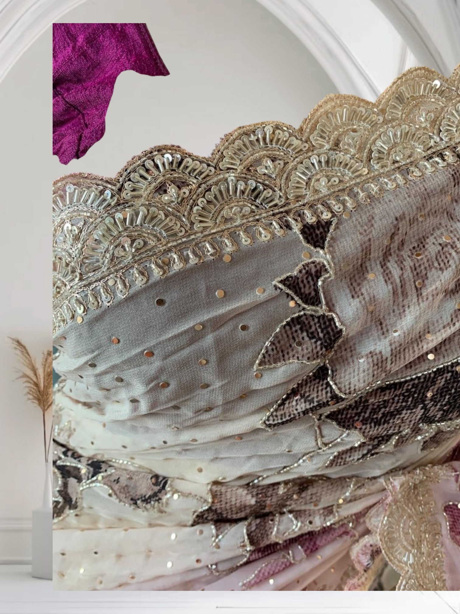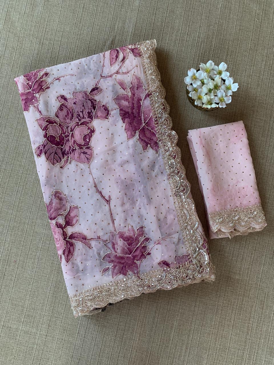 • Shaded Gorgette printed Saree with handwork borders and allover handwork