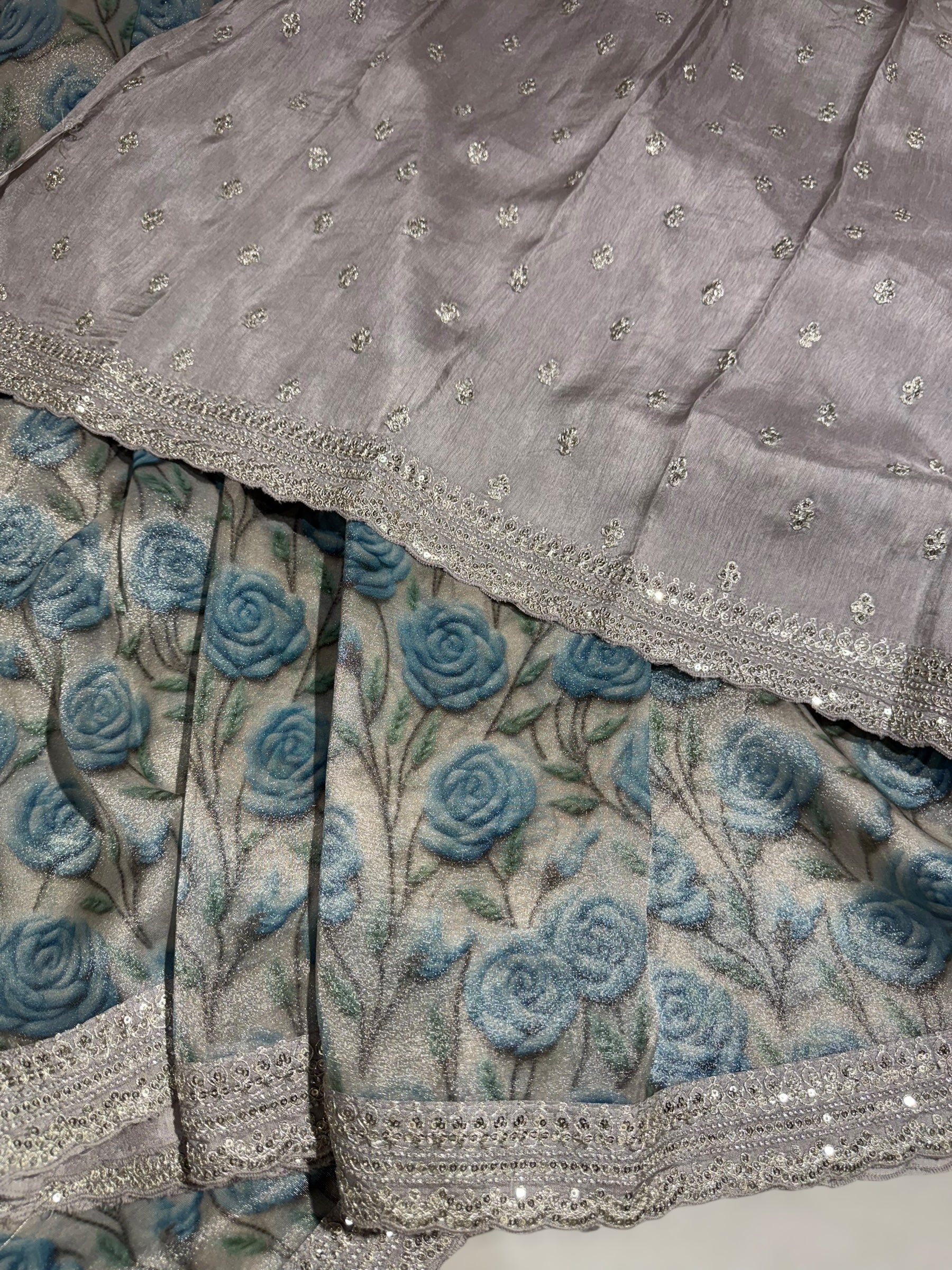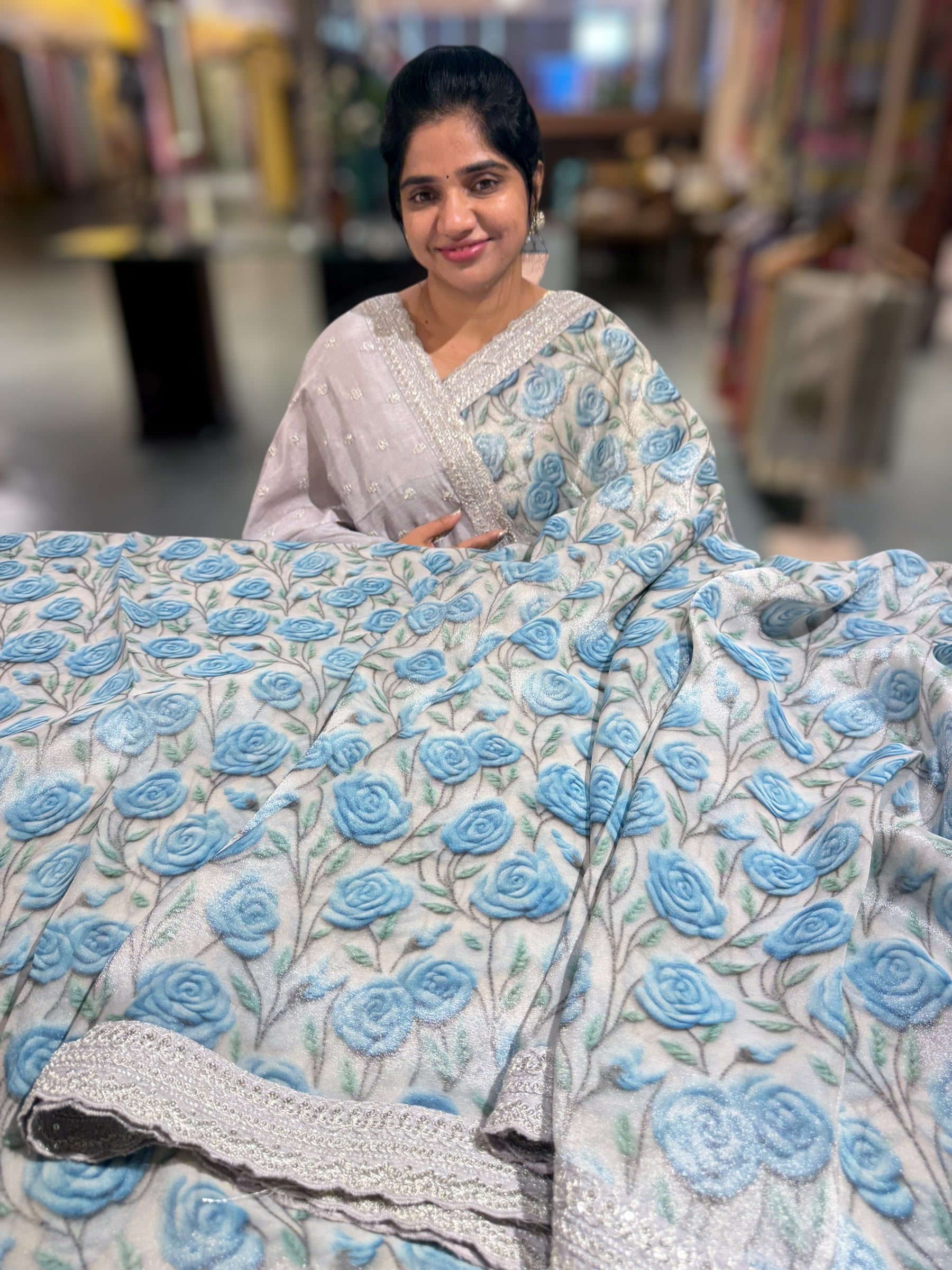 Tissue Georgette Saree With 3D Blue floral print hemlined with sabyasachi borders and paired with falling raw silk blouse with allover sequnce flowers butis and sabhya borders .
