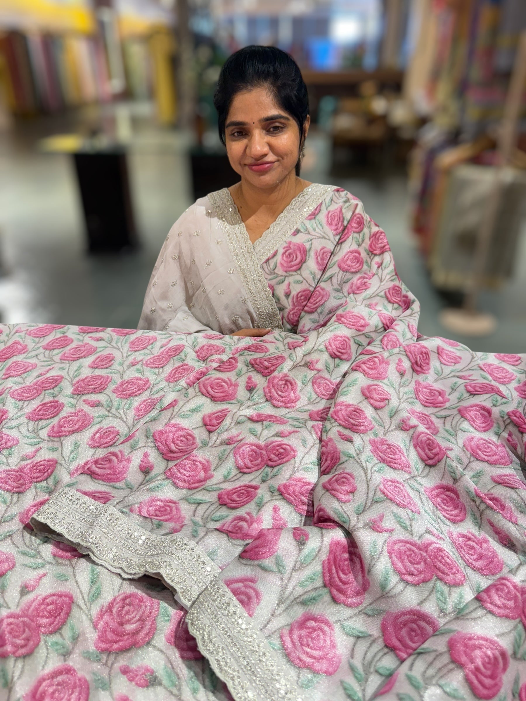Tissue Georgette Saree With 3D floral print hemlined with sabyasachi borders and paired with falling raw silk blouse with allover sequnce flowers butis and sabhya borders .