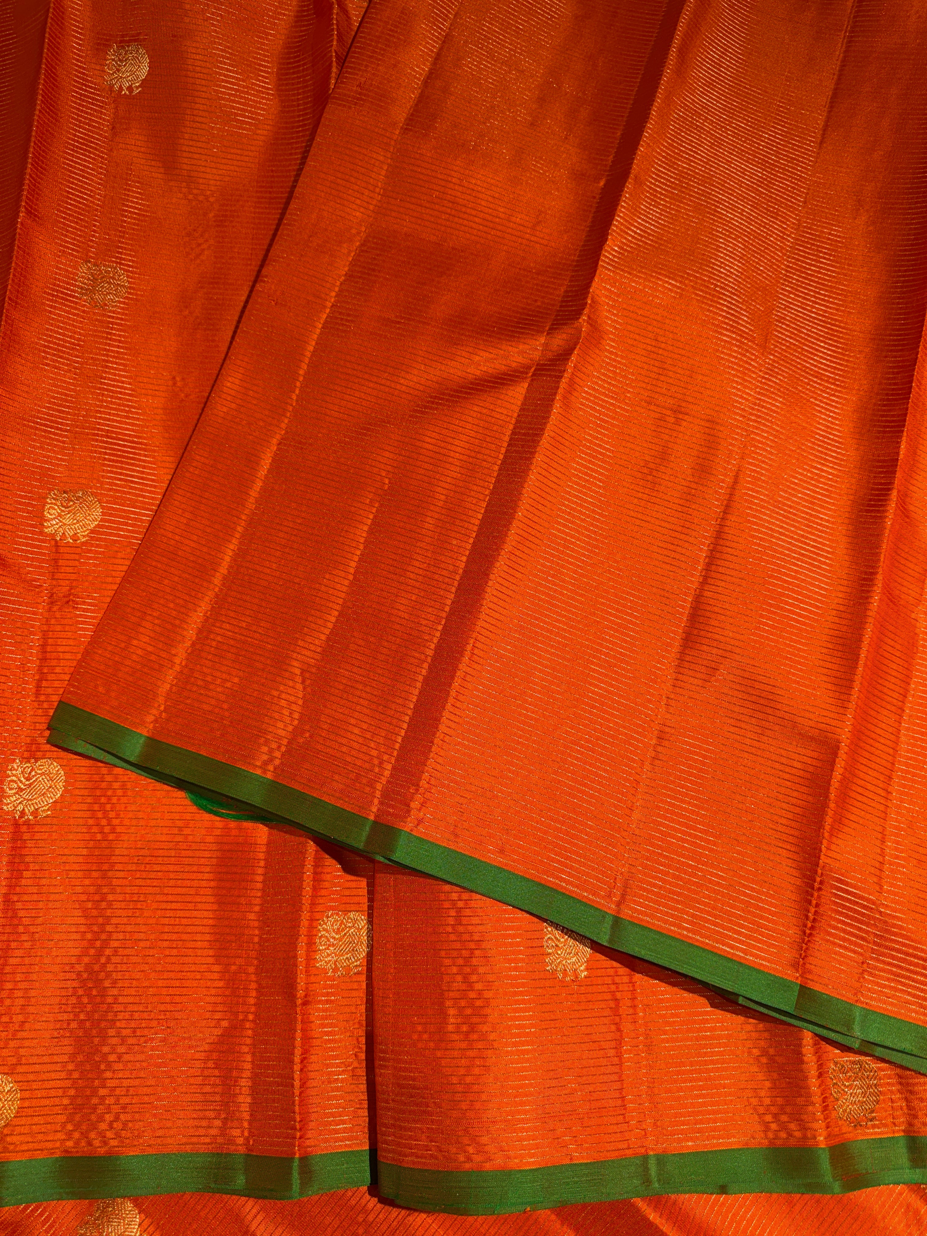 A vibrant orange Kanjeevaram silk saree beautifully woven with elegant vaira oosi stripes across the body. The saree is highlighted with a striking parrot green selvedge that adds a fresh contrast. Delicate peacock motifs woven all over the saree enhance its traditional charm, making it a perfect choice for weddings, festive celebrations, and special occasions.